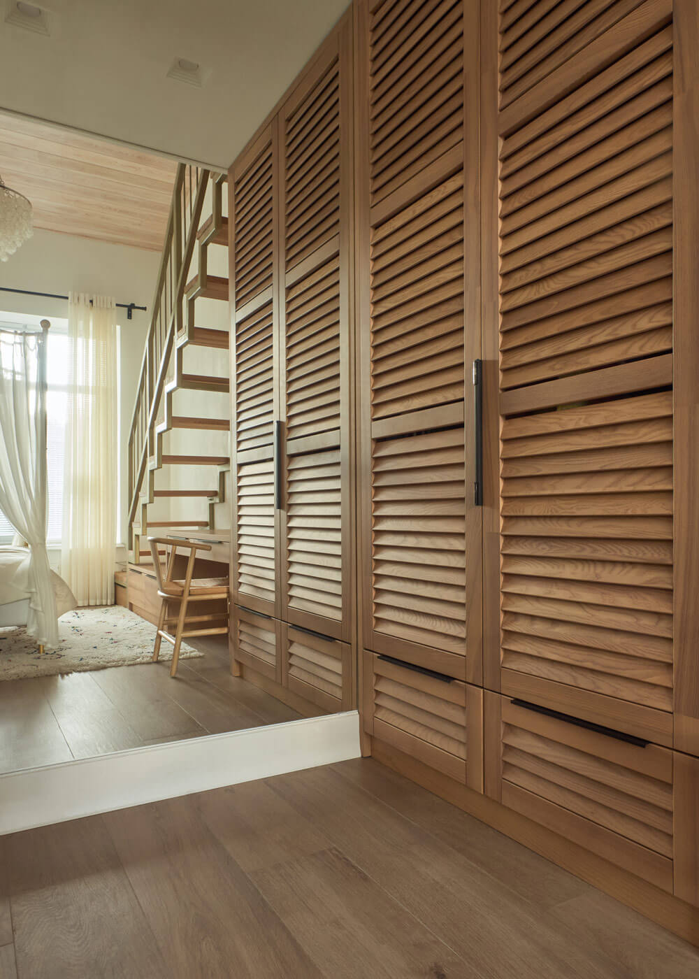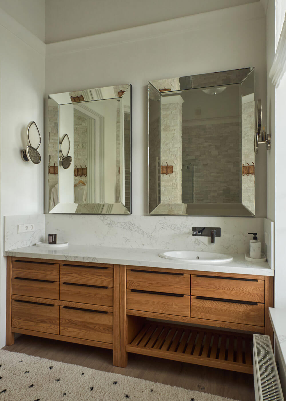 Особое внимание уделено интеграции архитектурных элементов в интерьер. Вытянутые оконные проёмы в спальнях формируют ритмическую структуру фасадов и одновременно служат системе естественного освещения. Подоконники-консоли высотой 500 мм выполняют практическую функцию и заменяют традиционные прикроватные тумбы.