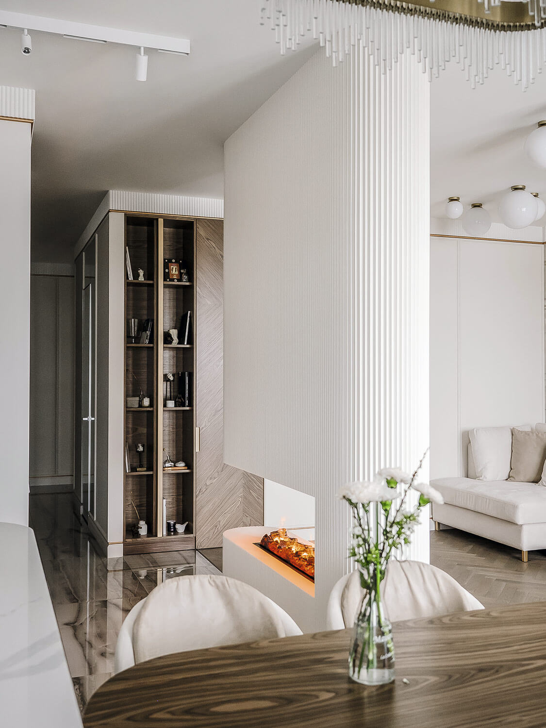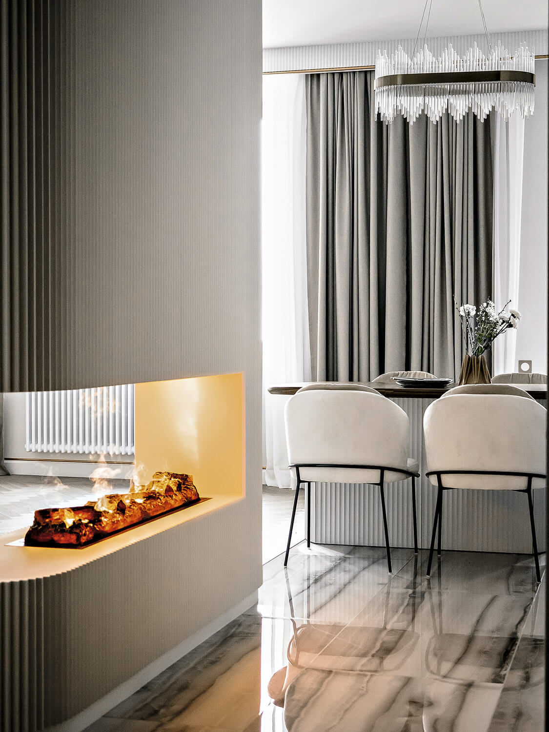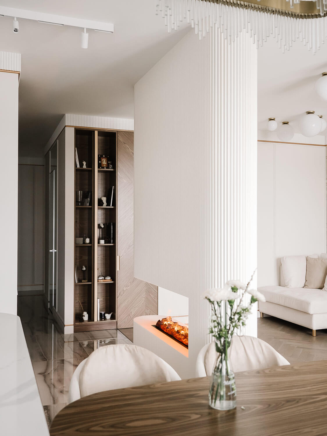 Проект автор назвала Timeless. Так как в отделке использовали преимущественно фактуры дерева и камня, интерьер будет актуален долгое время. Самый интересный архитектурный элемент в проекте — конструкция из гипсокартона, облицованная 3D-панелями и установленная в гостиной-кухне. Она выполняет сразу несколько функций: как колонна зонирует пространство, в нее встроен электрокамин с паром, который хорошо просматривается со всех точек, а также она играет роль телевизионной зоны. Паровой камин с эффектом живого огня безопасен в доме, где есть дети. Кроме того, у него есть функция увлажнителя воздуха.