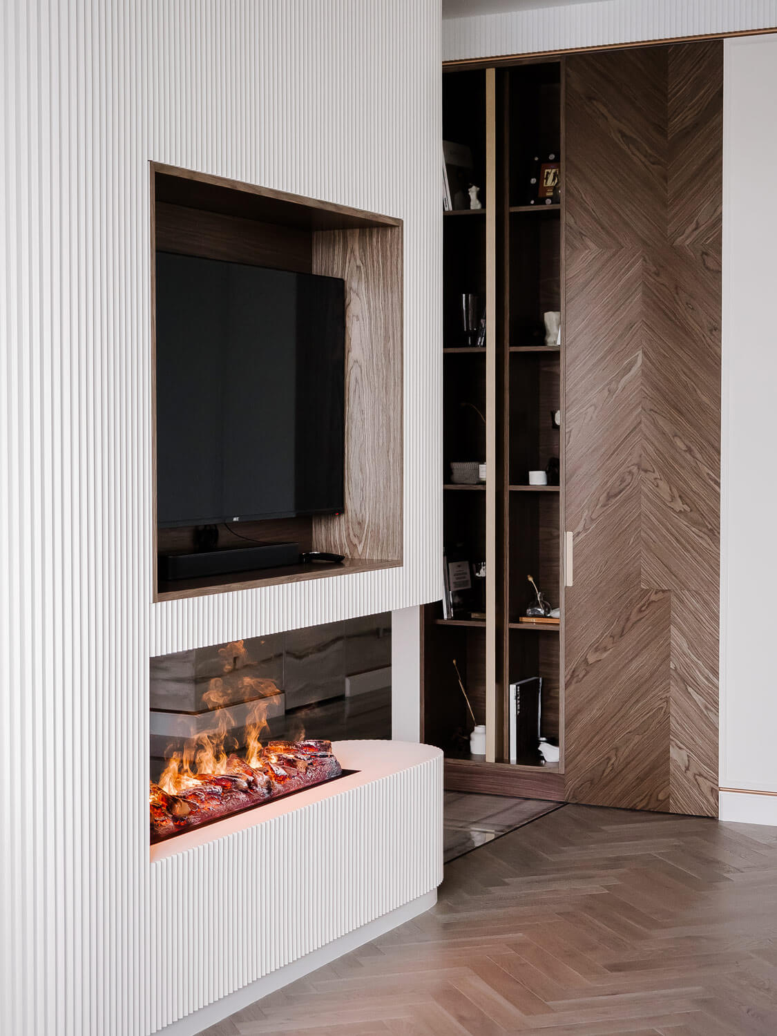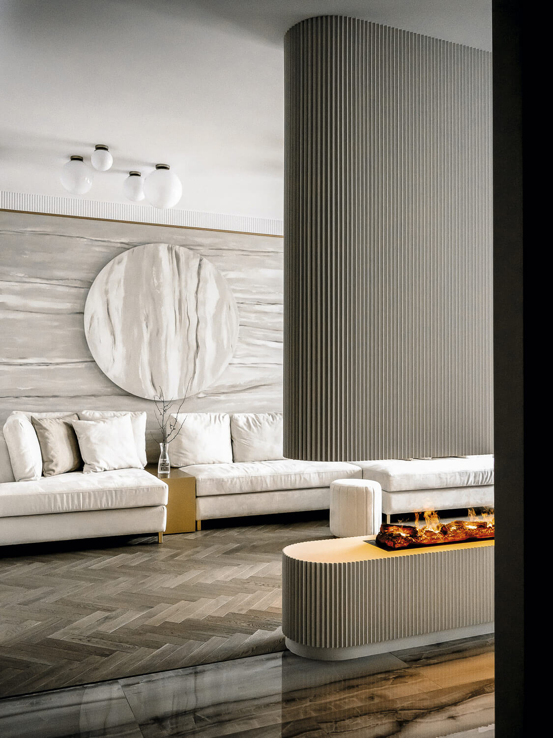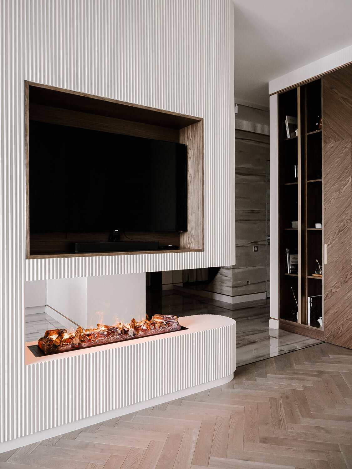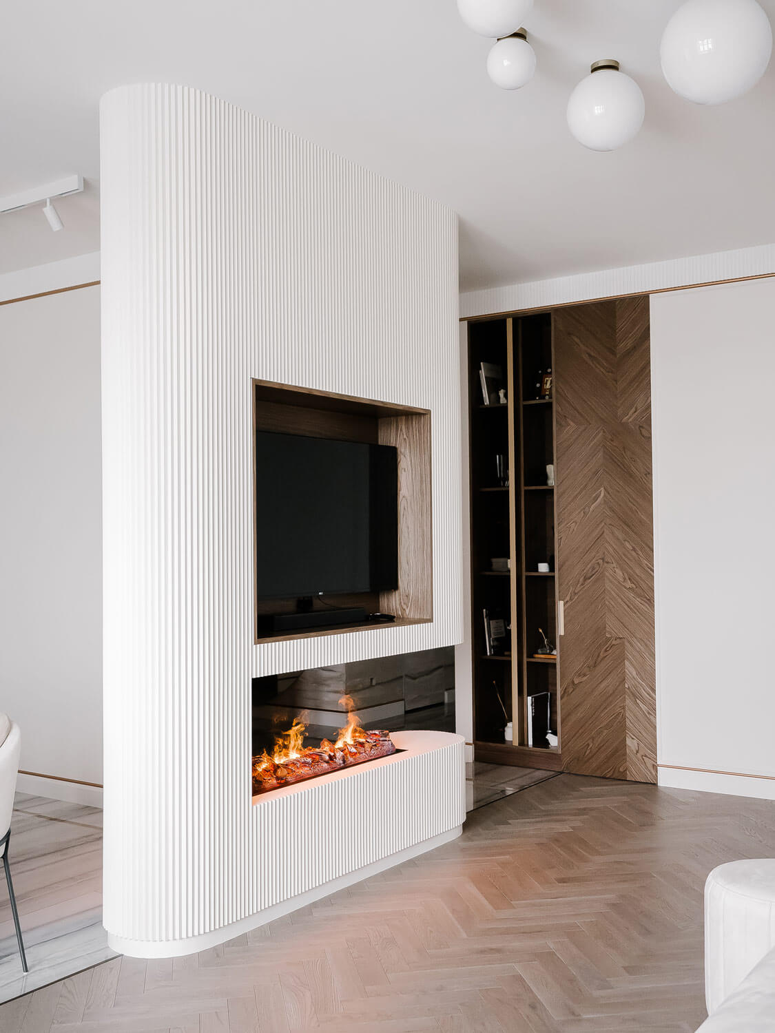 Проект автор назвала Timeless. Так как в отделке использовали преимущественно фактуры дерева и камня, интерьер будет актуален долгое время. Самый интересный архитектурный элемент в проекте — конструкция из гипсокартона, облицованная 3D-панелями и установленная в гостиной-кухне. Она выполняет сразу несколько функций: как колонна зонирует пространство, в нее встроен электрокамин с паром, который хорошо просматривается со всех точек, а также она играет роль телевизионной зоны. Паровой камин с эффектом живого огня безопасен в доме, где есть дети. Кроме того, у него есть функция увлажнителя воздуха.