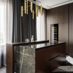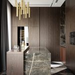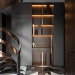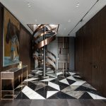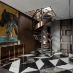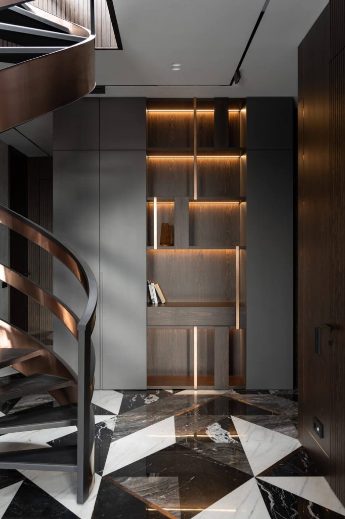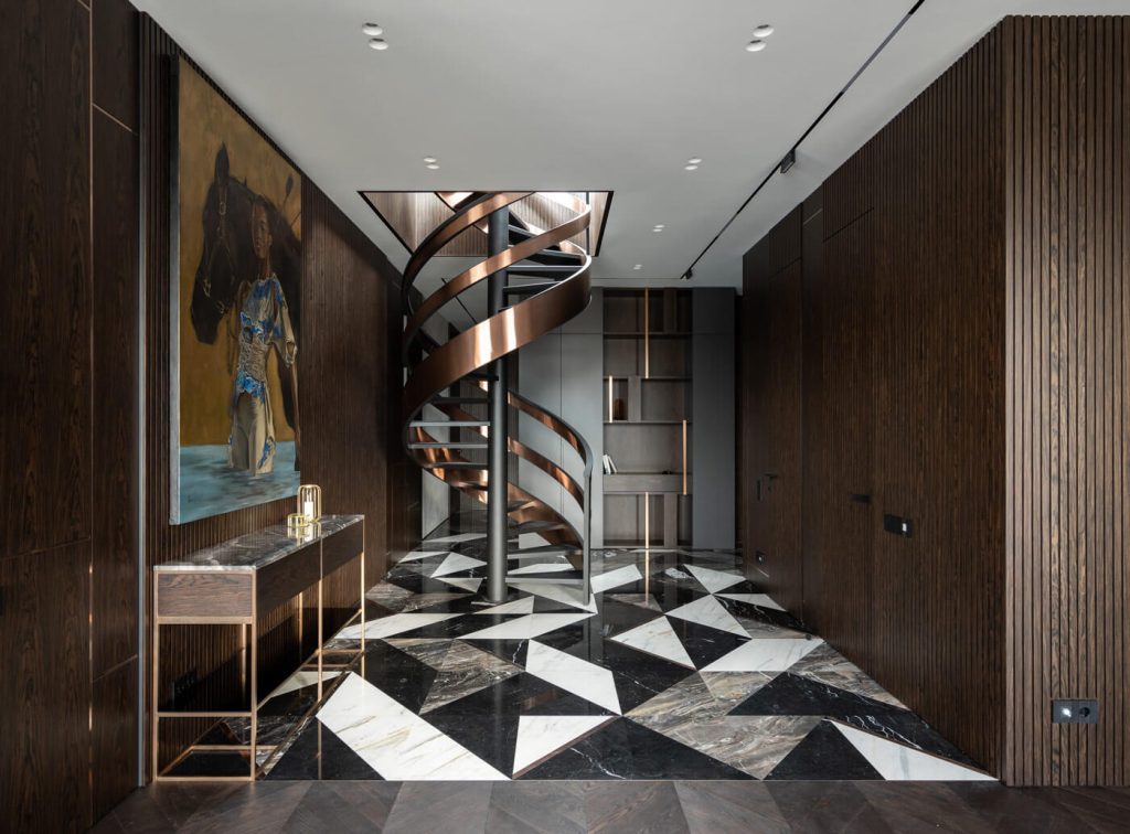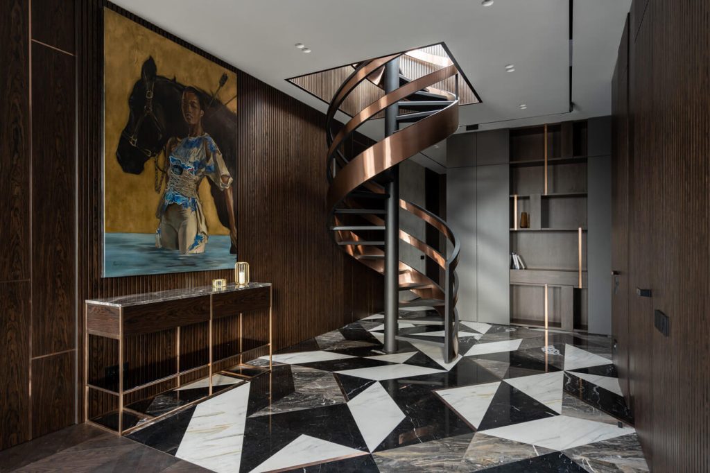 Центральным элементом стало не только архитектурное, но и смысловое ядро проекта — винтовая лестница, идеально вписанная в ограниченное пространство. Облицованная листами с медным покрытием, она перекликается с напольной отделкой, где медные вставки интегрированы в натуральный мрамор трёх оттенков. Игра текстур становится ритмом всего интерьера.