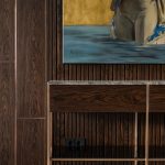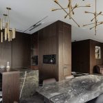 Интерьер — тёмный, почти брутальный, но не мрачный. Это пространство силы, в котором нет места визуальному шуму. Каждый элемент — от текстуры стен до работ художника Константина Фёдорова — занимает своё место. Эта квартира — не просто уютное пространство, а точка опоры, где тишина становится внутренним ресурсом, а натуральные материалы возвращают устойчивость в стремительном мире.