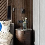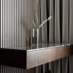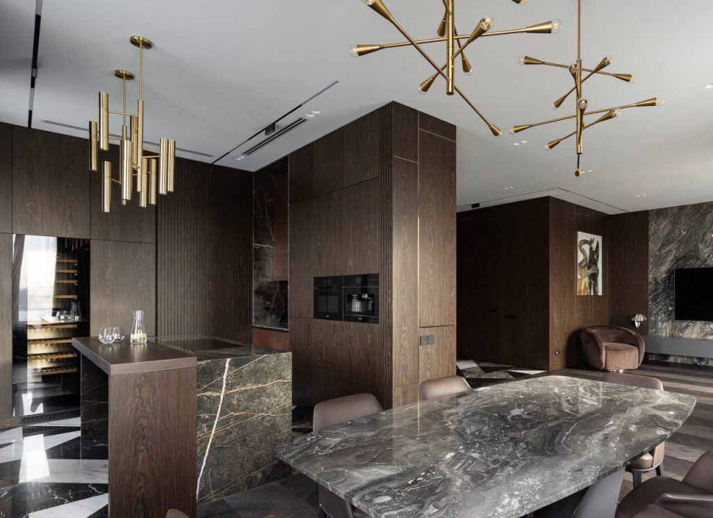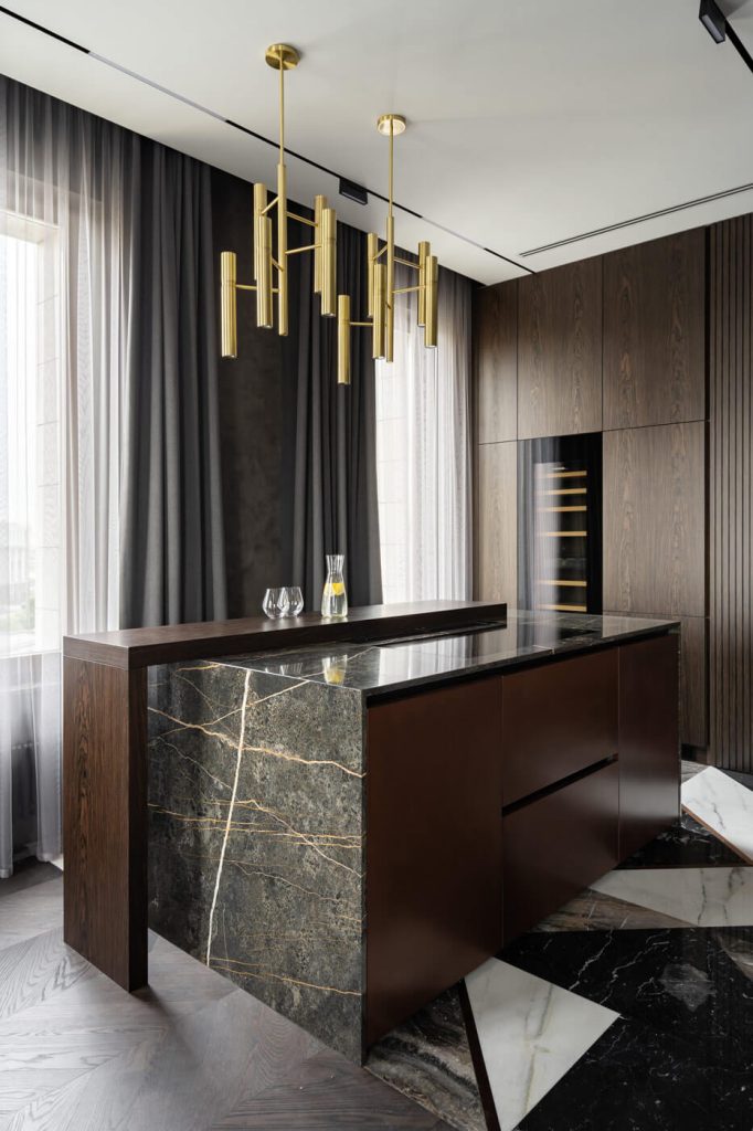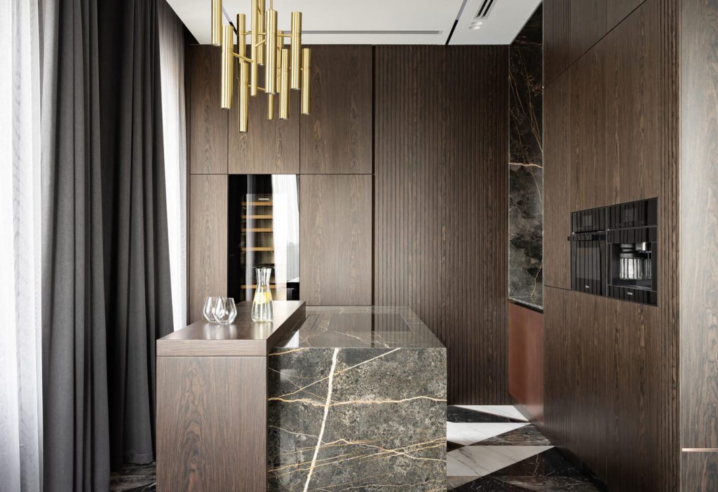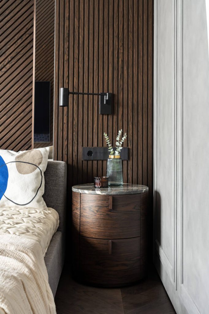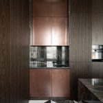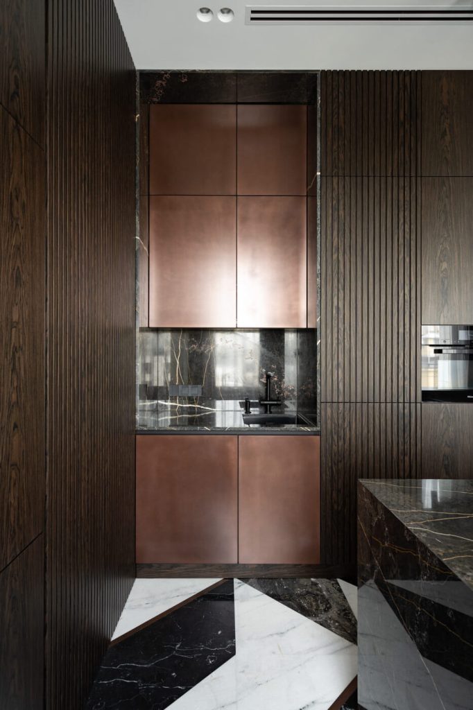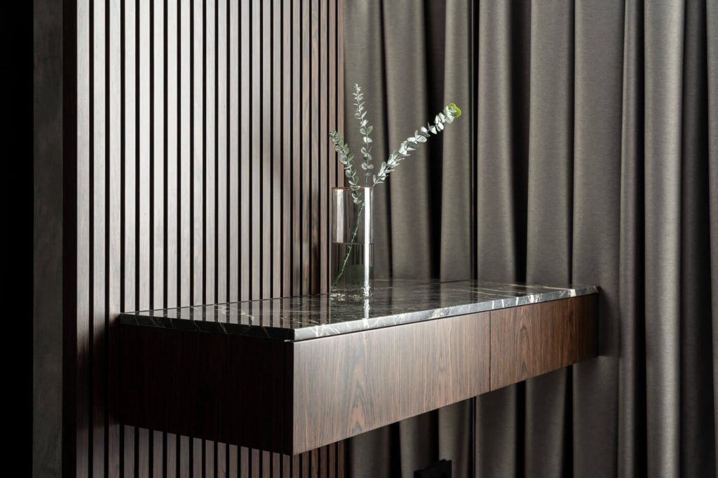 По периметру квартиры стены оформлены панелями из тонированного ореха: строгие плоскости чередуются с реечными структурами, создавая объём и глубину. Медные акценты тонко подчеркивают геометрию. Здесь нет случайных деталей — каждое мебельное решение реализовано в полном соответствии с дизайнерскими визуализациями, представленными заказчику на старте проекта.