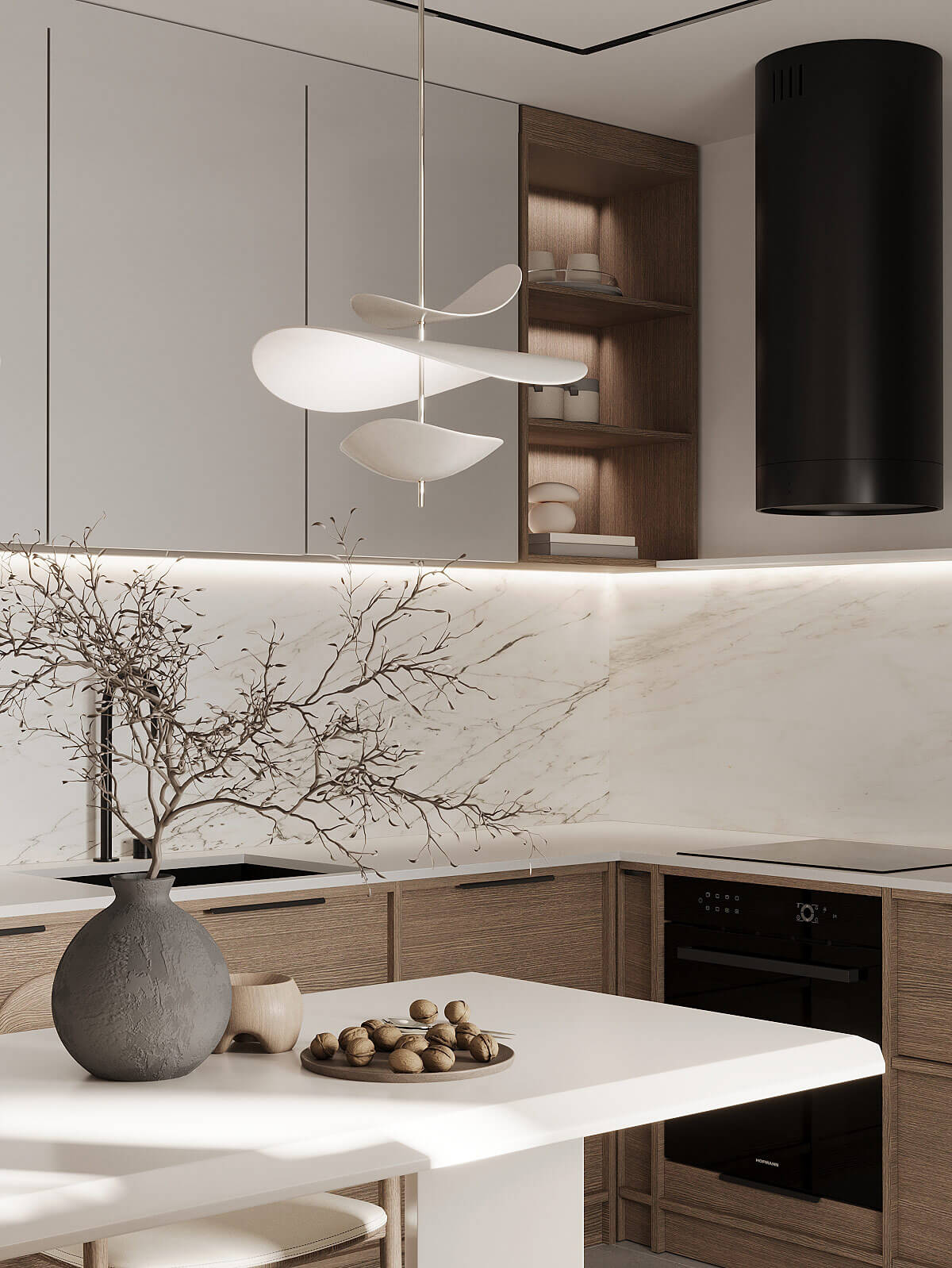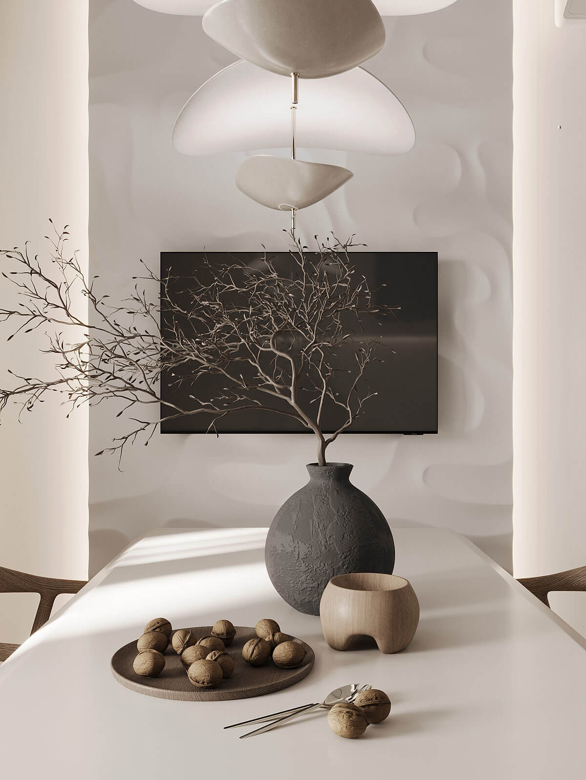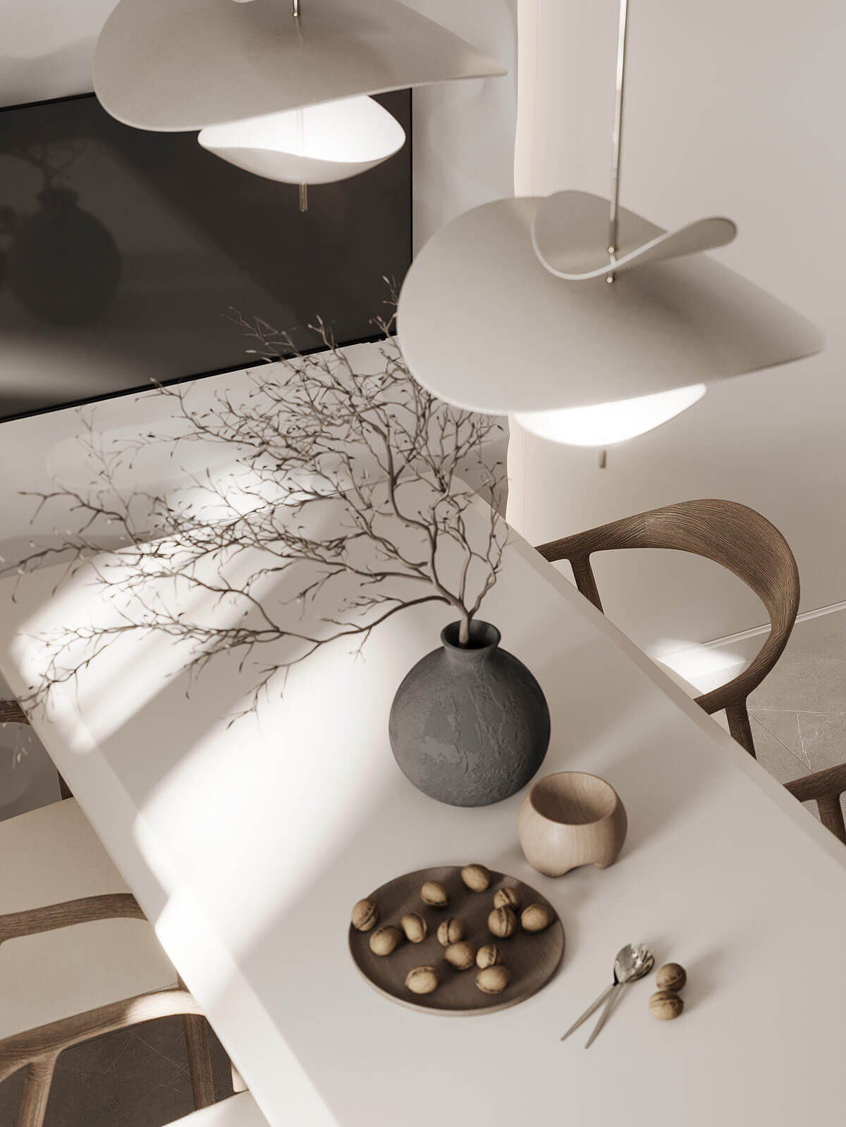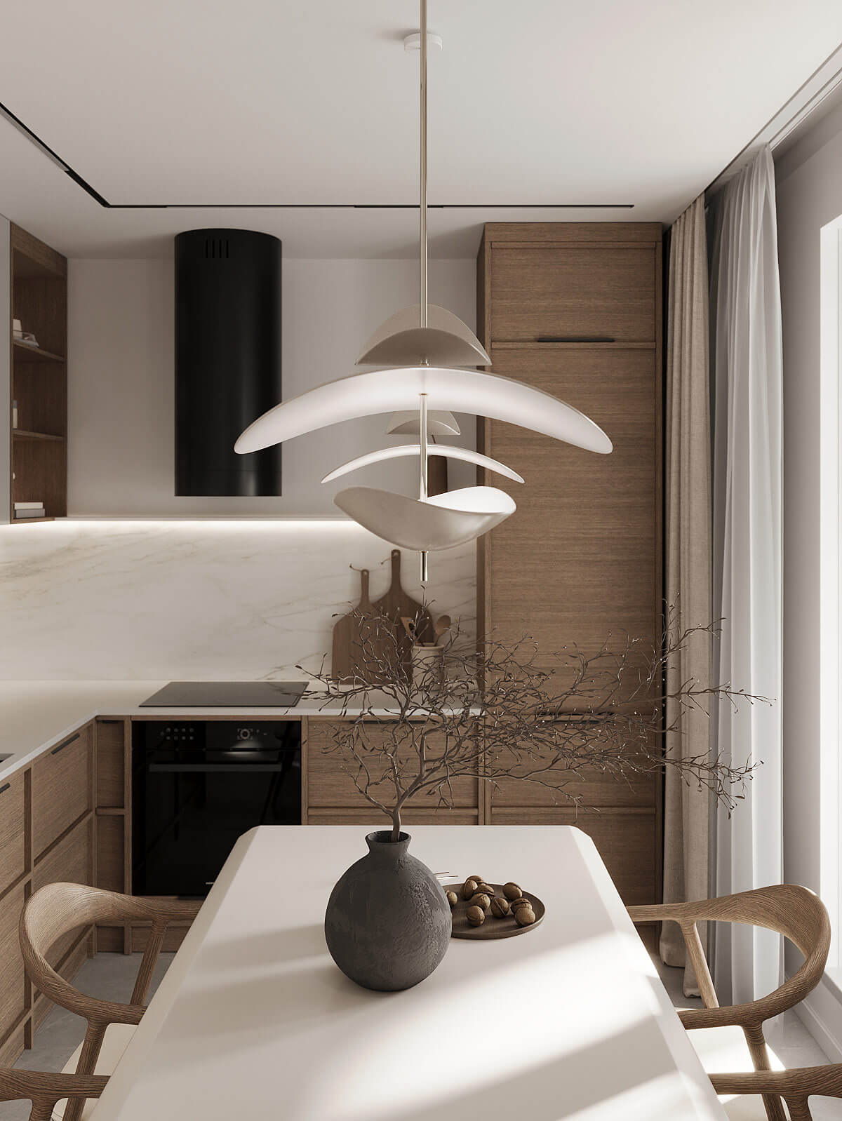 Использование в интерьере природных материалов (дерева, камня и текстиля) добавляет интерьеру тепла и уюта. А простые формы и отсутствие лишних деталей создают ощущение порядка. И только лишь акцентный светильник с плавными формами, будто парящий над обеденным столом, добавляет интерьеру визуального интереса, вытягивая интерьер из монотонности и придавая ему легкий шарм.