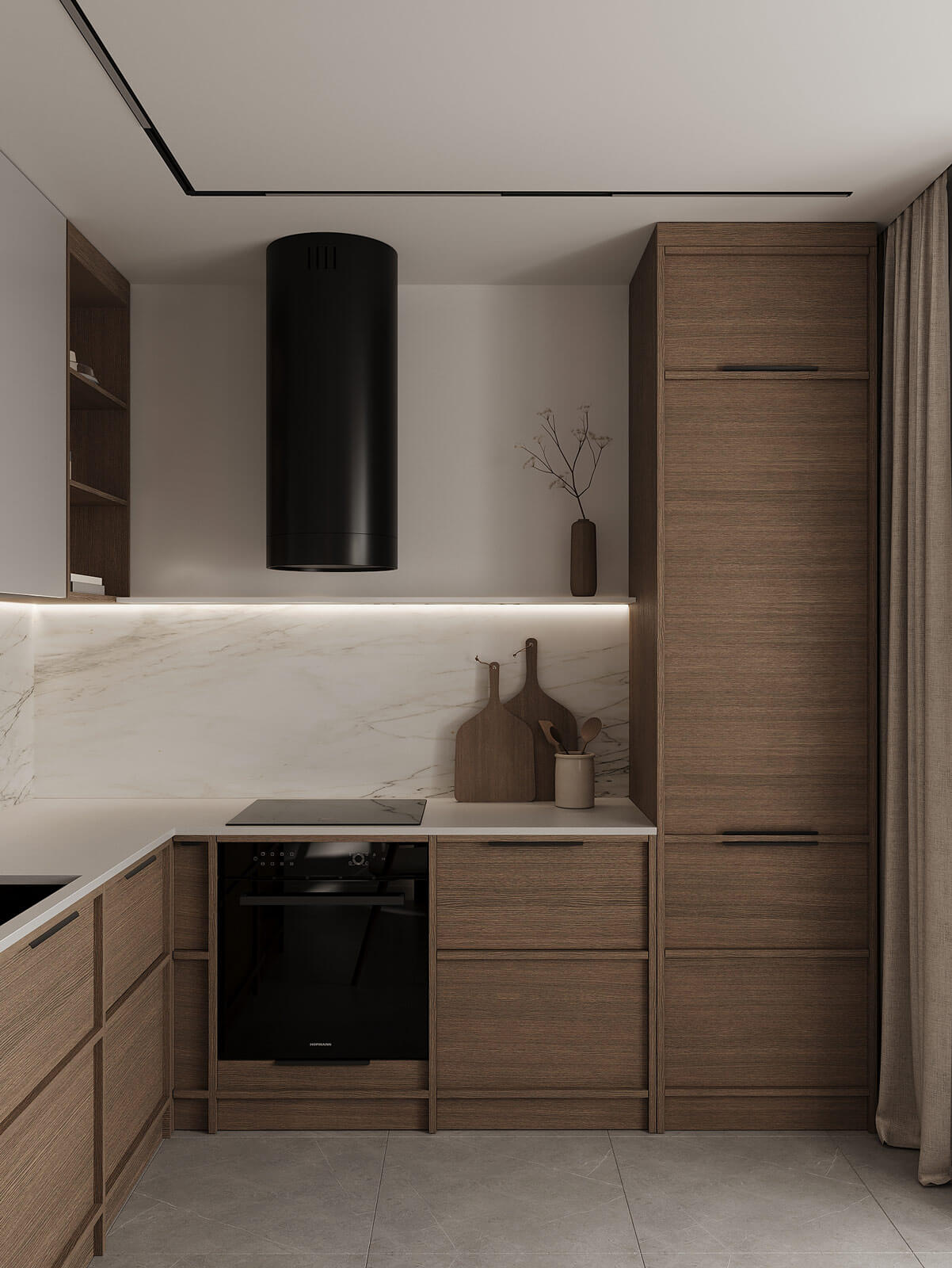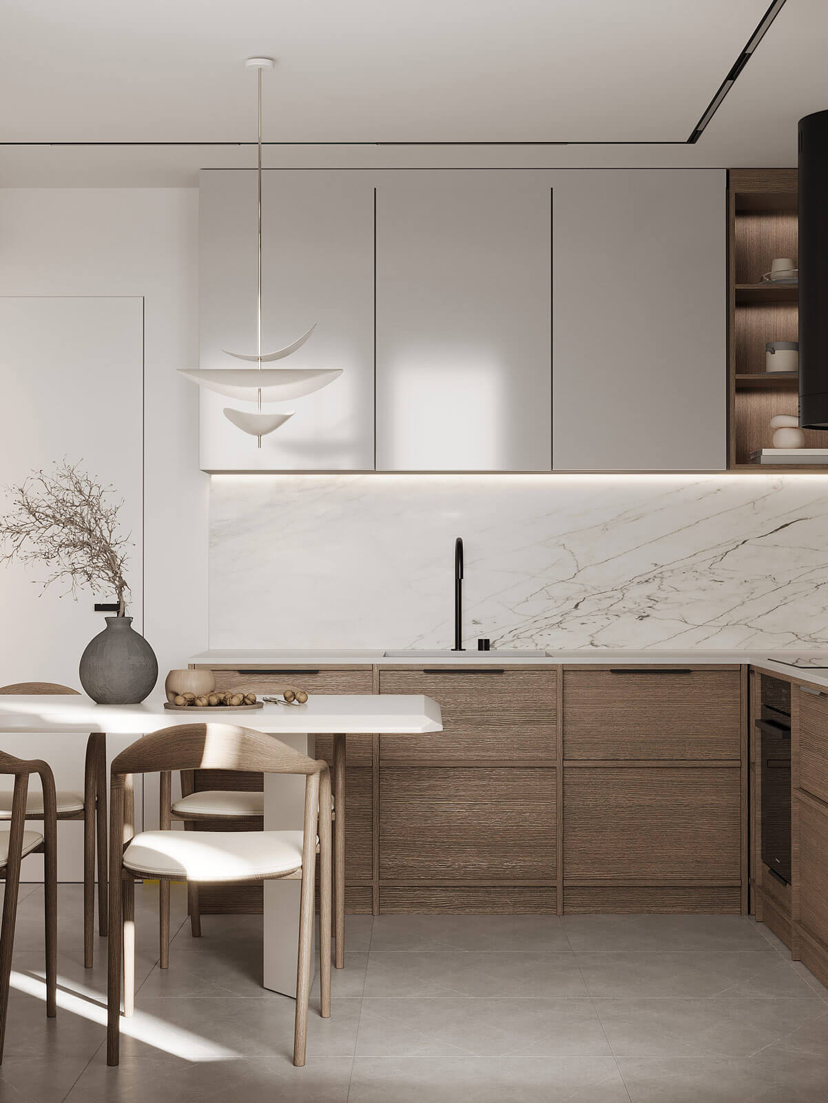 Главная задача – создать минималистичный дизайн для небольшой кухни (10 кв.м.), пропитанный атмосферой спокойствия и гармонии.