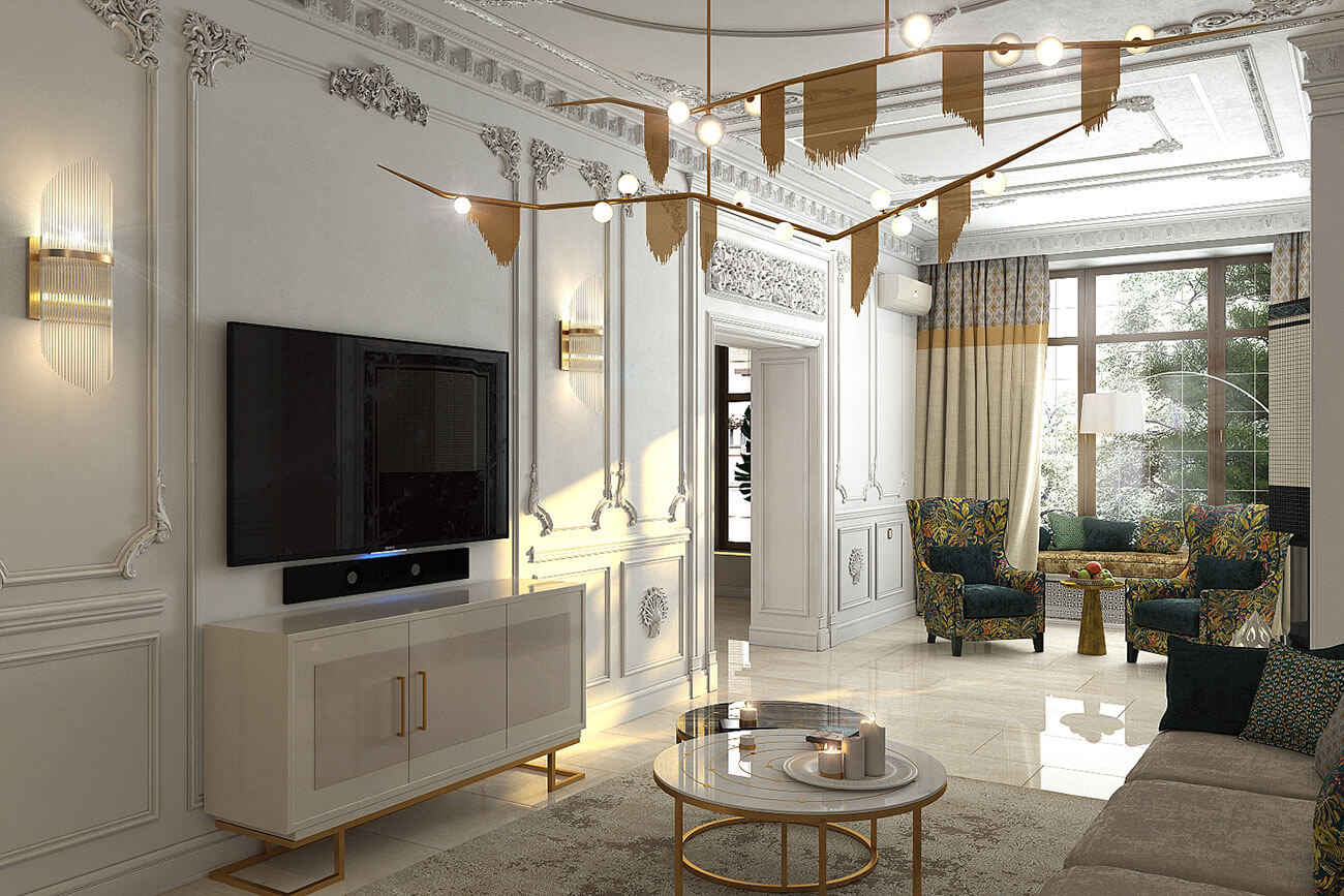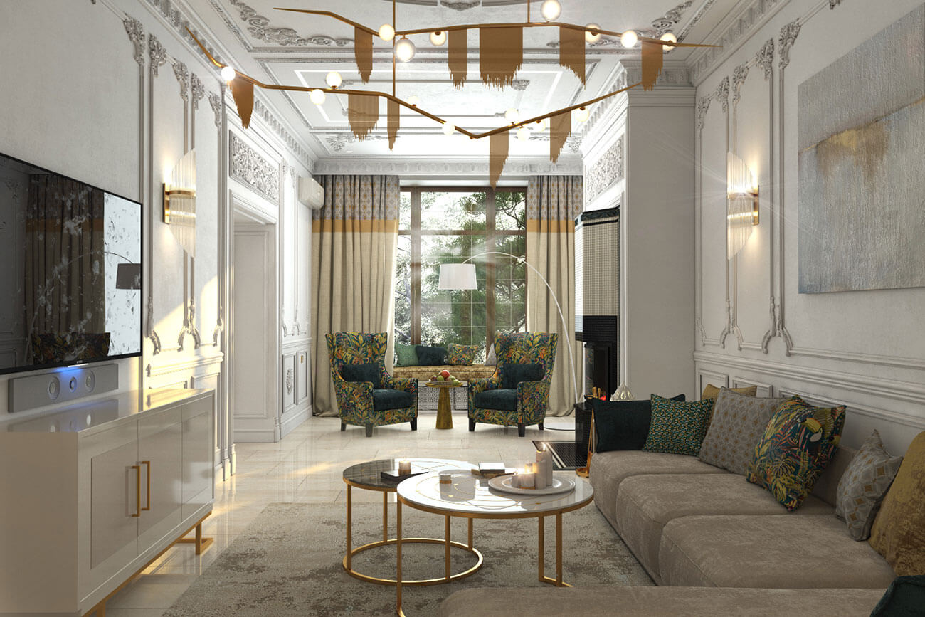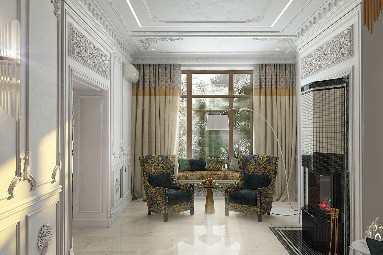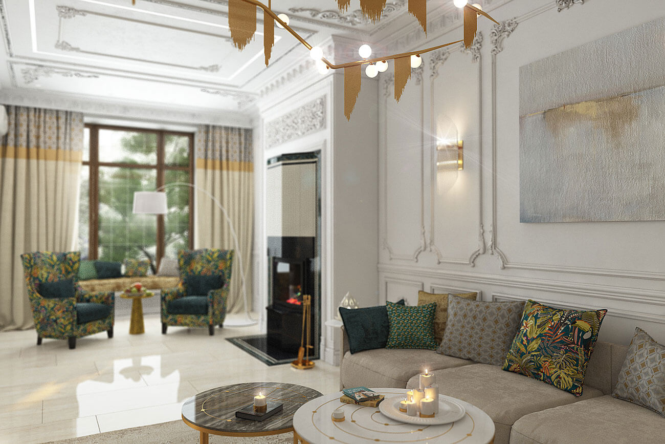 Главной концепцией этого проекта является союз, казалось бы, несочетаемых вещей: классического лепного декора на стенах и потолке и тропических орнаментов в современной интерпретации, присутствующих в настенном панно и текстильном оформлении. Но благодаря разнообразию интересных деталей и аксессуаров, предметов мебели и светильников, цветовому решению всего интерьера и габаритам помещения — довольно большие высота потолка и площадь комнаты — все в целом смотрится очень стильно и гармонично, а шикарная каминная зона с двумя креслами и кофейным столиком создает в гостиной атмосферу уюта и благоденствия.