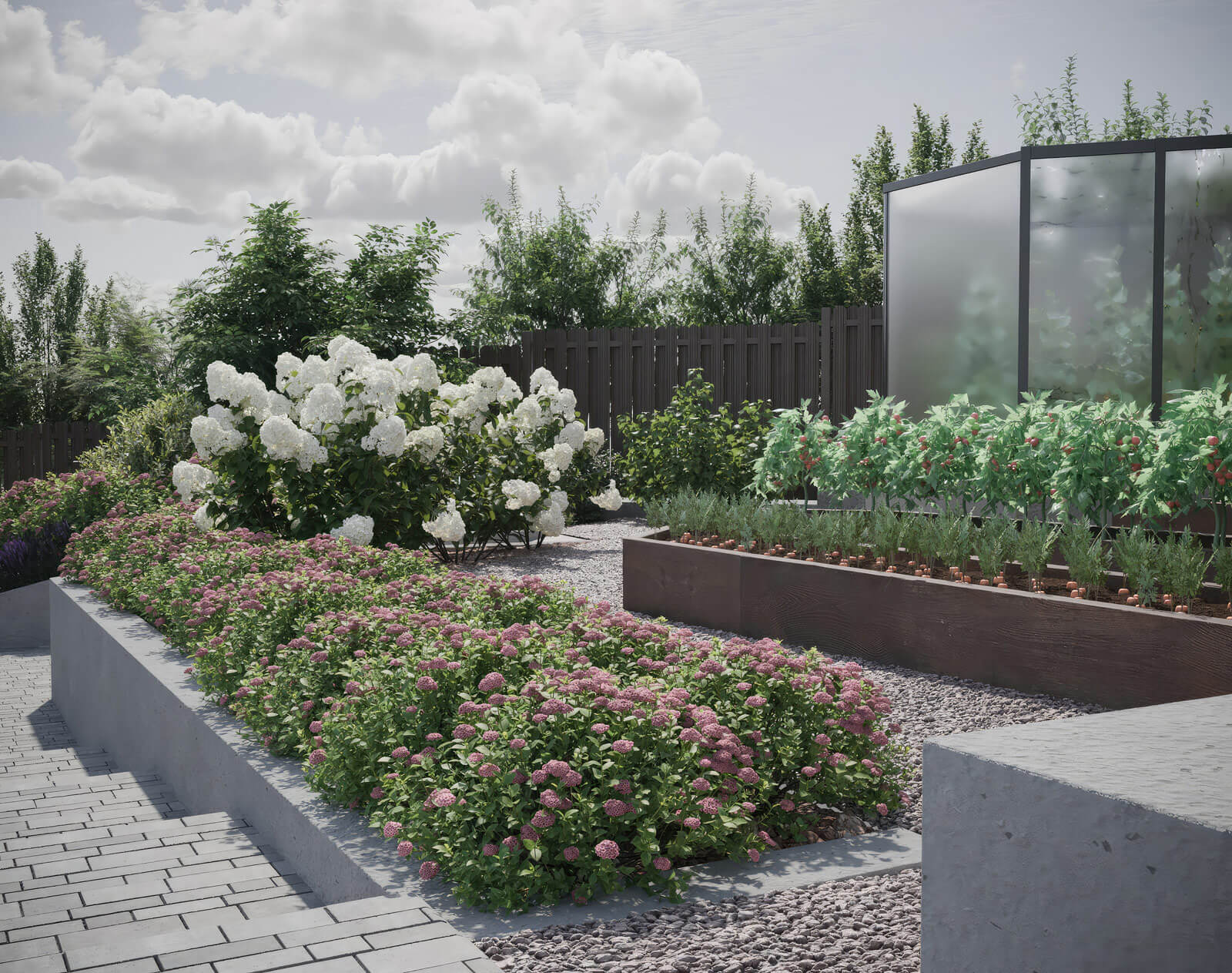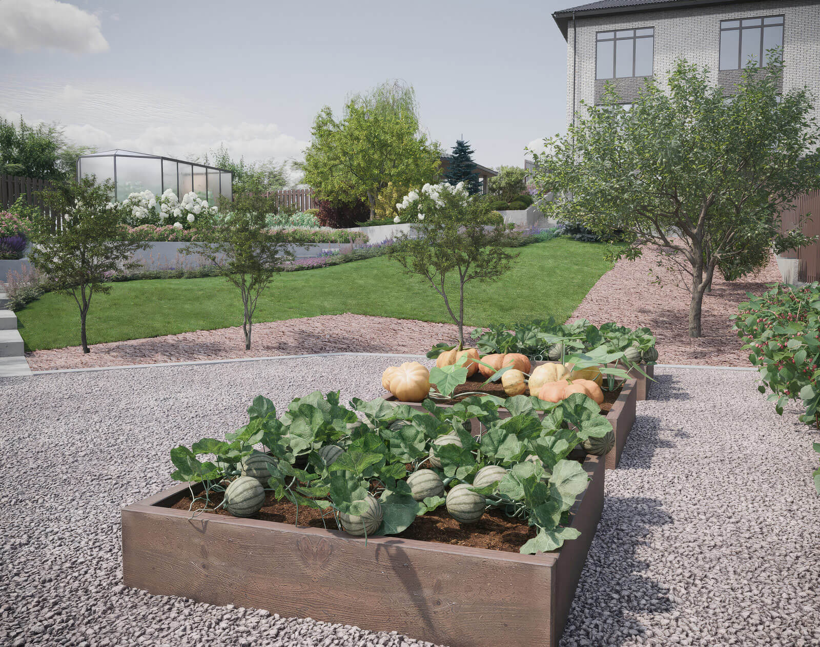 Чтобы скрыть соседние постройки, теплицы и добавить динамики в ландшафт, разработала нетипичную