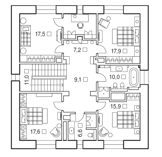 В спальне зона отдыха и сна обозначена ковром. Геометрический орнамент на молочном полотне ковра гармонирует с обоями натурального оттенка «под рогожу», голубоватым покрывалом, синими занавесками и медовым тоном деревянного напольного покрытия. В спальне, как и в прочих комнатах дома, воссоздан американский стиль.