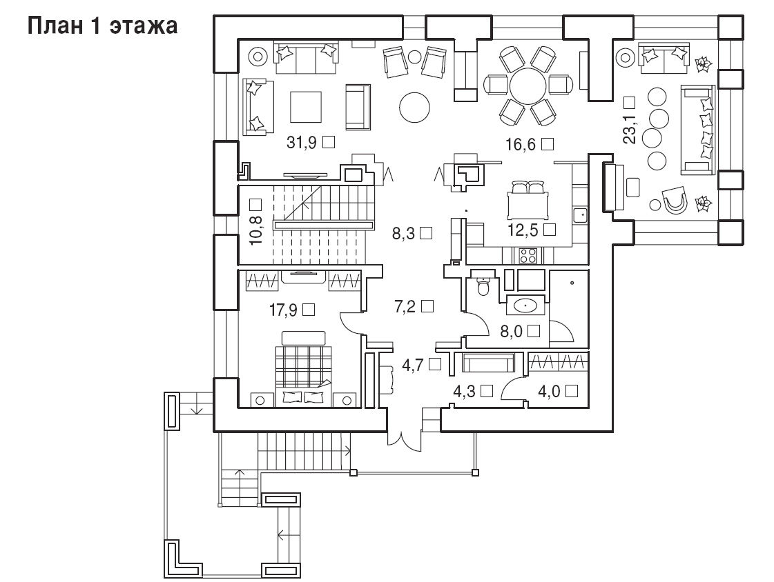 В доме все продумано для комфортного времяпрепровождения, например, предусмотрена зона отдыха в гостиной. Мягкие диваны и кресла в серо-голубых тонах от американских производителей образуют уголок для приятного досуга, который изысканно подчеркнут большим напольным ковром нежно-голубого цвета. Прохладная палитра ковра и дивана идеально сочетается с теплым медовым оттенком деревянного напольного покрытия.