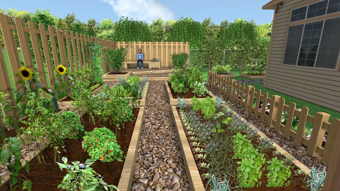 Декоративный огород состоит из террасируемой декоративной зоны для выращивания растений в контейнерах с зоной отдыха и 6 гряд прямоугольной формы для высадки овощей в грунт. Основной материал ограждения — дерево. С одной стороны деревянный забор, высотой 2 м, является опорой для высоких плодово-овощных культур (кукуруза, ежевика, физалис, подсолнух). Ограждение в лесной части из сетка-рабица, плавно переходящей в лес. Со стороны дома декоративный забор из штакетника высотой 60 см, перед которым цветочно-декоративный бордюр с клубникой.
