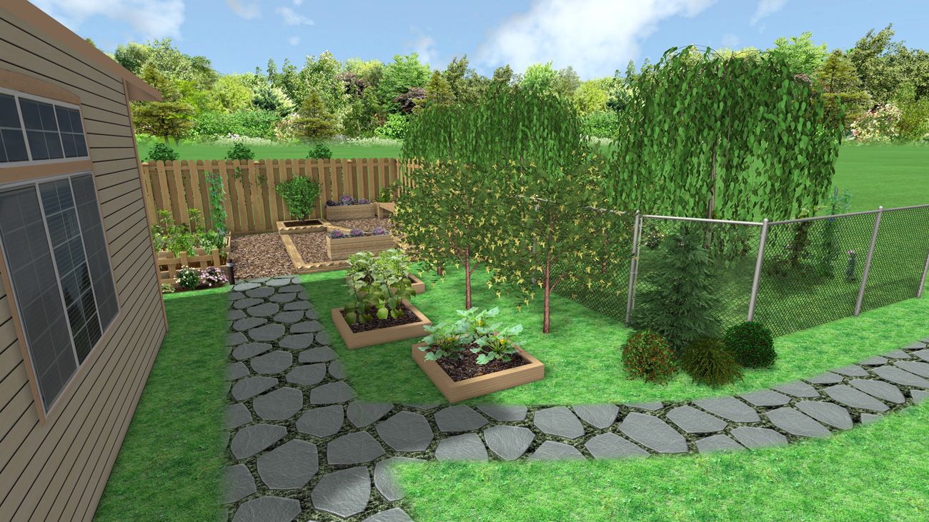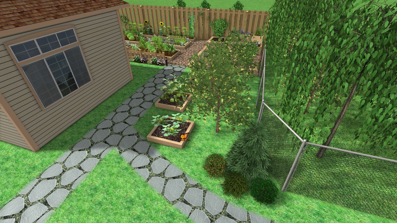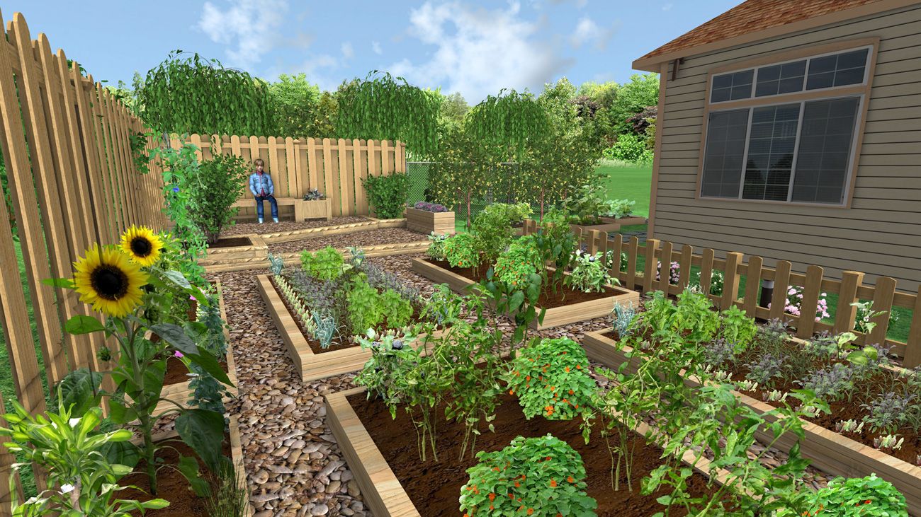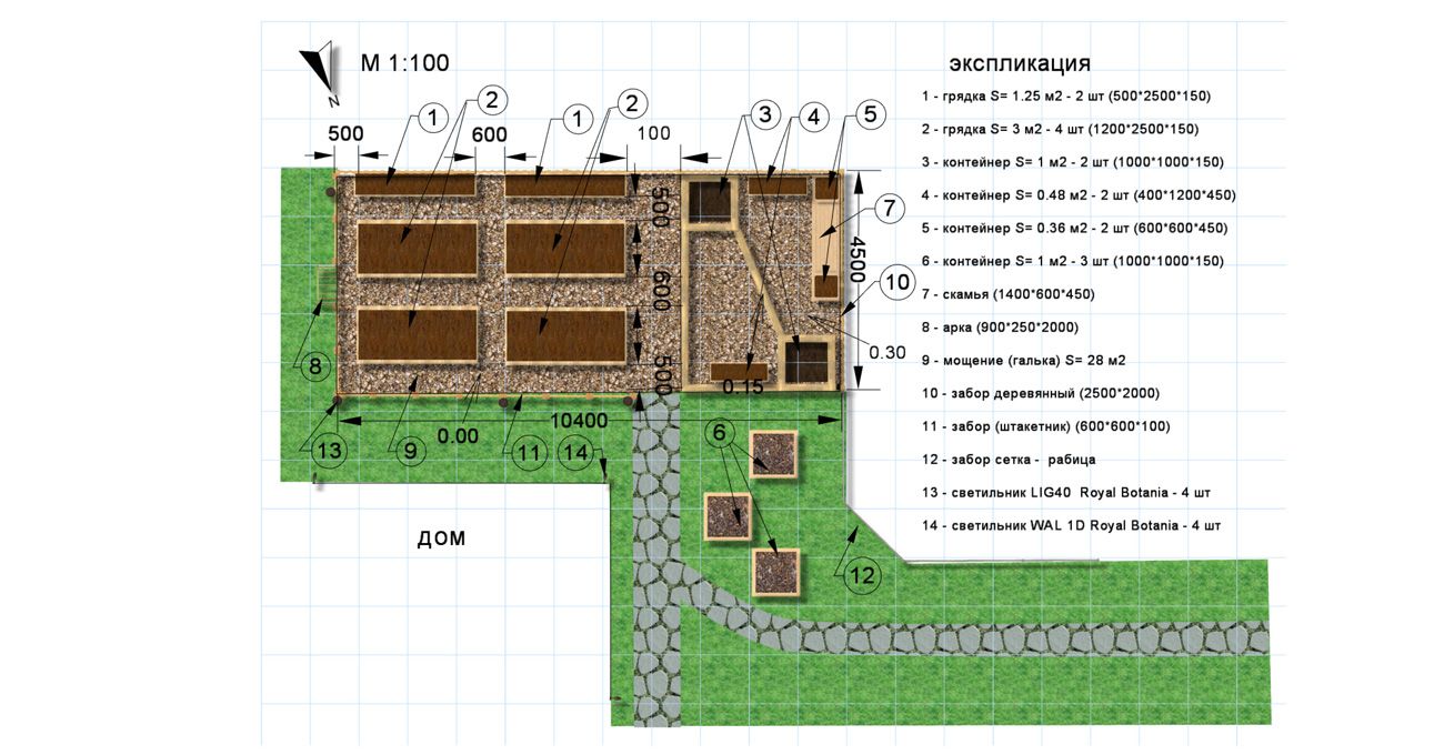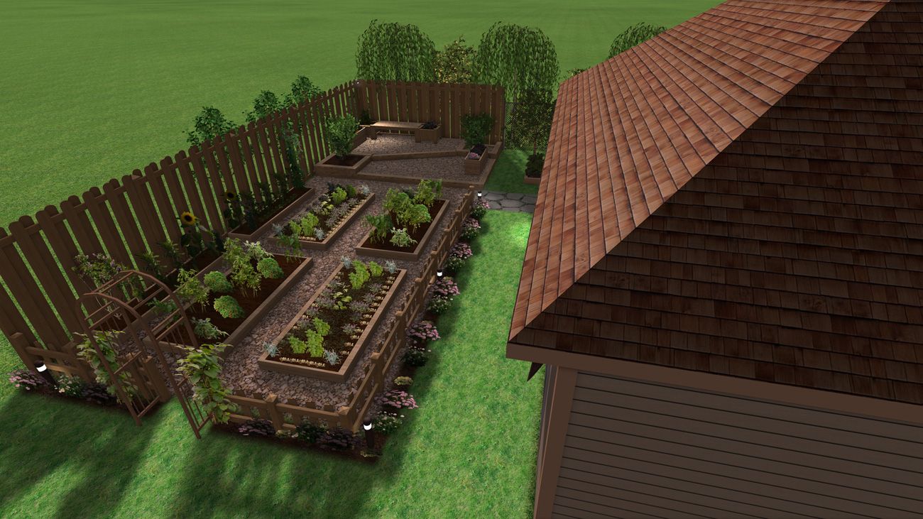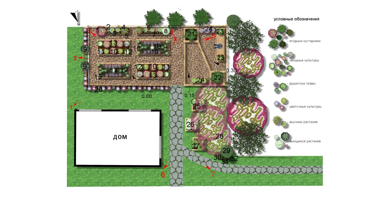 Вход в огород идет через арку, которая служит опорой для актинидии. Дорожки и приподнятая терраса выполнены в виде отсыпки из декоративной гальки. На террасе находится скамья с контейнерами для душистых трав и является логическим завершением композиции, позволяет любоваться декоративным огородом. В лесной части возле осин размещены 3 конструкции 1 х 1м для овощных культур.