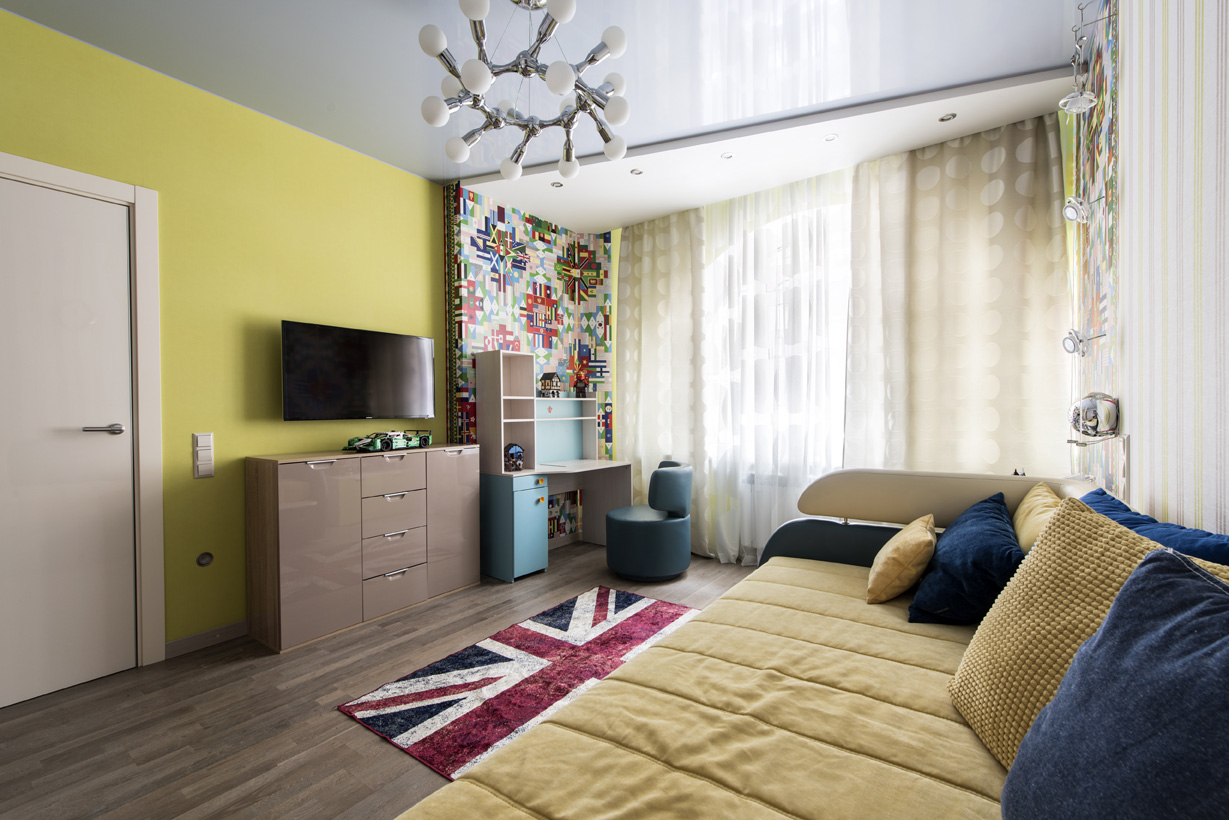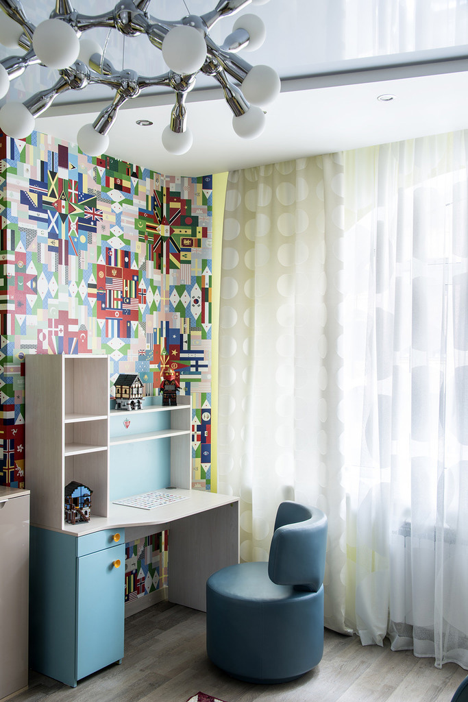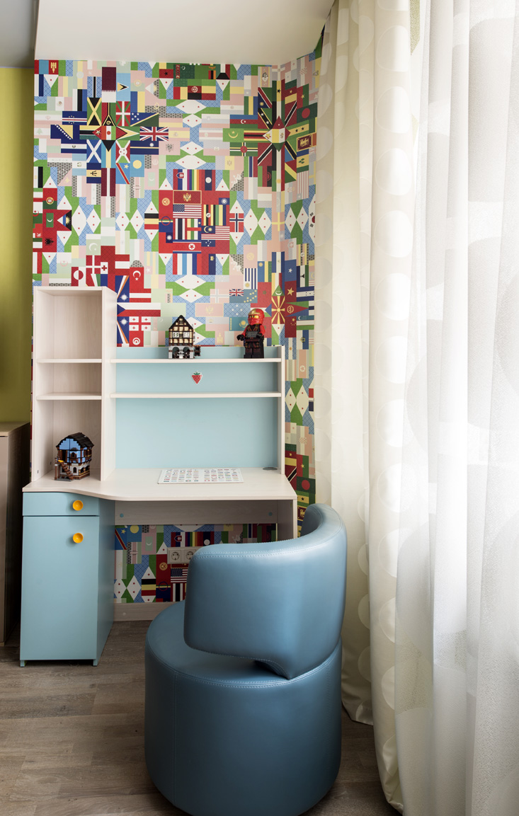 «Перед началом работы над дизайн-проектом любого помещения я всегда обсуждаю с заказчиками стилистику интерьера, цветовую гамму, пожелания по предметам мебели, свету и т.д. Поэтому дизайн детской комнаты предопределил сам ребенок: в процессе нашего общения я узнала, что он интересуется разными странами, любит путешествия, знает много столиц государств мира и увлекается изучением символики стран и их флагов. Именно это географическое увлечение мальчика и стало основой для оформления», — рассказывает автор проекта.