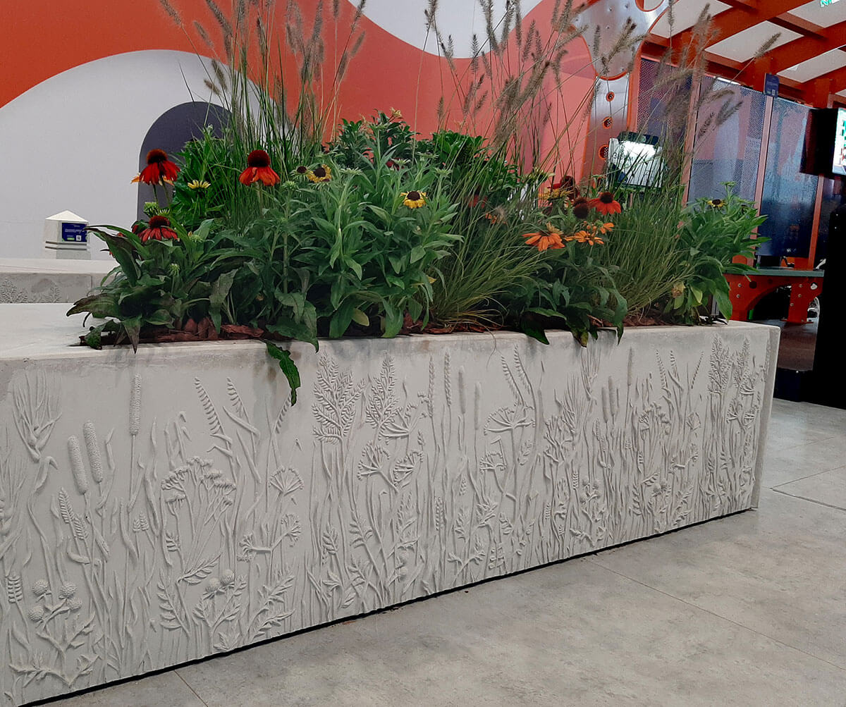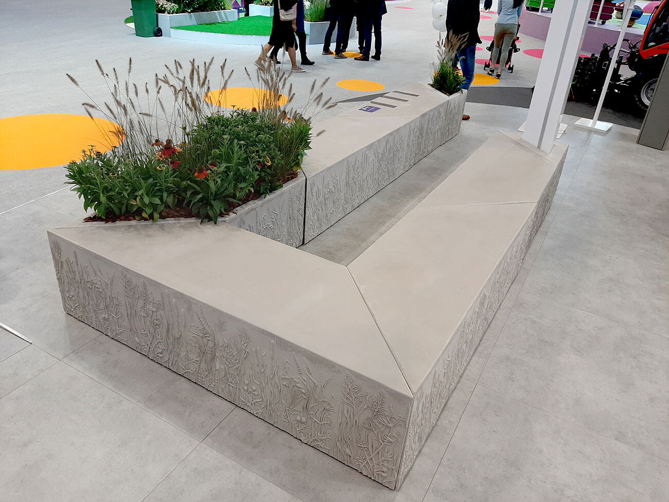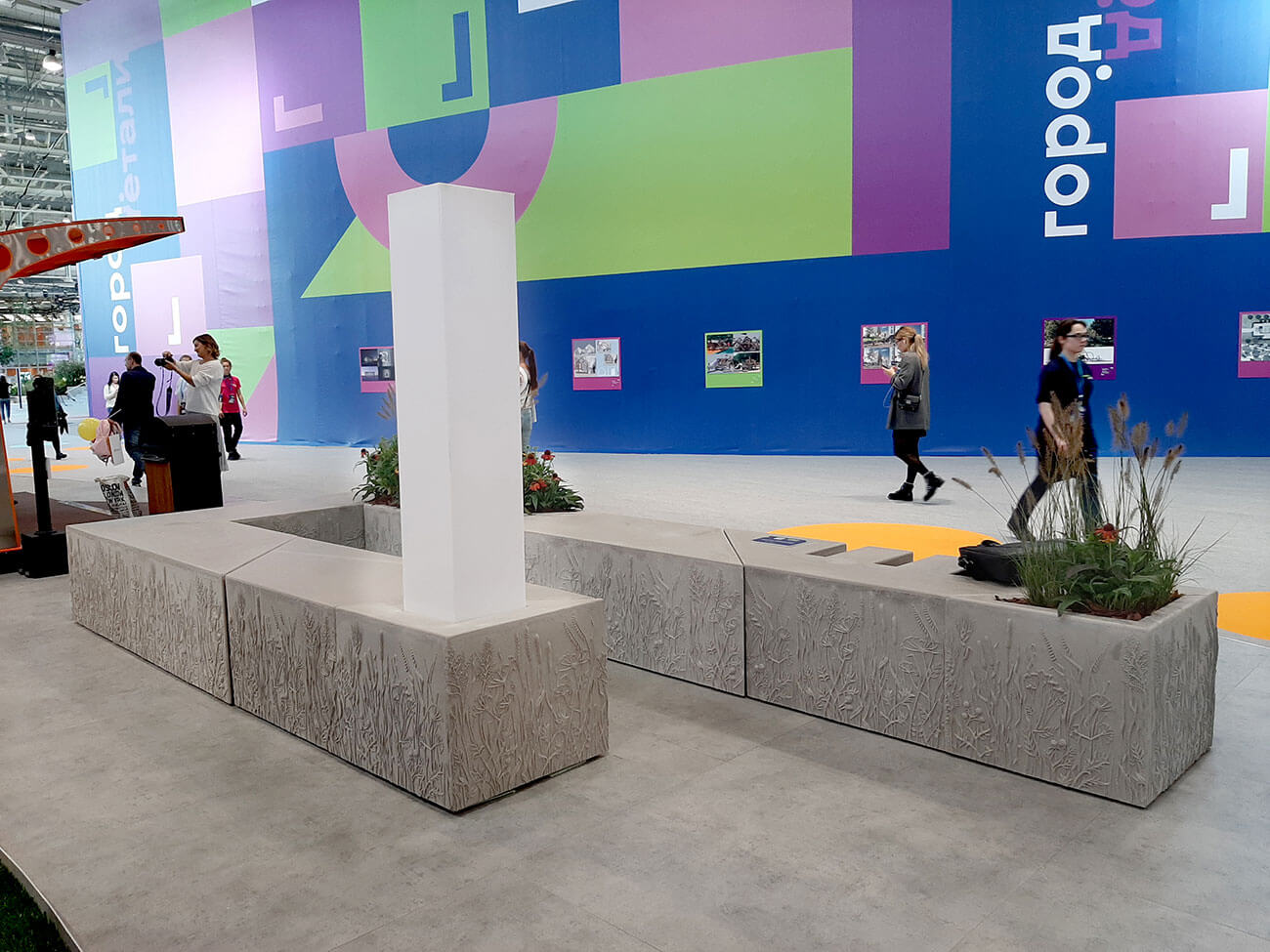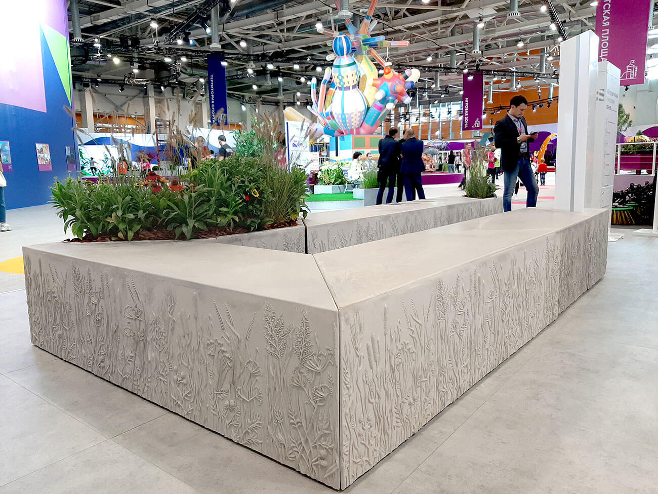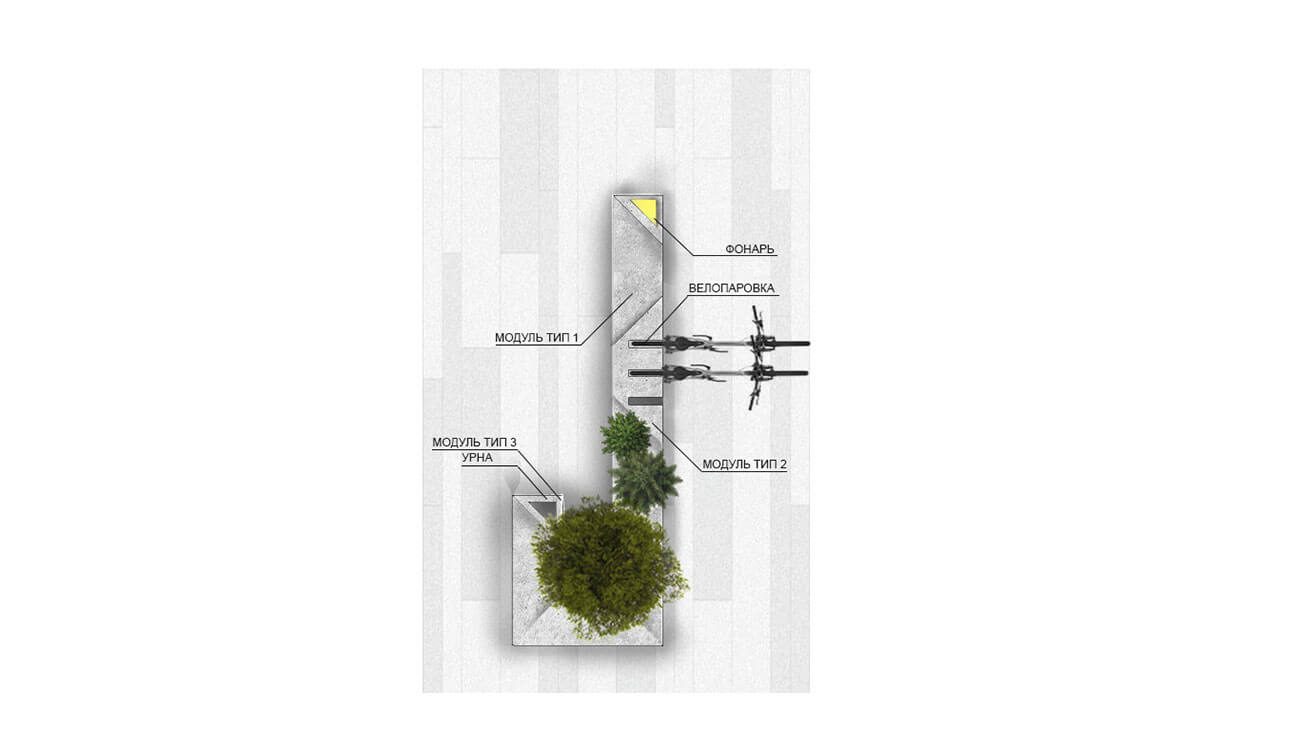 Универсальная модульная система «Луга» — это многофункциональный конструктор городской мебели, включающий в себя различные функциональные модули, таки как скамья, кашпо, урна, велорпарковка, аренда велотранспорта, дата-станция, Wi-Fi-модуль, фонтан, памятный знак, навигация,фонарь, треугольный лайтбокс.