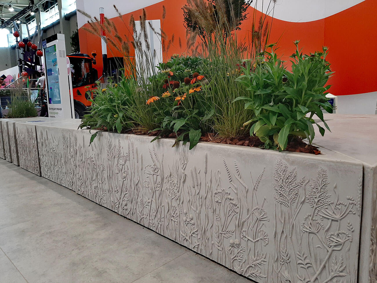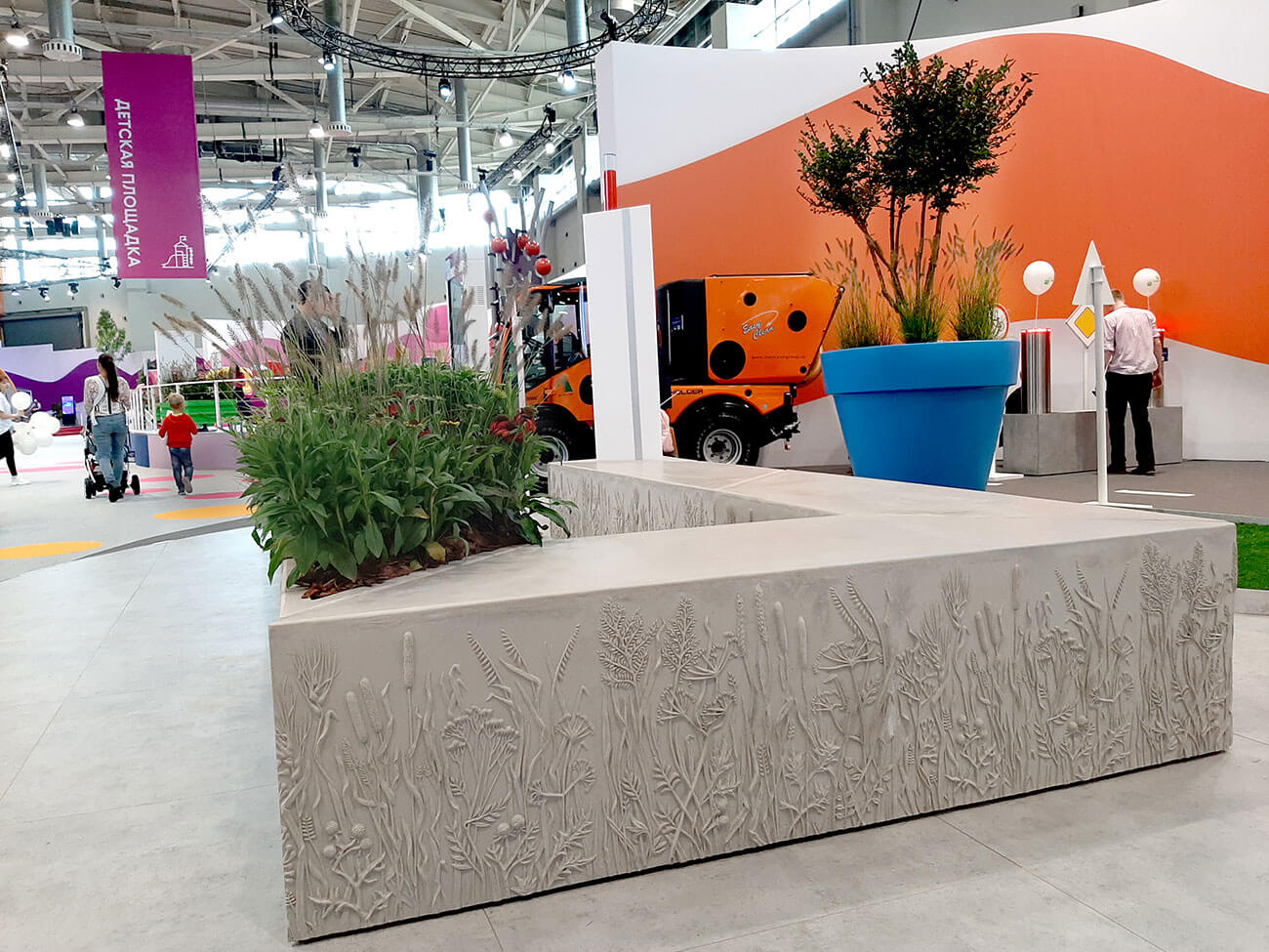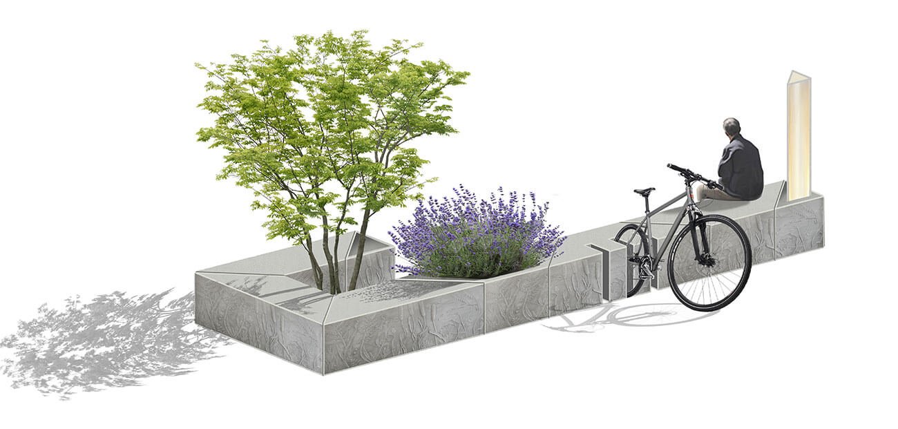Универсальная модульная система «Луга» — это многофункциональный конструктор городской мебели, включающий в себя различные функциональные модули, таки как скамья, кашпо, урна, велорпарковка, аренда велотранспорта, дата-станция, Wi-Fi-модуль, фонтан, памятный знак, навигация,фонарь, треугольный лайтбокс.