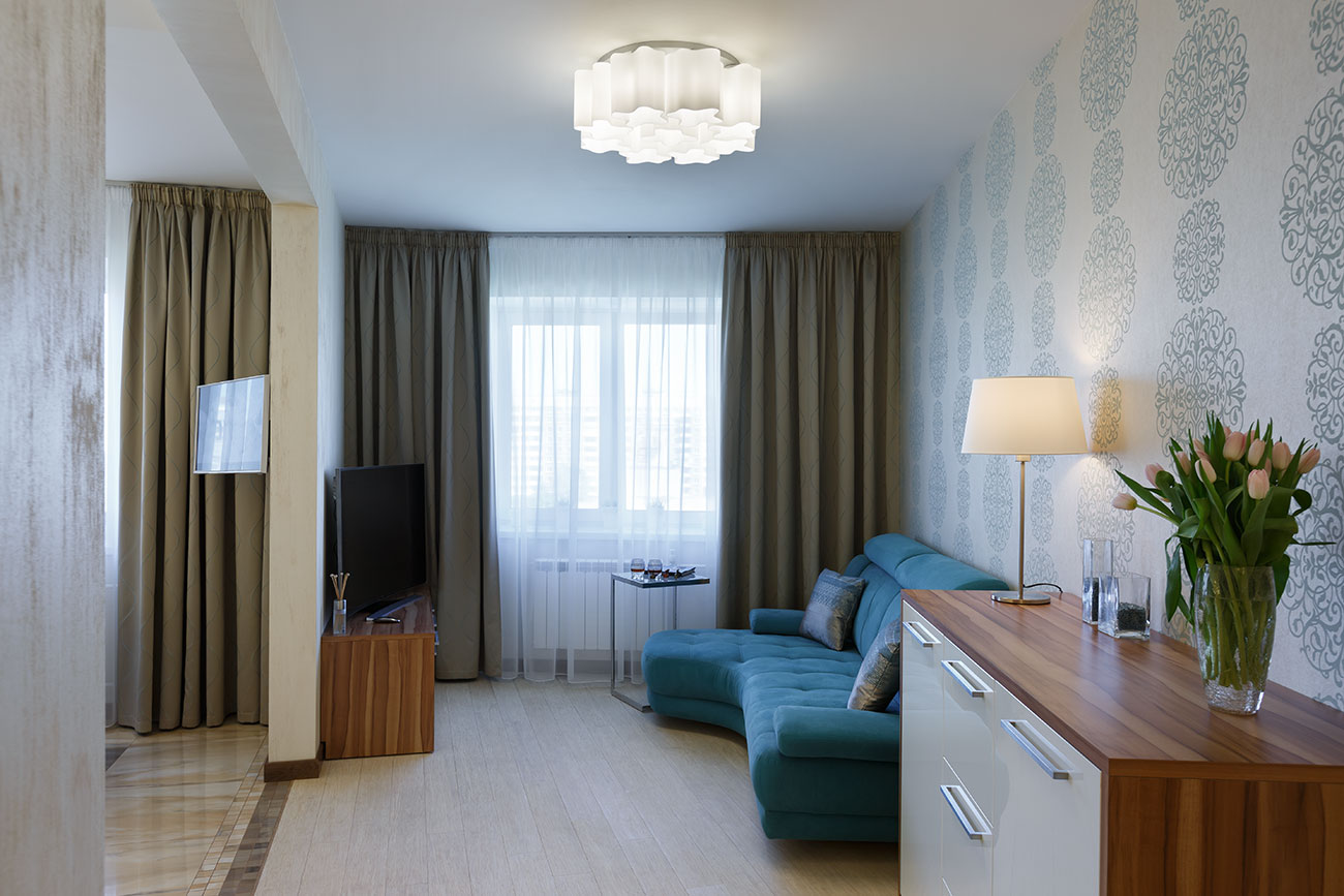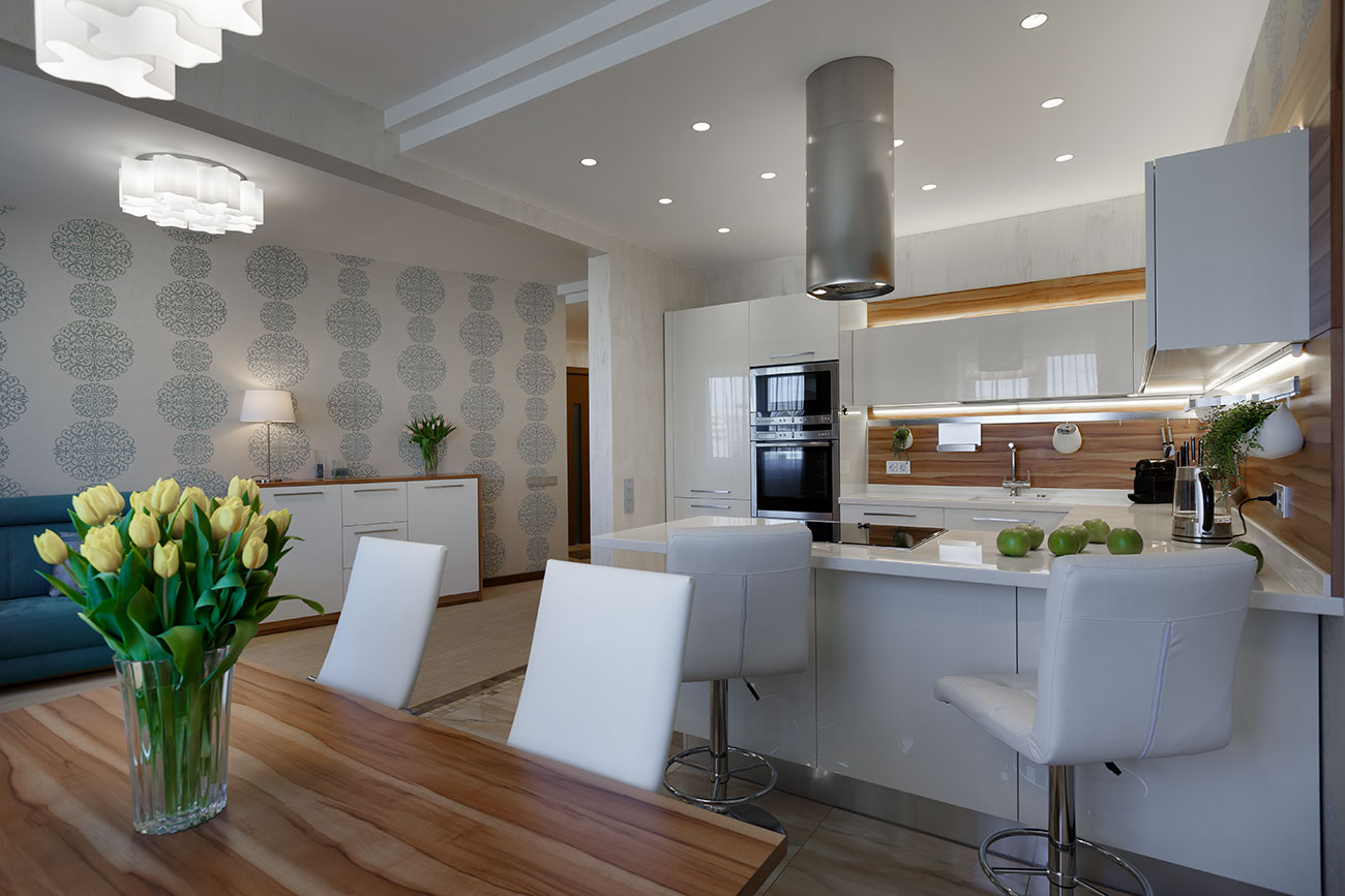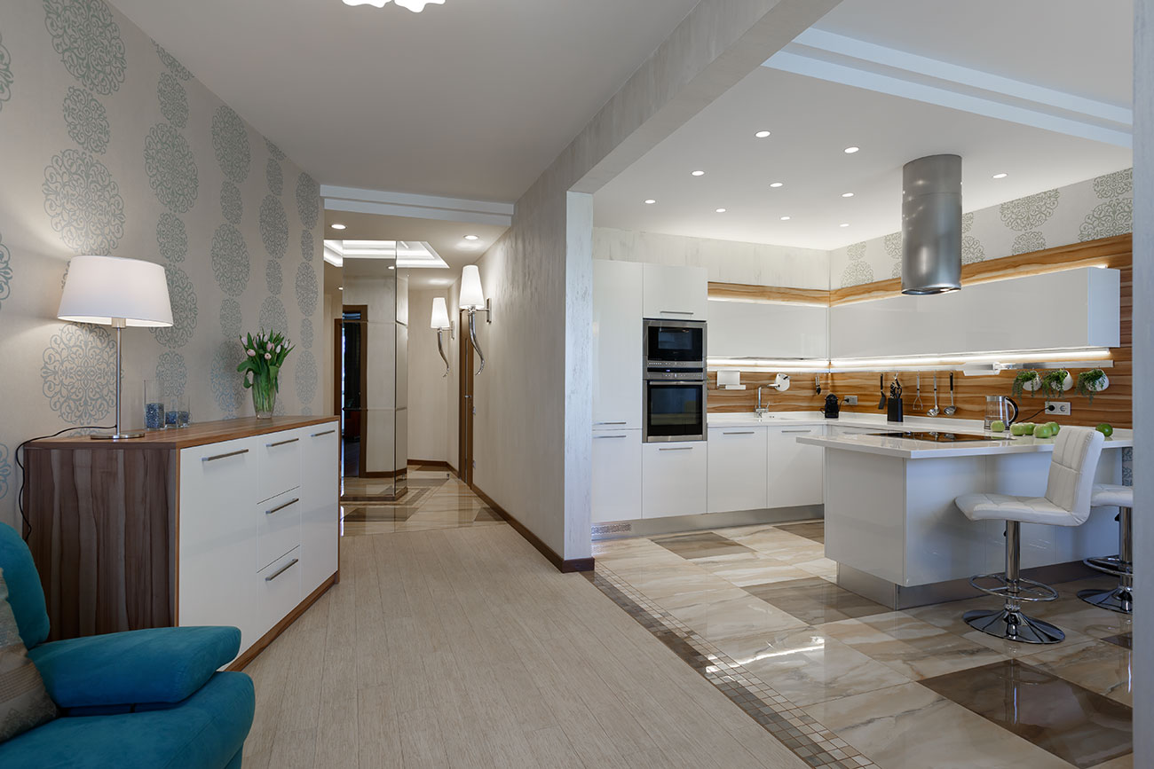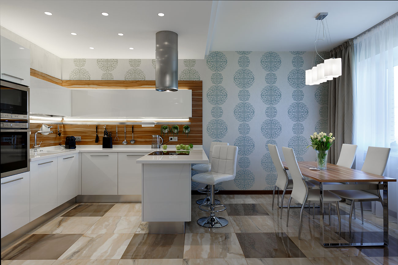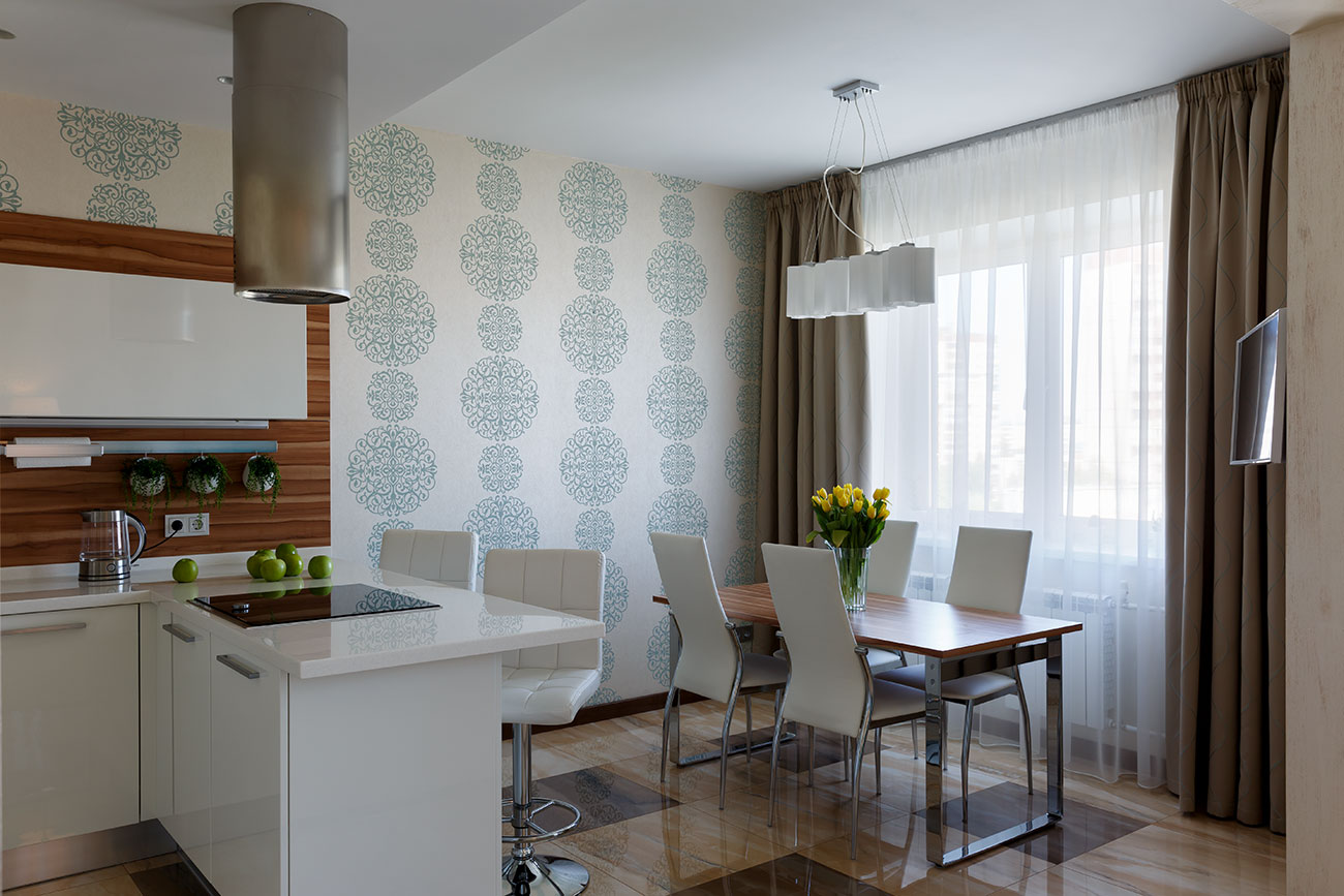 Стены гостиной и кухни-столовой частично покрыты декоративной штукатуркой, частично обоями с классическим крупным узором бирюзового цвета, пол в кухне и прихожей облицован керамической плиткой из одной коллекции. Современная, стильная кухонная мебель (Giulia Novars, Россия), оснащенная техникой последнего поколения, отличается удобством и эргономичностью. Несмотря на широкие фасады, верхние ящики легко открываются вверх благодаря специальным механизмам петель крепления. П-образная компоновка шкафов включает «остров», связанный с гарнитуром одной столешницей. В него встроена варочная плита, поэтому он используется и для приготовления еды, и в качестве барной стойки, и как место для завтрака.