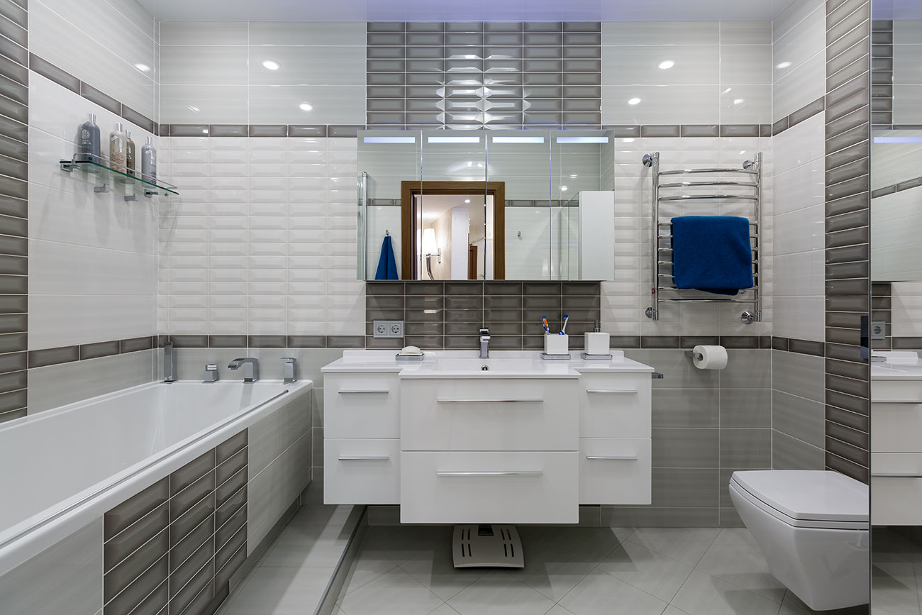 В облицовке ванной комнаты предпочтение отдано оригинальной керамической плитке от итальянской фабрики Sant'Agostino из коллекции Light. За счет своего объема и рельефной поверхности в зависимости от освещения она меняет свой цвет.