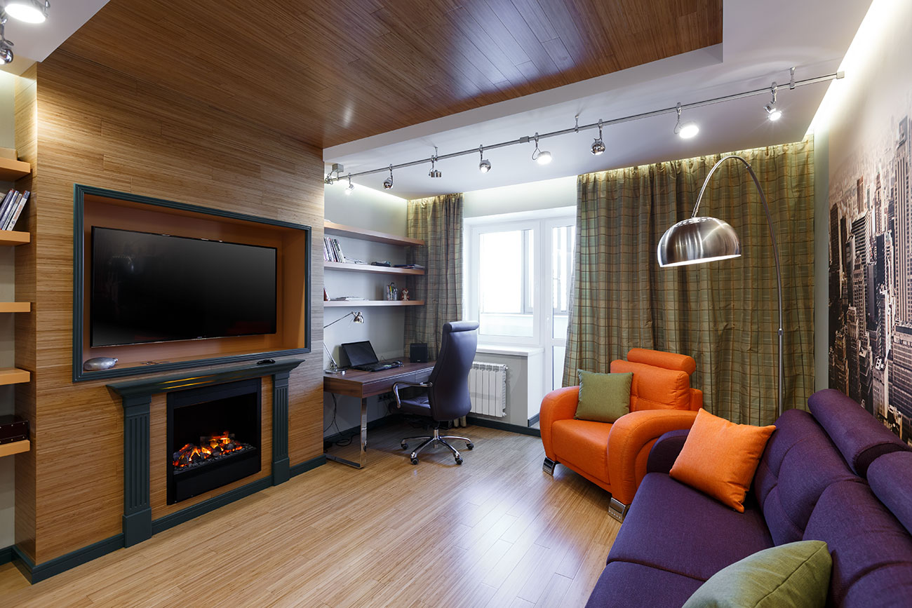 В комнате сына фотопанно размером практически во всю стену с видами городских небоскребов, массивный диван, кресло со стилизованными формами, лаконичная и функциональная корпусная мебель, большой плазменный телевизор и встроенный электрокамин, а также активное использование контрастных цветов позволили создать необычную атмосферу и подчеркнуть урбанистический характер пространства.