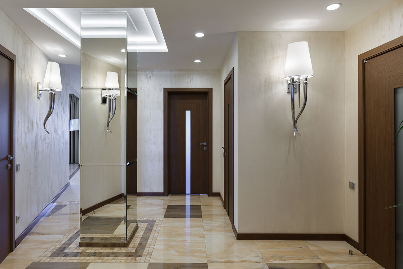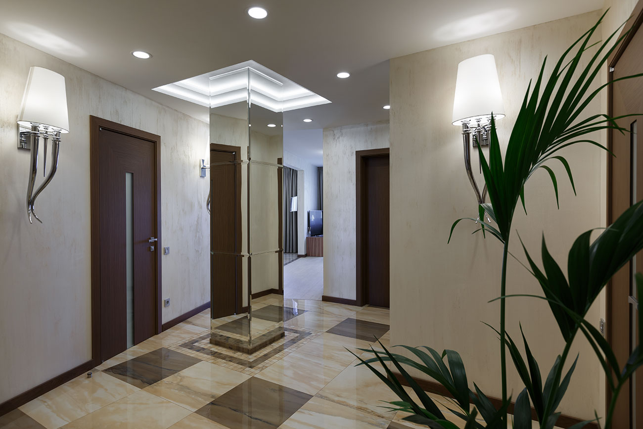 Угловое расположение, наличие в центральной части холла несущей колонны квадратного сечения — эти особенности планировки устраивали владельцев. При этом им хотелось, чтобы оформление пространства было решено в стилистике современного городского жилья с элементами легкой классики.