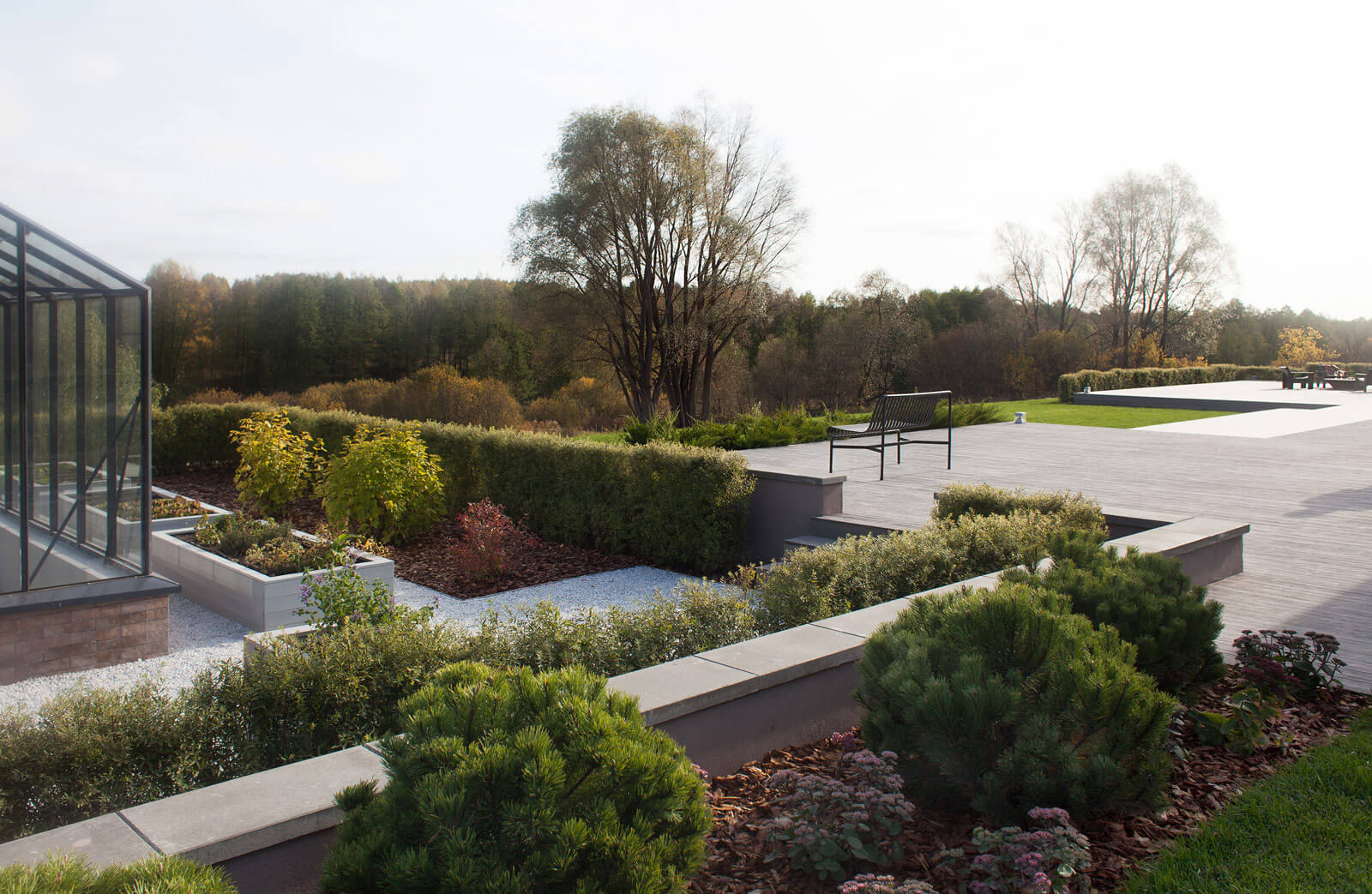 Следующая терраса объединяет беседку с зоной отдыха у бассейна и чашей для костра. К беседке можно спуститься по широким лестницам, которые мы объединили с отмосткой; а также через лужайку. На следующей террасе – небольшой огород. В огороде установили красивую стеклянную теплицу и грядки из лиственницы по нашим чертежам; посадили плодовые кустарники.