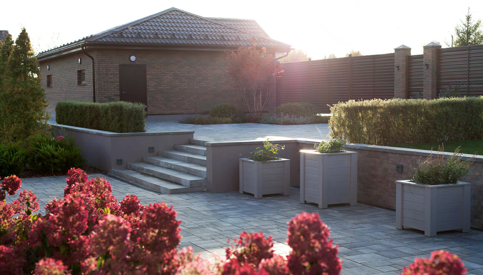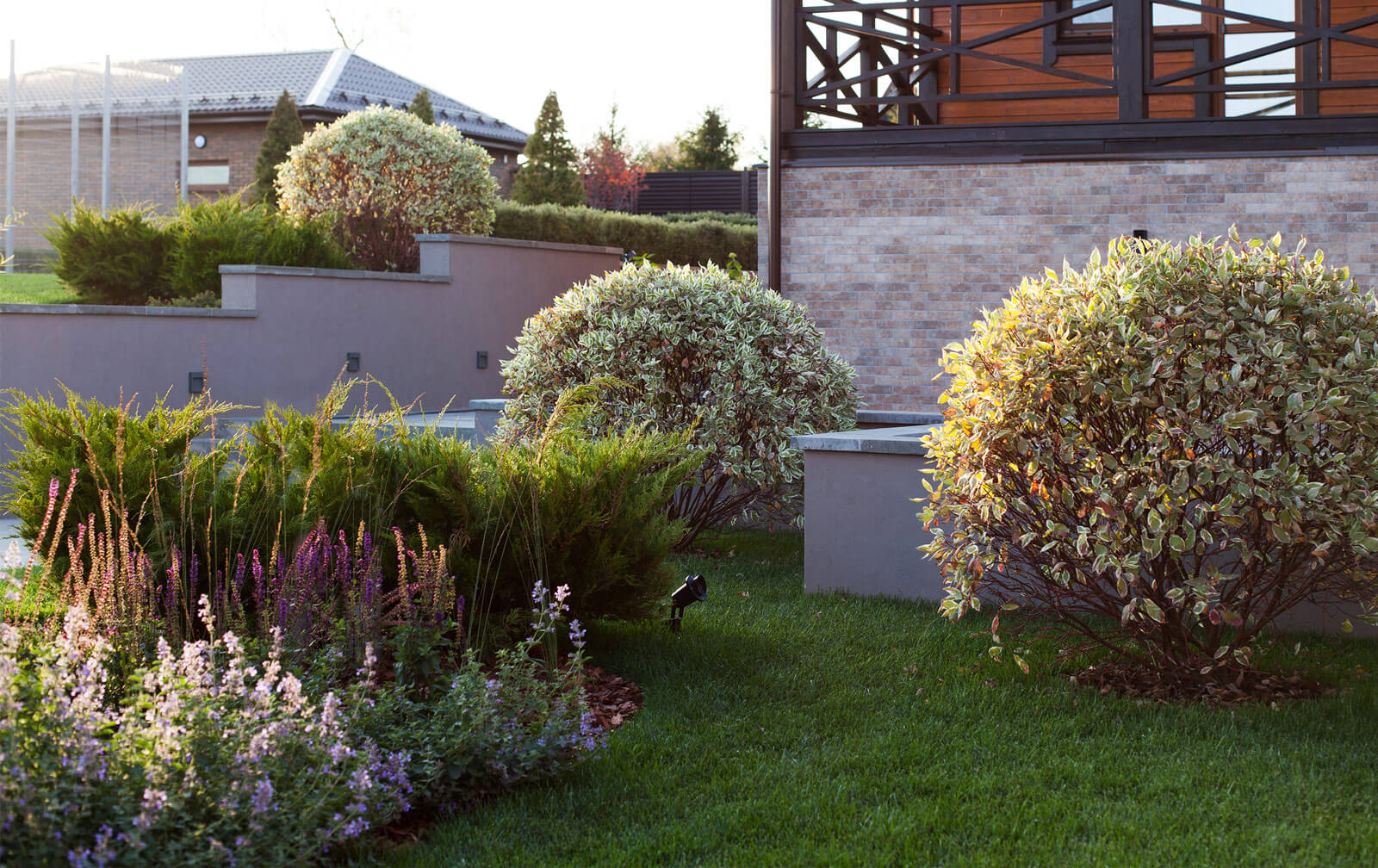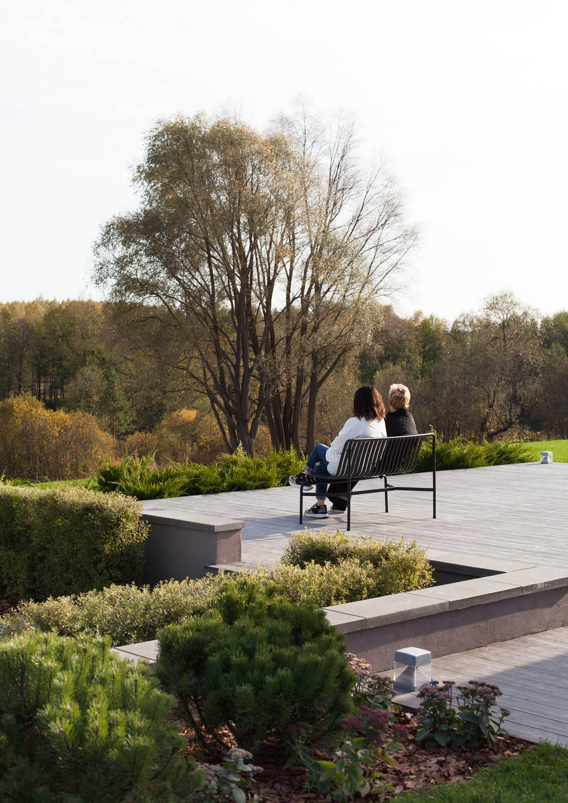 За домом устроена смотровая площадка, с которой можно любоваться на открывающиеся виды. Переход от смотровой площадки к бассейну оформлен лужайкой с цветниками в природном стиле. Из опыта мы понимали, что в подобные цветники в российских реалиях стоит добавлять растения, которые дадут структуру в межсезонье. Мы добавили пионы, которые дадут шикарное цветение, аромат и красивую листву, и “шары” из ивы Nanа. В этом проекте мы использовали растения — акценты в форме шара, которые визуально объединили разные части сада.