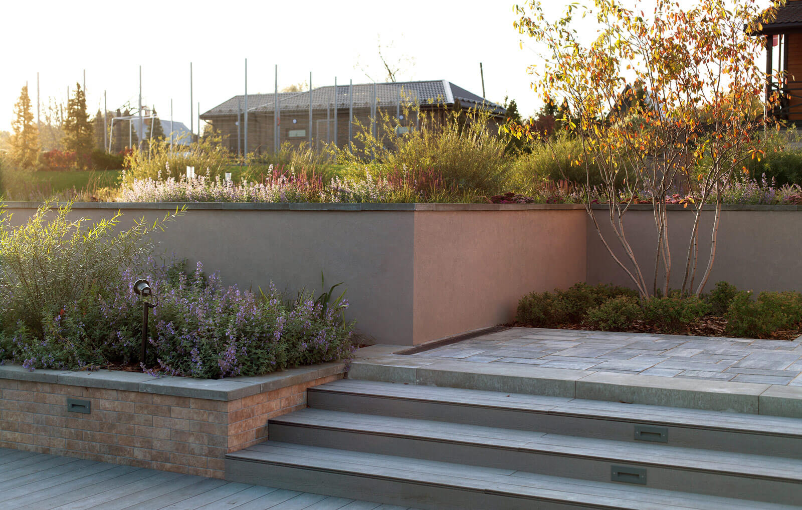 При существующем рельефе все пожелания заказчиков сложно было реализовать, мы устроили террасы, укрепив их подпорными стенками: в верхней части спроектировали гараж и парковку для гостей, на второй террасе — баскетбольную площадку. Дальше — терраса с лужайкой и перголой — качелями. Чтобы смягчить уклон, сделали пологий спуск, устроив холм.