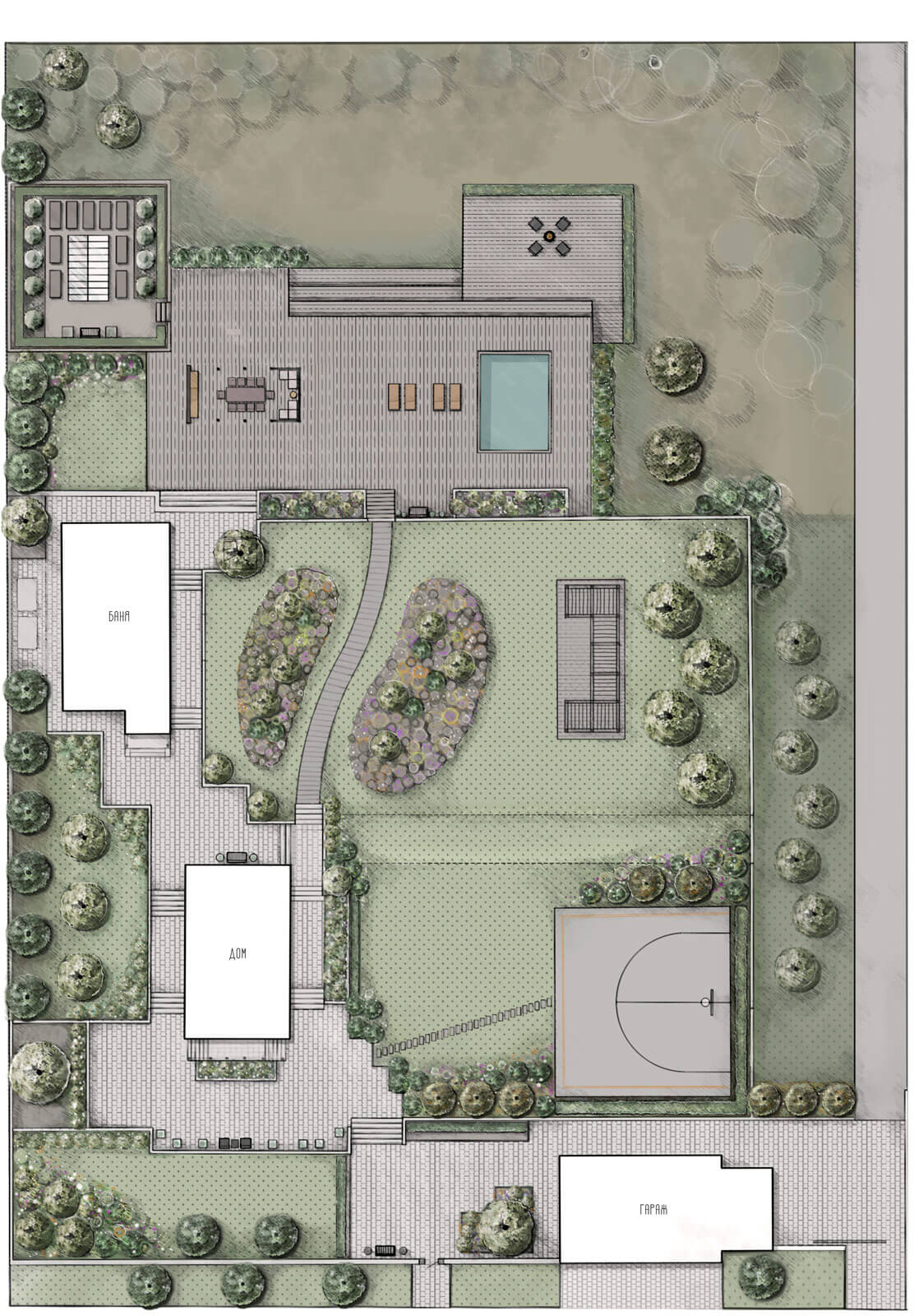 Сад (60 соток с перепадом высот в 3 м) находится в дер. Алексеевское, Марий Эл, в заповеднике Марий Чодра. Заказчики — семья из Казани. На участке уже был жилой дом, баня и беседка. Нашей задачей было визуально объединить разрозненные постройки, спроектировать гараж, баскетбольную площадку, лужайку для игр, бассейн, кострище, огород с теплицей и плодовый сад.