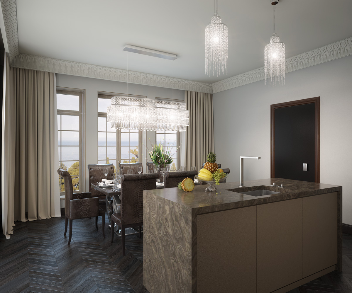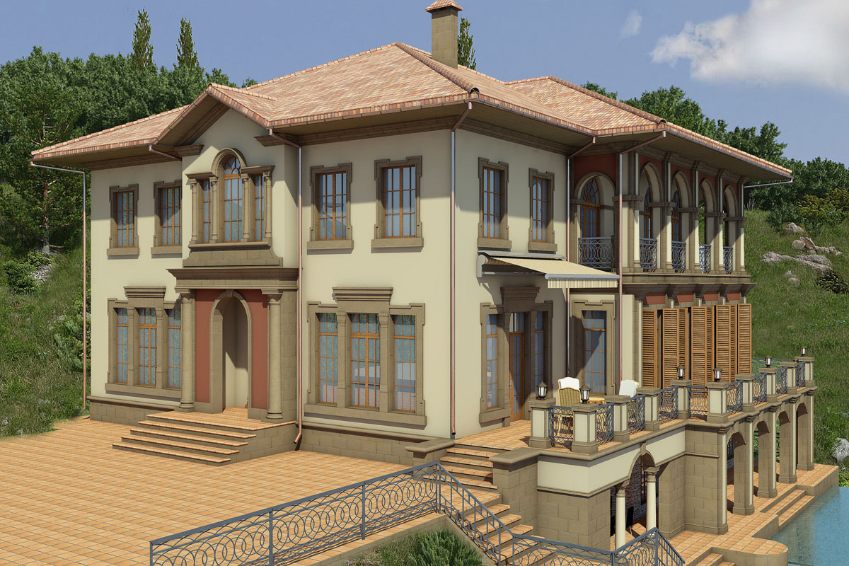 По желанию хозяев загородный коттедж в Крыму спроектирован в классическом стиле. Архитектурные и колористические решения придают ощущение легкости и открытости, характерные для приморской архитектуры. Большие оконные проемы дают ощущение перетекания экстерьера в интерьер.