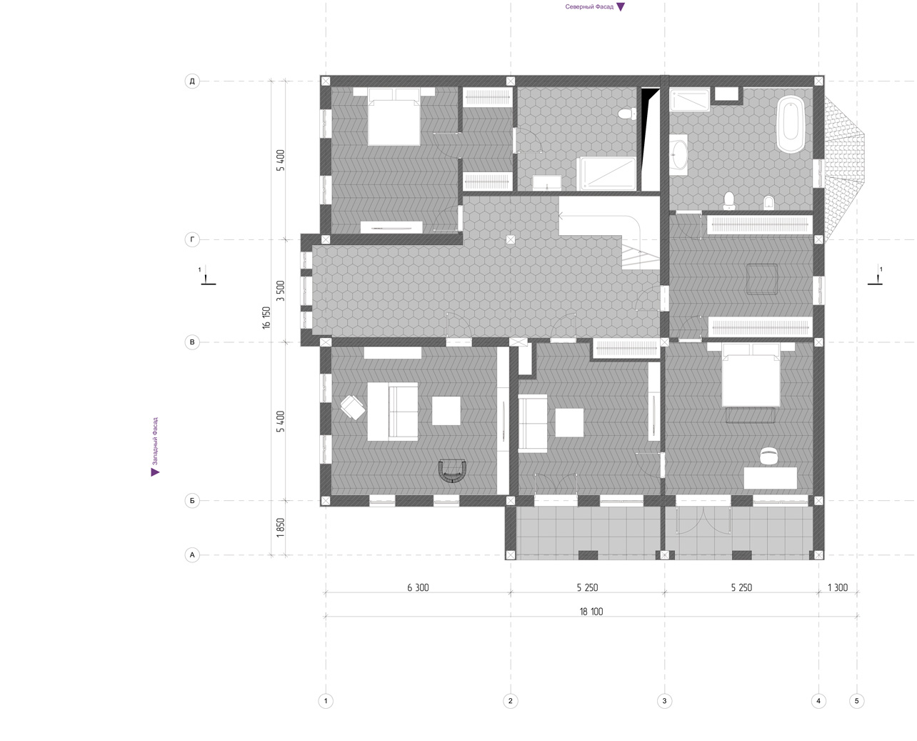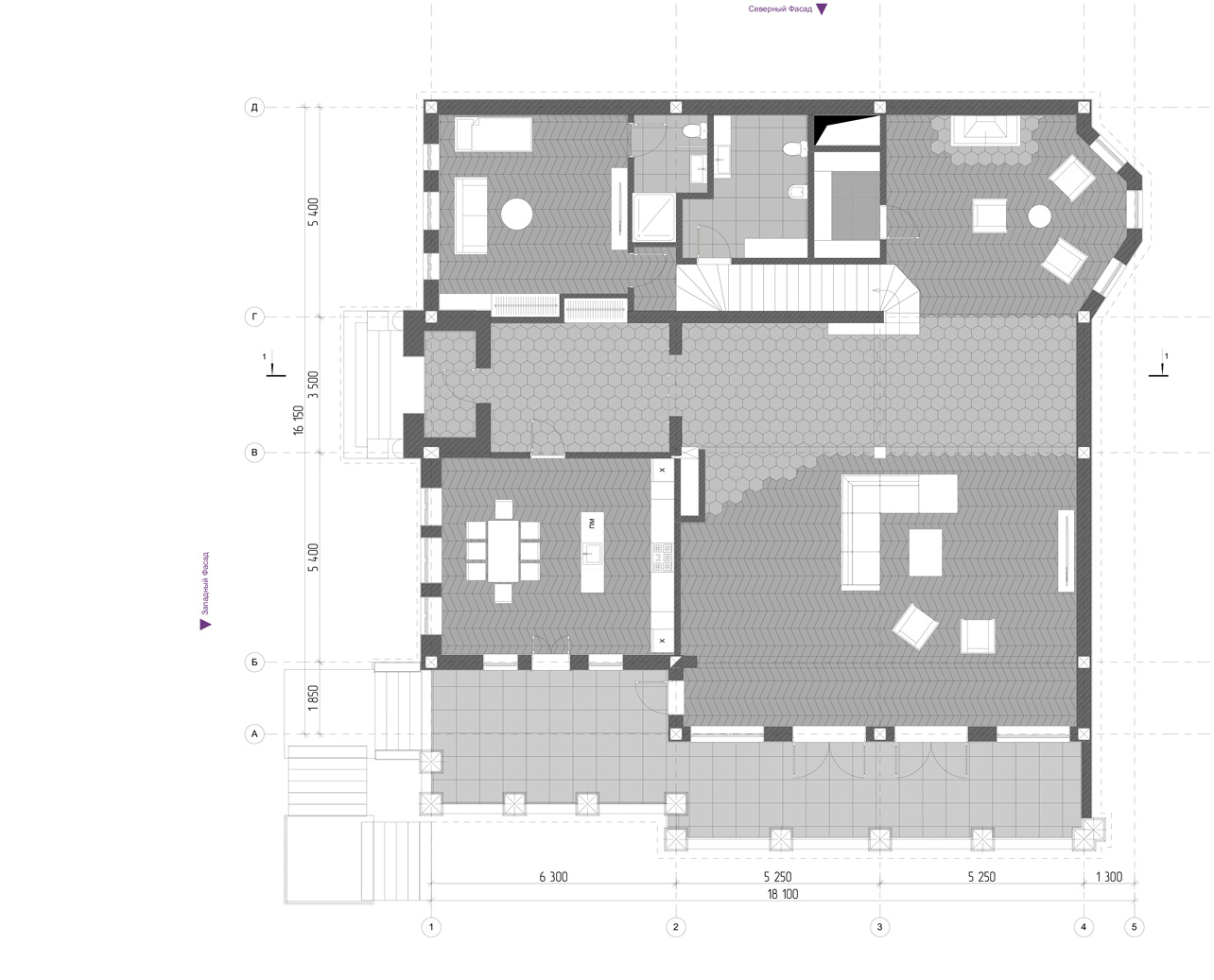 Объемно-планировочное решение здания предполагает 3 уровня и поэтажно зонируется. На минус 1-м и 1-м этажах располагаются общественные и технические помещения. На 2-м этаже располагаются приватные комнаты хозяев дома и их гостей. Подкровельное пространство используется для установки вентиляционного оборудования и блоков кондиционирования. Окна всех основных комнат ориентированы на Юго-Запад, что делает помещения достаточно освещенными и обеспечивает максимальную инсоляцию.