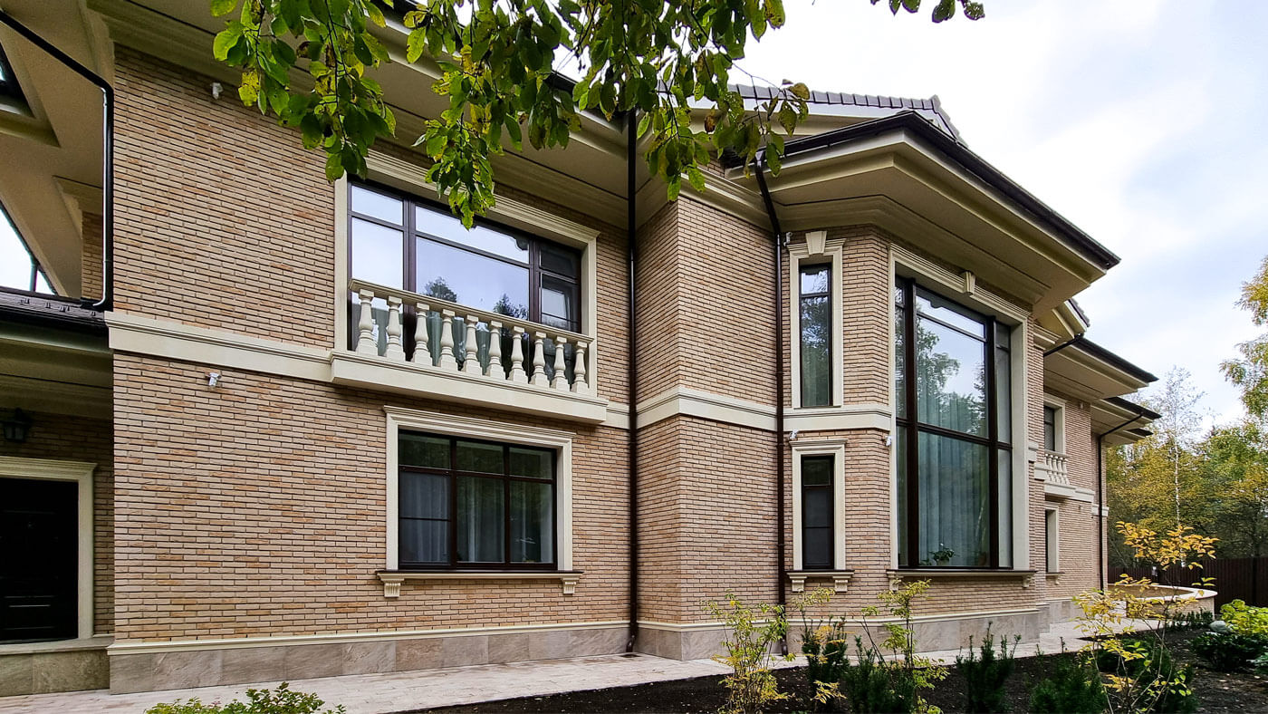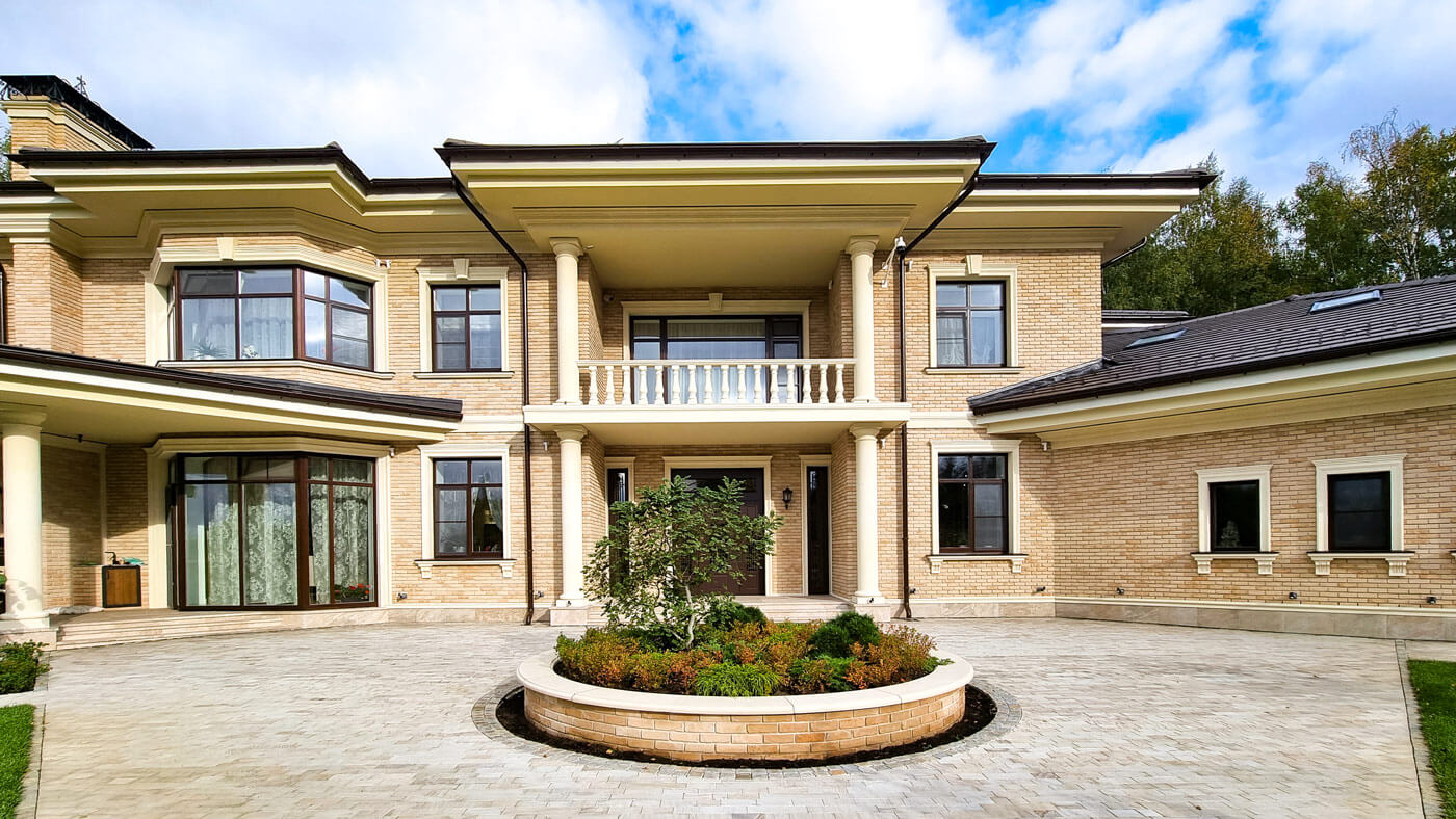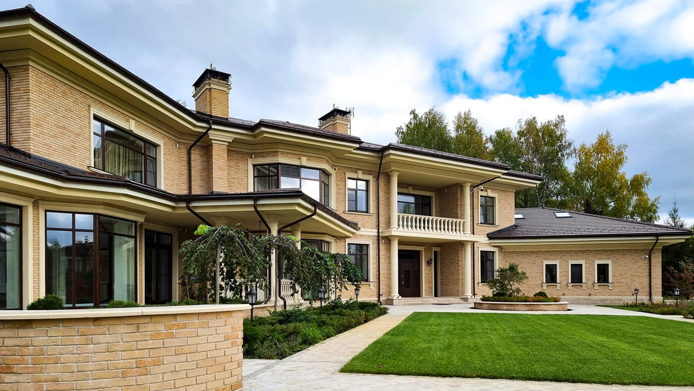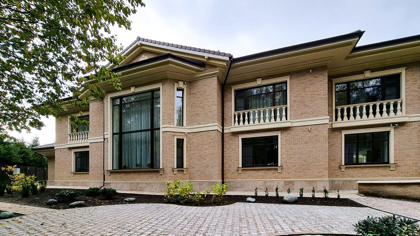 Фасады здания облицованы кирпичом ручной формовки Vandersanden. Кровля выполнена из натуральной керамической черепицы.