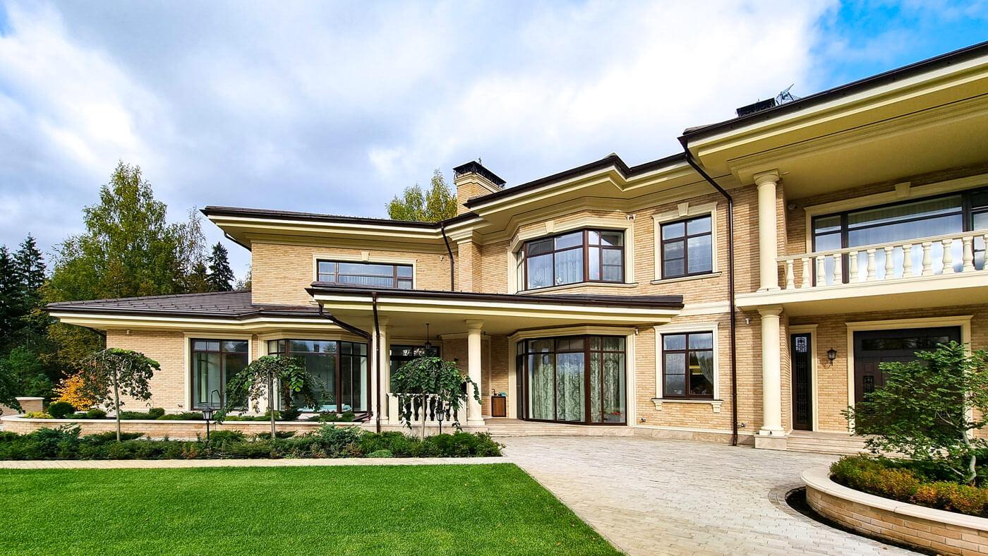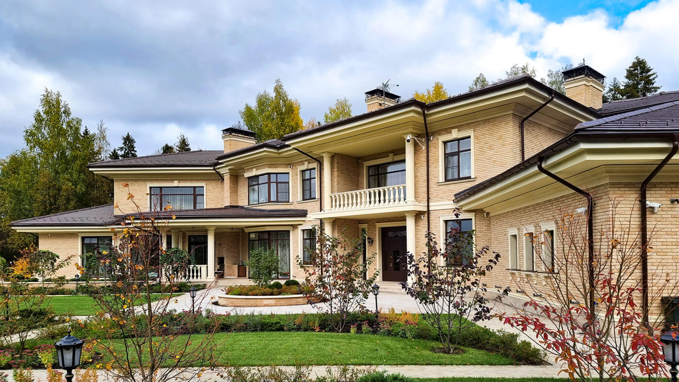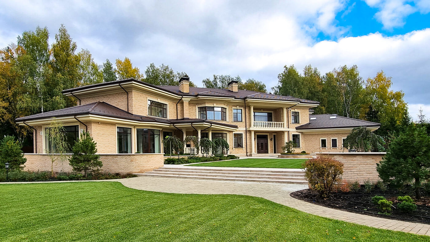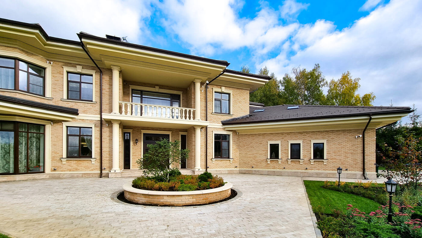 Усадьба в неоклассическом стиле расположена на опушке леса в западной части Подмосковья на участке 0.6 га.