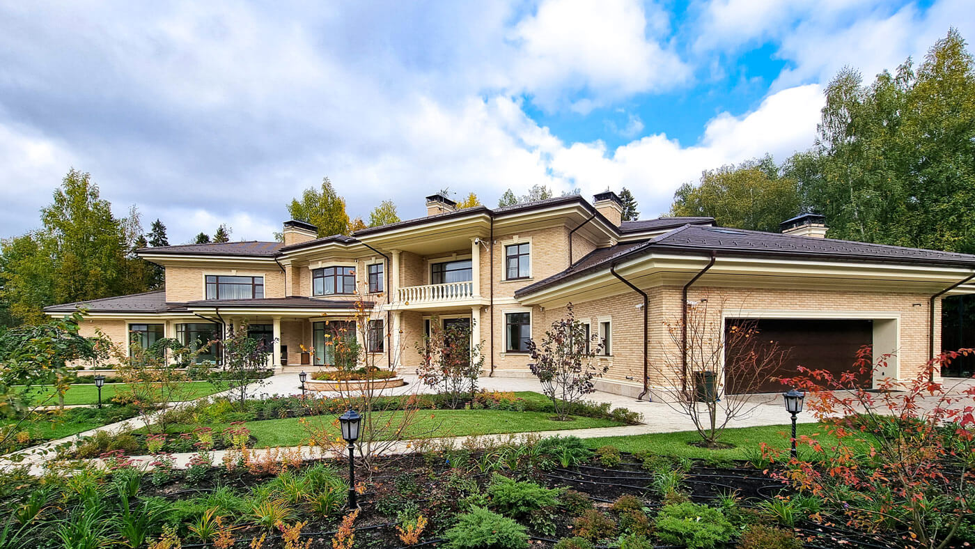 Здание усадьбы оптимально расположено на просторном участке с учетом инсоляции и главных видовых точек. Главный фасад здания с входной группой раскрыт на участок, где выполнен живописный ландшафтный дизайн. Усадьба имеет центральную часть с симметричной входной группой и просторной двухсветной гостиной и два боковых крыла. В правом крыле расположен гараж, технические помещения, помещения персонала и охраны с отдельным входом. В левом крыле расположена зона спа с бассейном, хамамом и сауной с выходом на открытую и крытую террасы.