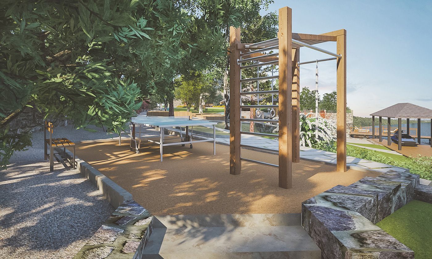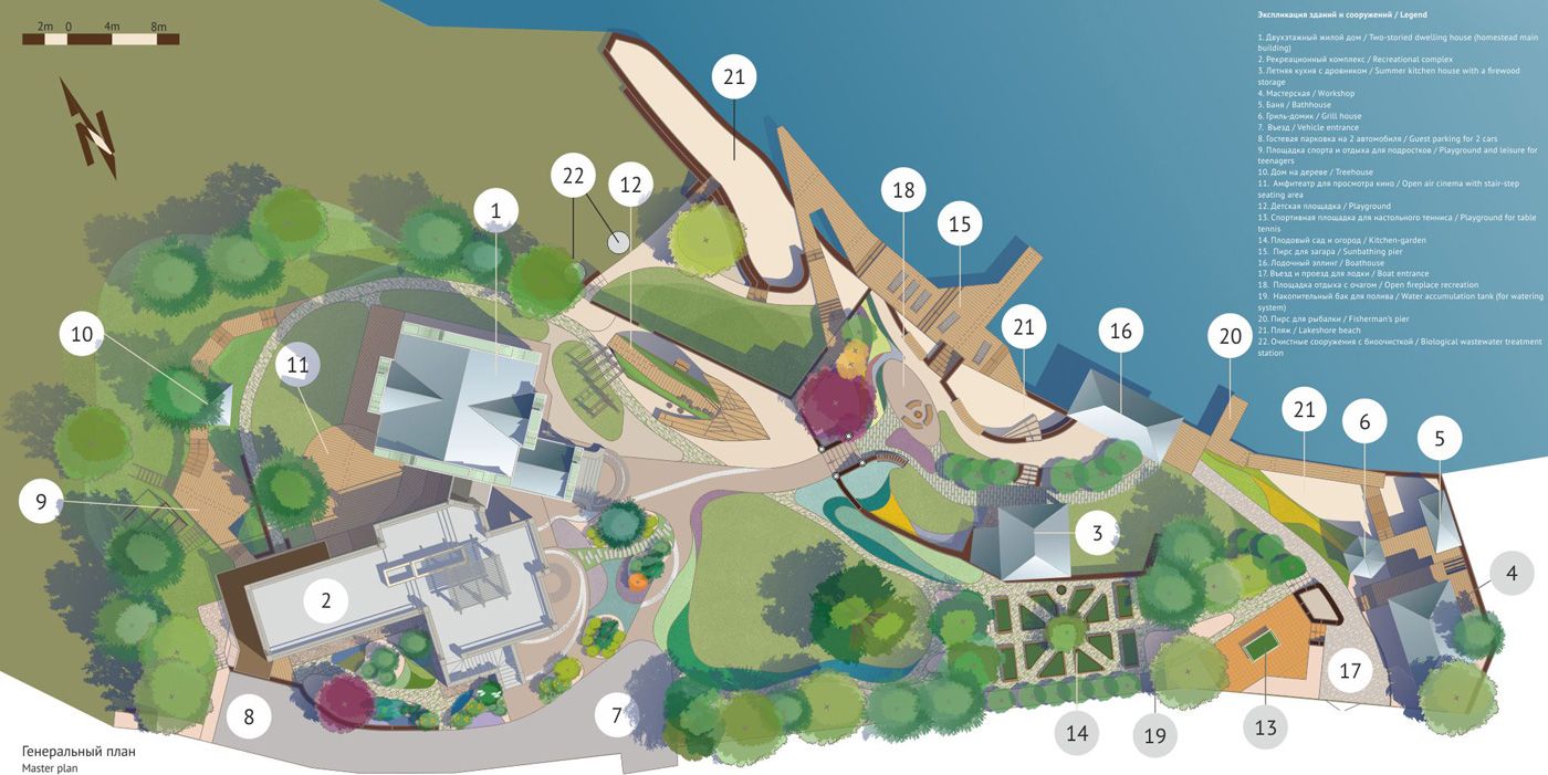 - разработана система всесезонного активного отдыха на территории усадьбы (пирс для рыбалки, настилы для купания и загара, эллинг для хранения лодки, открытый спортивный комплекс, мастерская);