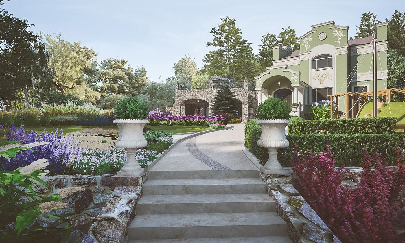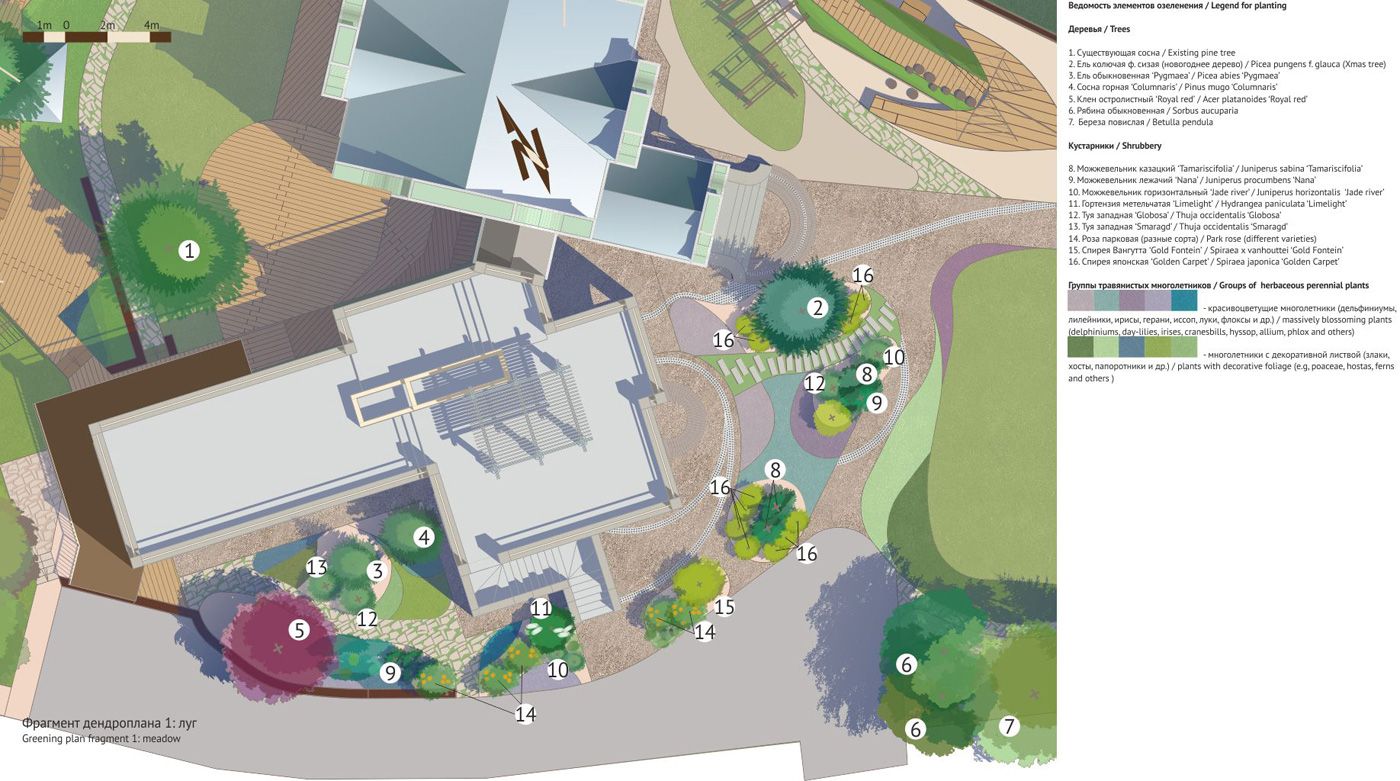 - участок разбит на несколько зон, для каждой из которых разработаны малые архитектурные формы, применен свой набор растений и покрытий;