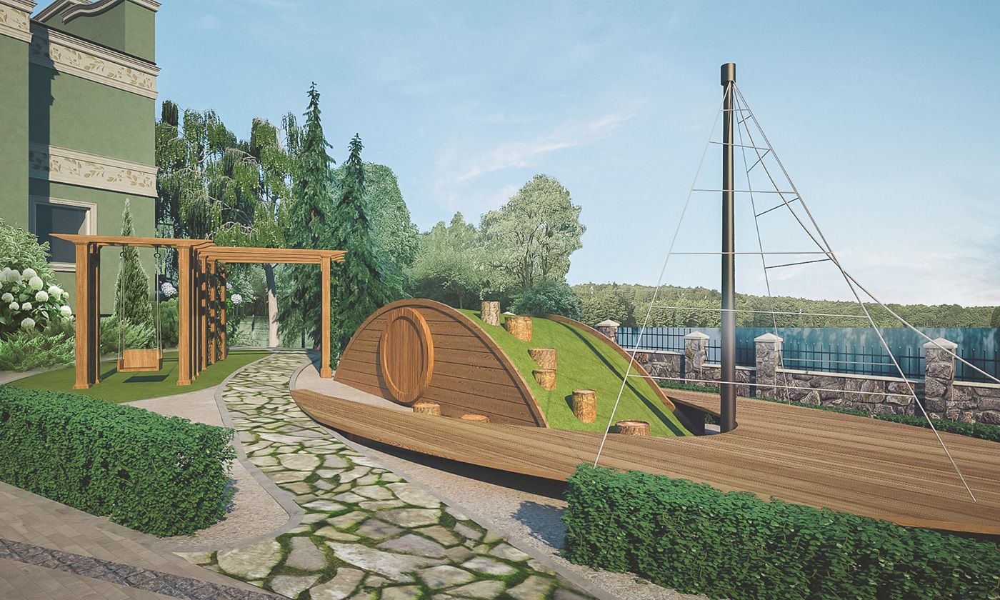 - на территории создается несколько детских площадок для разных возрастов с учетом изменения интересов детей в процессе взросления (игровая площадка — корабль, открытый кинотеатр — сцена, дом на дереве, спортивная площадка);