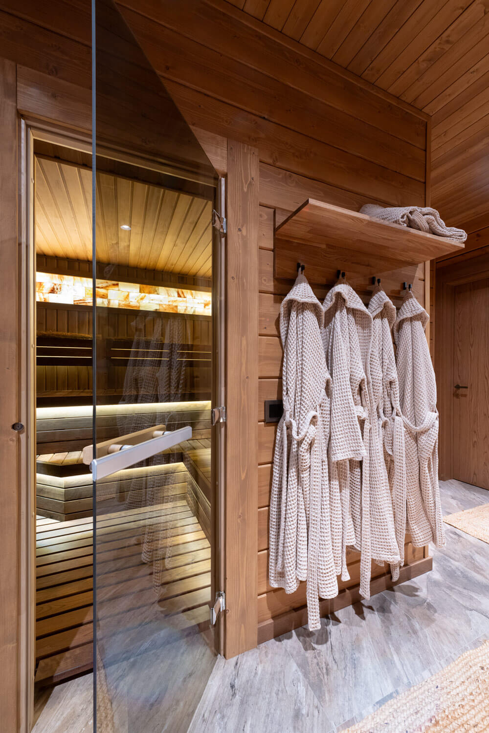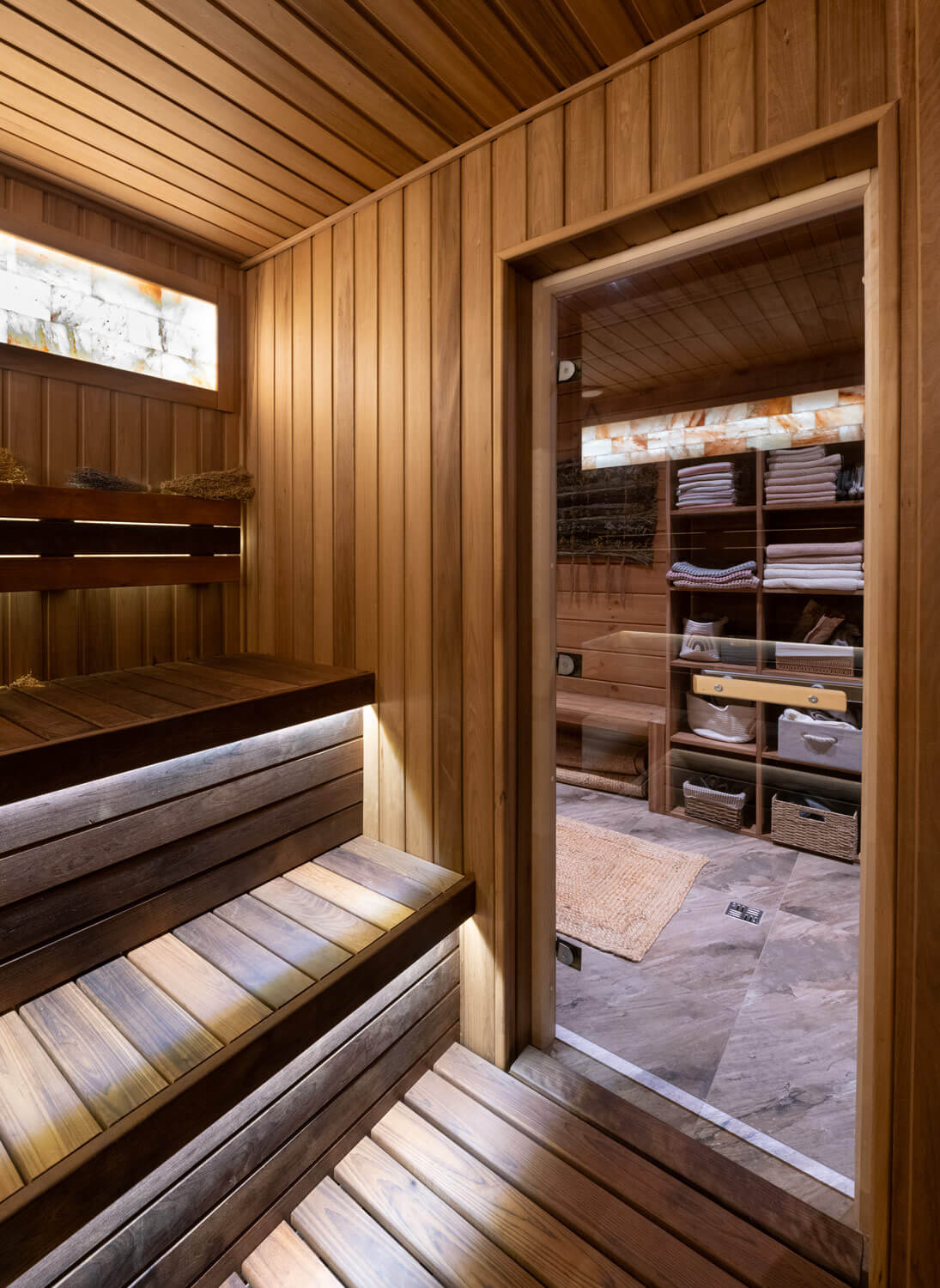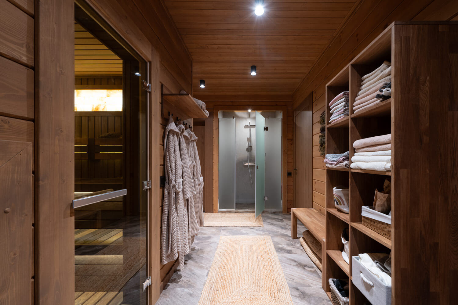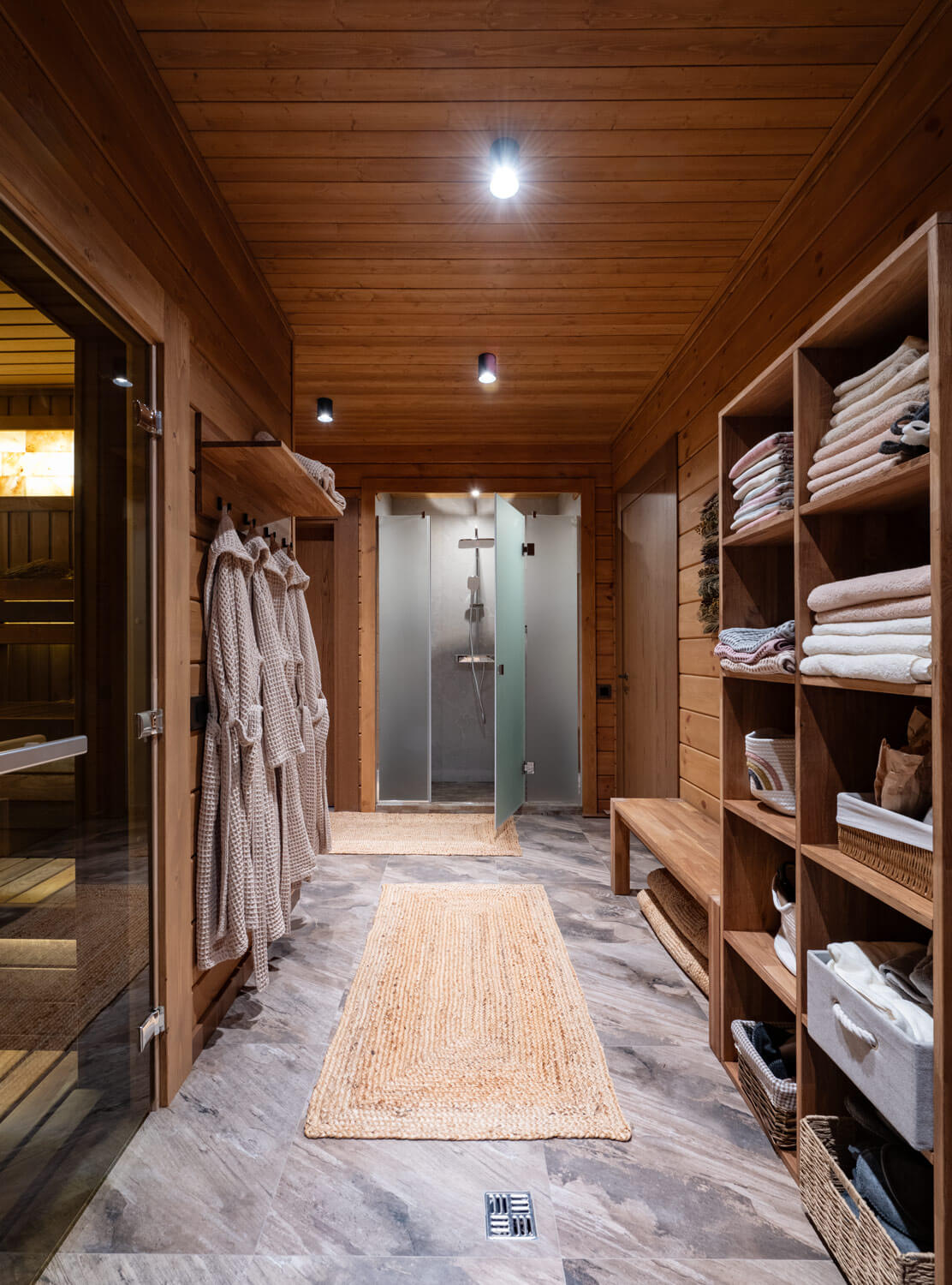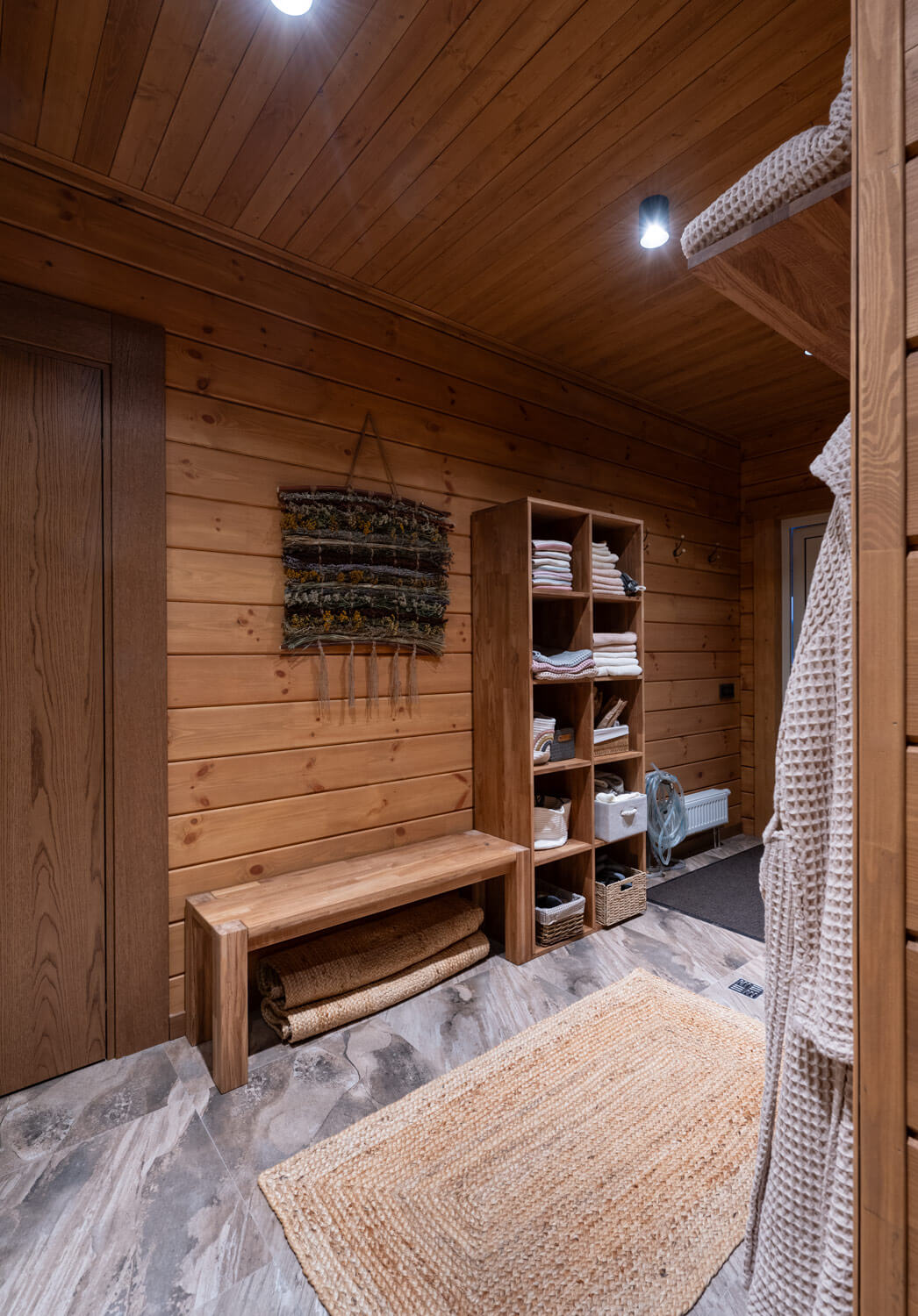 В отличие от других построек архитектурного ансамбля, в банном комплексе нет панорамных окон, освещение более спокойное, цветовое решение выдержано в цветах, максимально близких к натуральному цвету дубовой древесины. В интерьере царят минимализм, практичность и уют.
