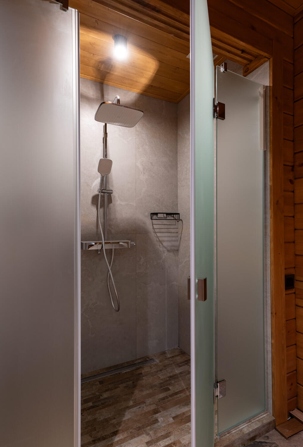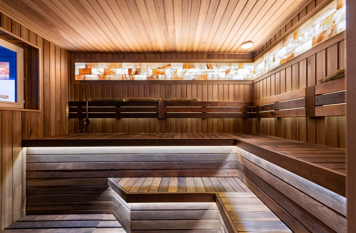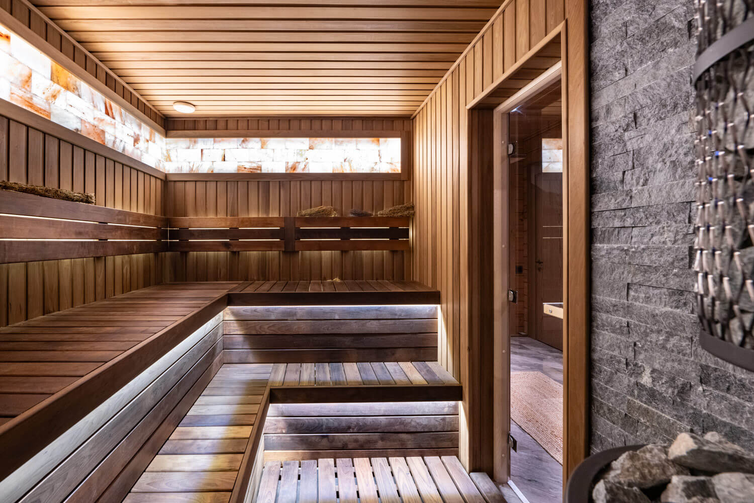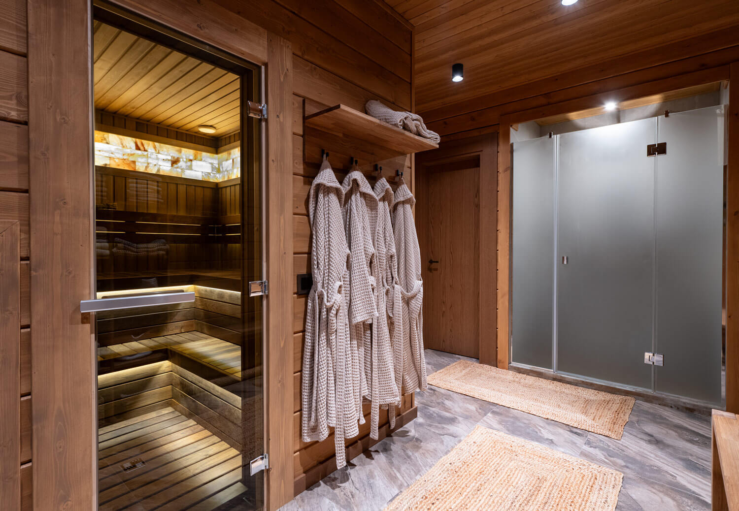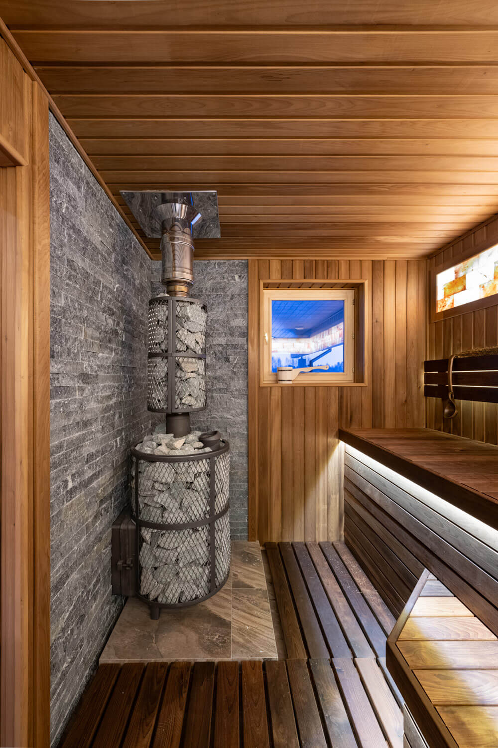 В отличие от других построек архитектурного ансамбля, в банном комплексе нет панорамных окон, освещение более спокойное, цветовое решение выдержано в цветах, максимально близких к натуральному цвету дубовой древесины. В интерьере царят минимализм, практичность и уют.