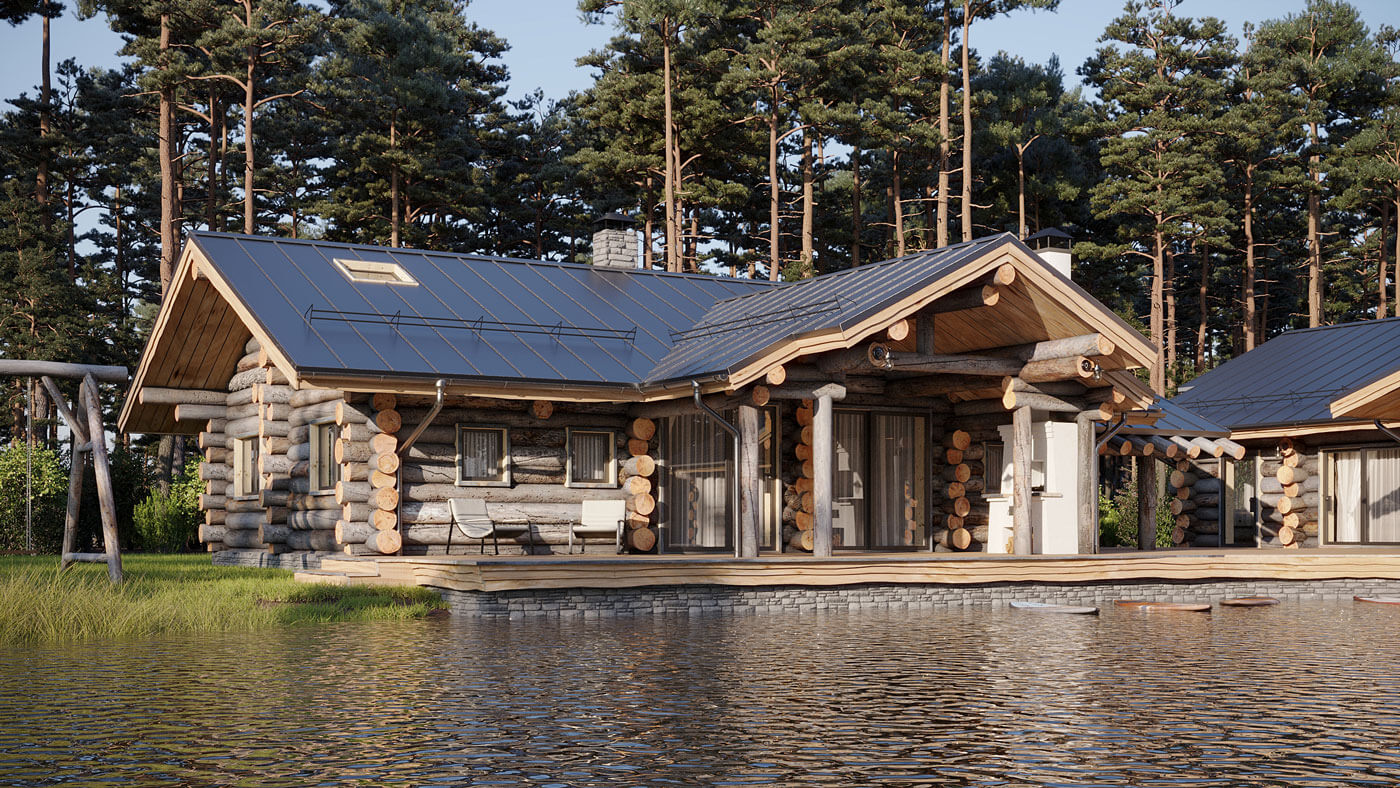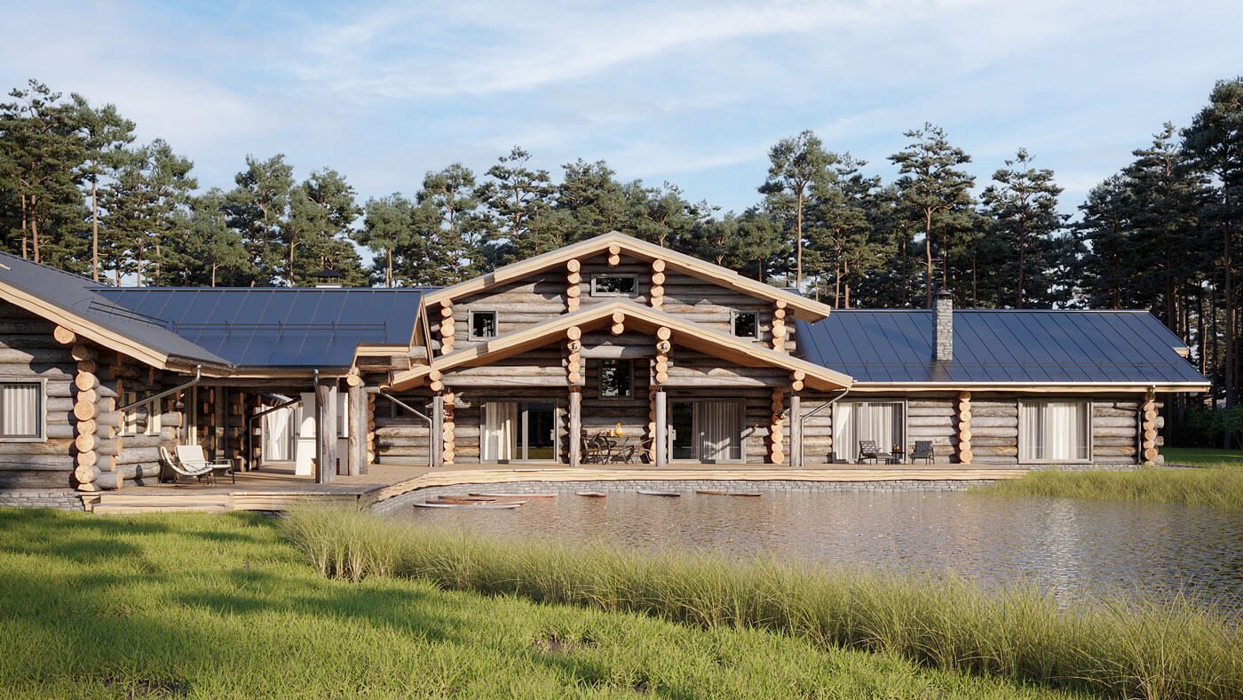 Усадьба спроектирована из сухостойной карельской сосны Кело — уникального природного строительного материала: экологически чистого, экстра прочного с высокой плотностью, обладающего неповторимыми текстурой, цветом и приятным естественным ароматом на весь период эксплуатации. В отделке усадьбы применены экологичные, природные материалы.