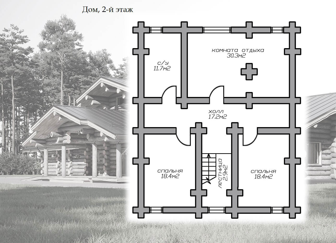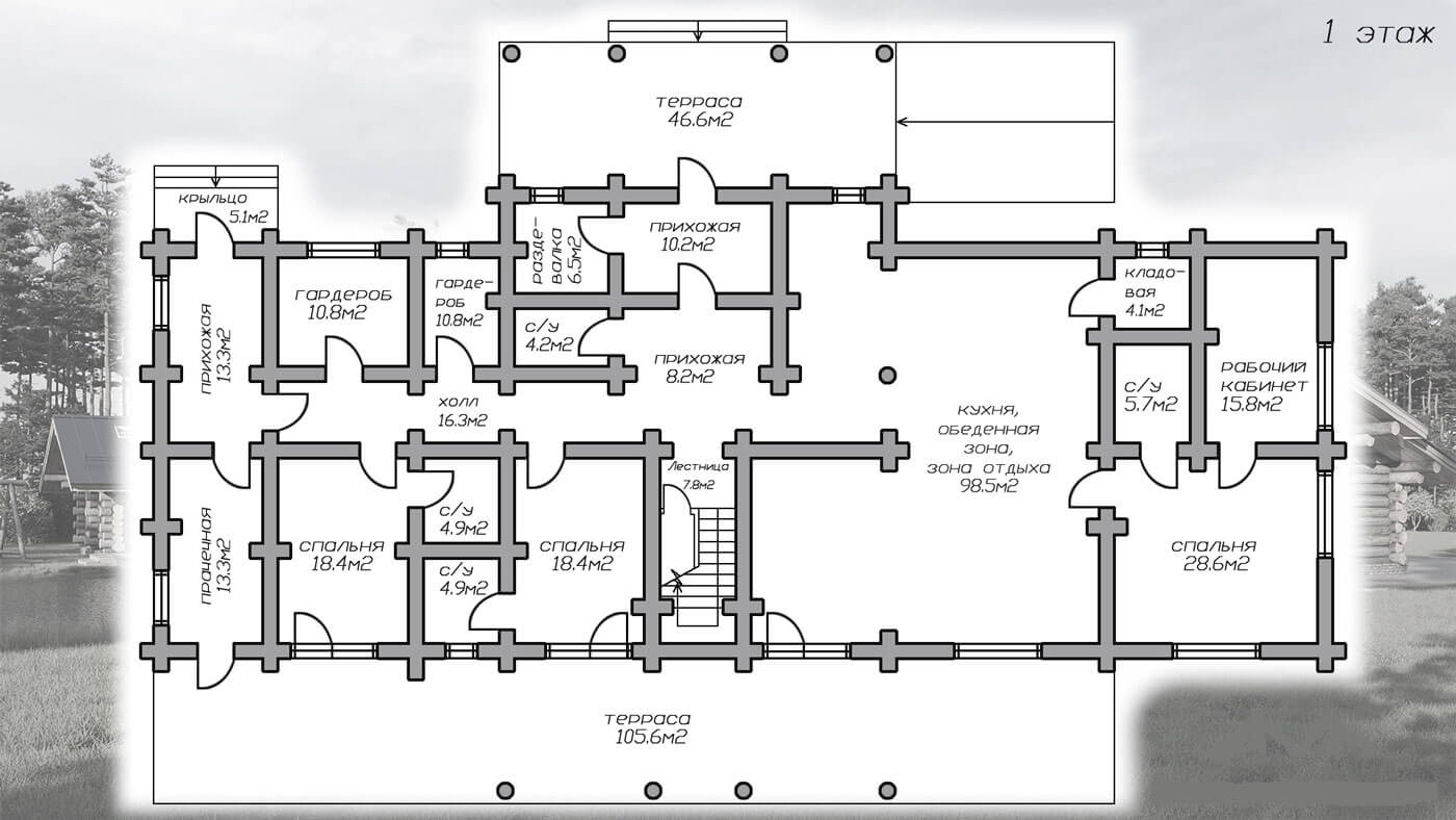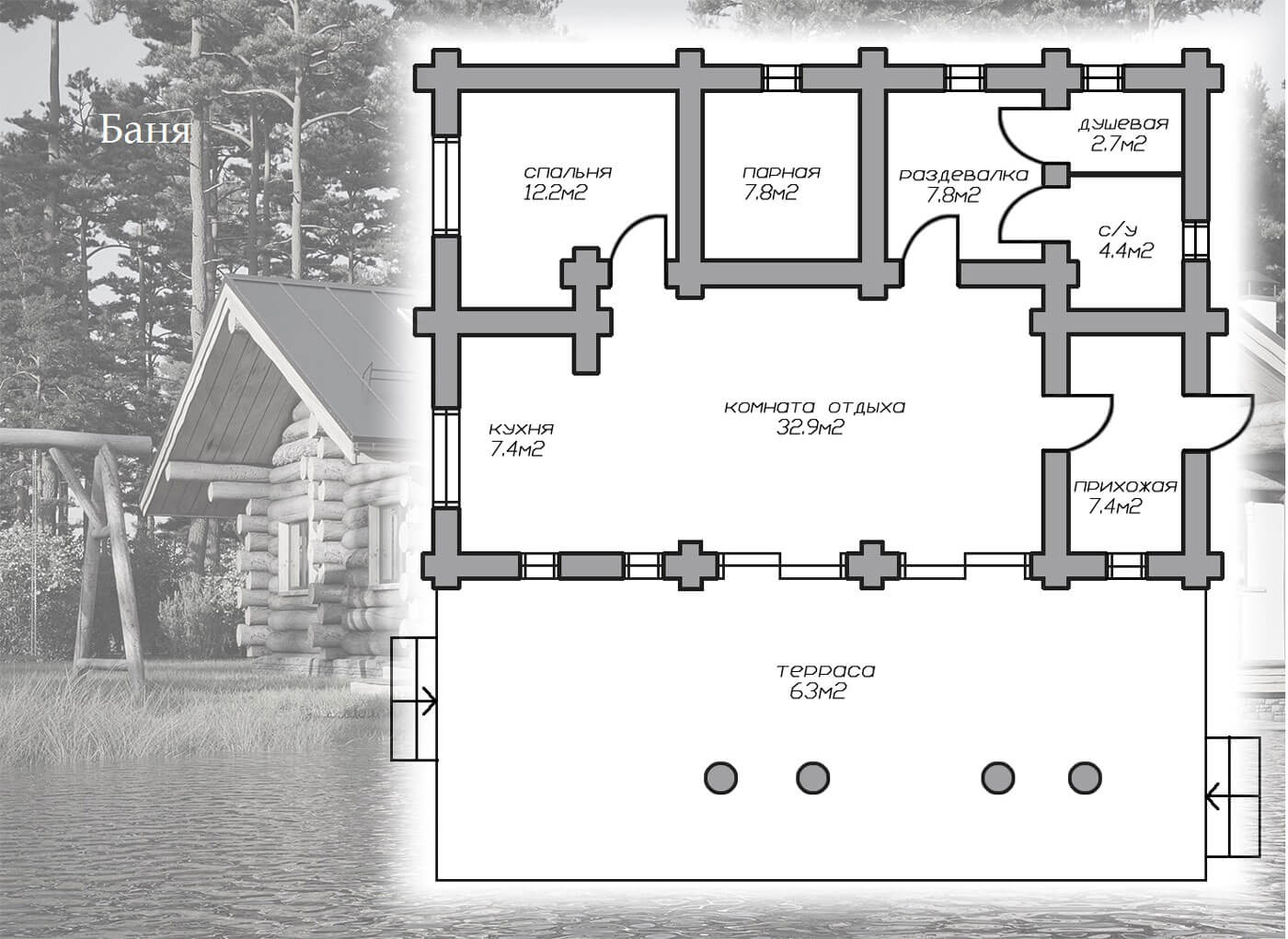 • стены — бревенчатые рубленые, диаметром 400 мм (KELO);