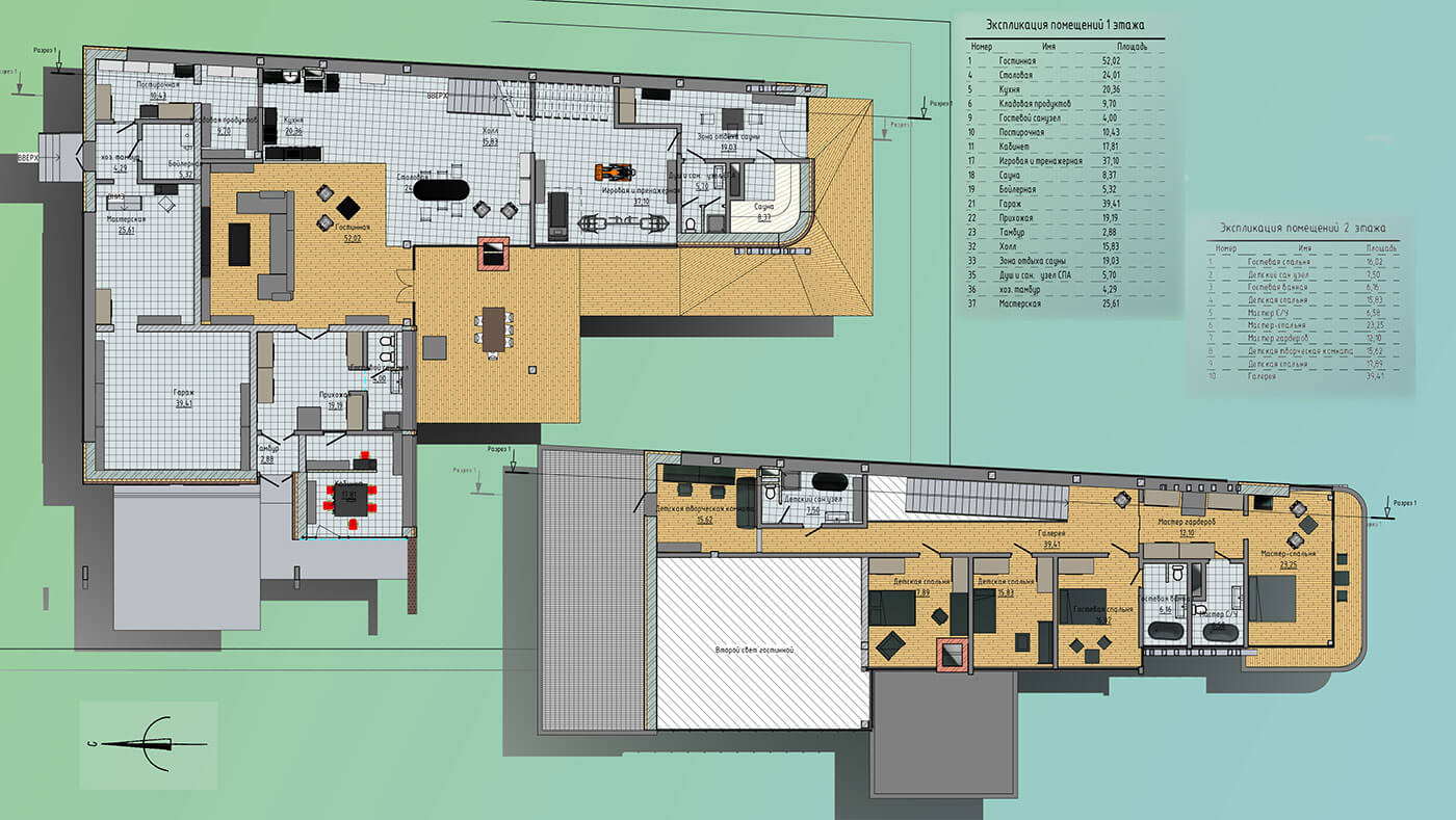 Основными планировочным развитием интерьеров дома является направление запад-восток. На восточный фасад фасад выходит помещения: гостиной, кухни-столовой, игровой комнаты, на первом этаже; а так же детские и гостевая спальни на втором этаже. С западного фасада осуществляется выход на крытую террасу, соединяющую застройку с садовым участком. Камин гостиной работает так же на открытую зону барбекю.
