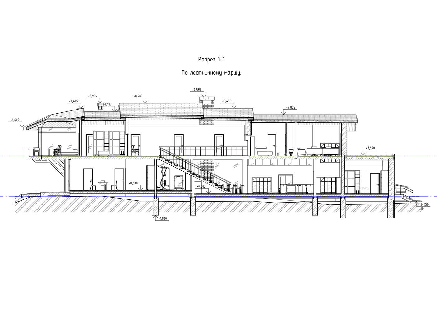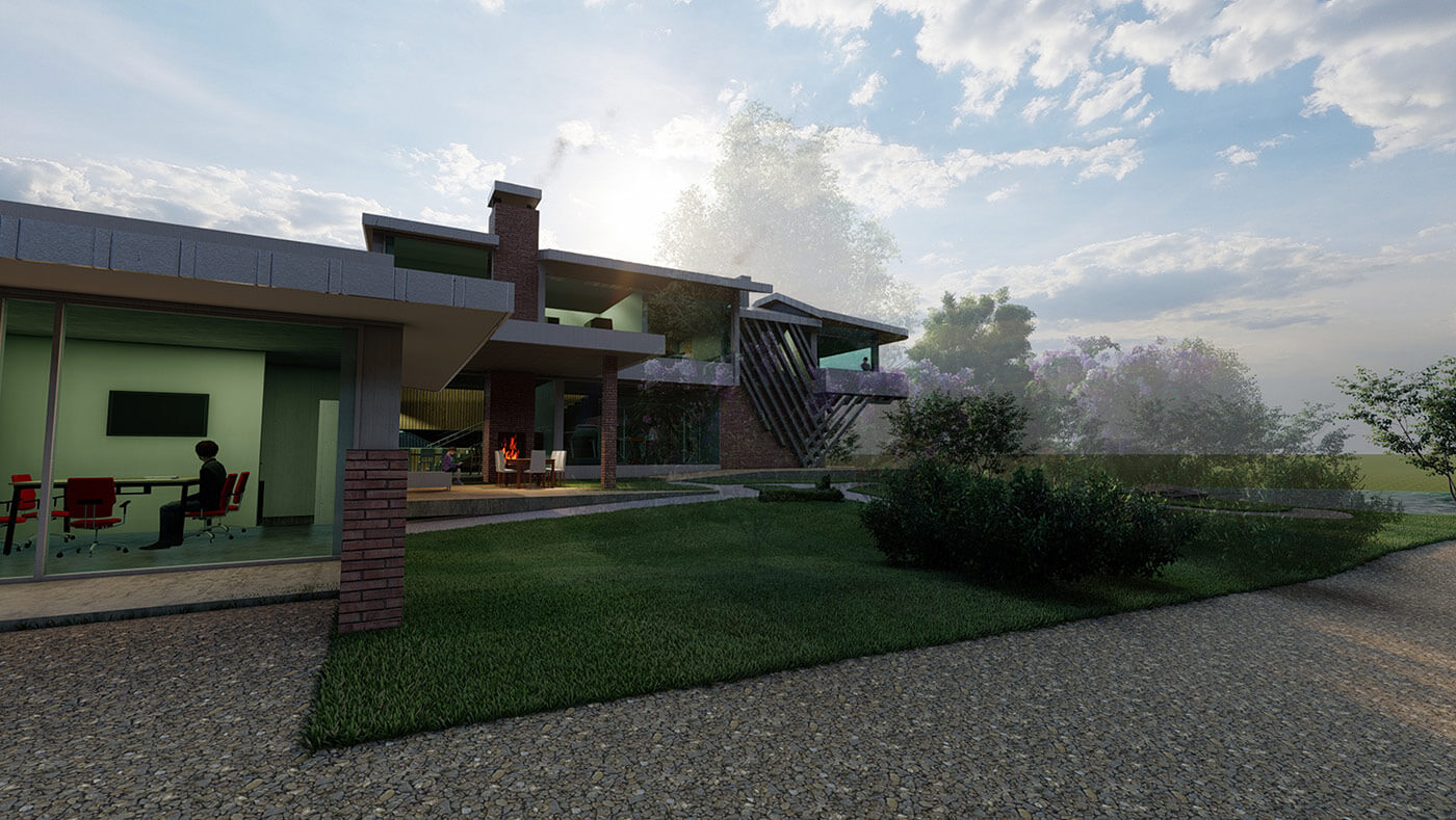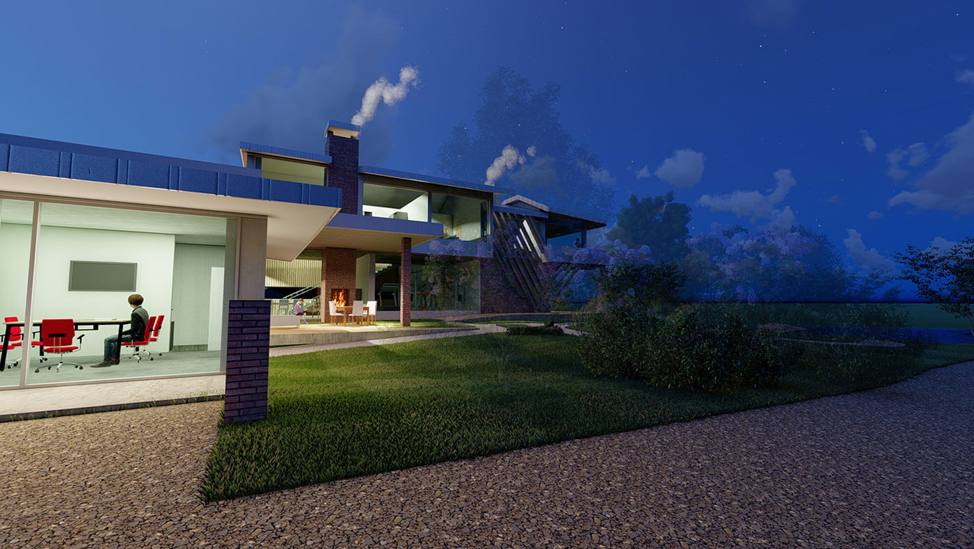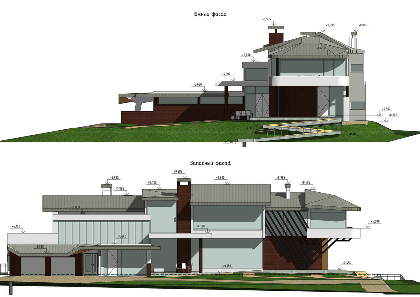 Конфигурация участка позволяет сформировать вытянутый –«каскадный» план застройки. Чт позволяет удачно выйти южным фасадом на существующий водоем. Сюда выведены помещения отдыха ( 1 Этаж) и мастер-спальня ( 2 этаж). Вид из интерьера на водоем, который в этом направлении распространяется примерно на 100 метров, создает уникальные виды для летнего времени года.