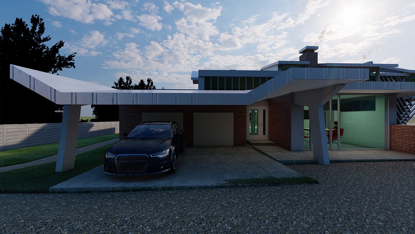 С западной стороны также осуществляется загрузка всего здания. Здесь проходит основной проезд к садовому участку. На западный фасад выходит крытый гараж, который является частью дома, а также гостевая автомобильная стоянка под навесом.