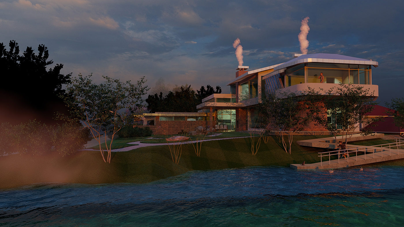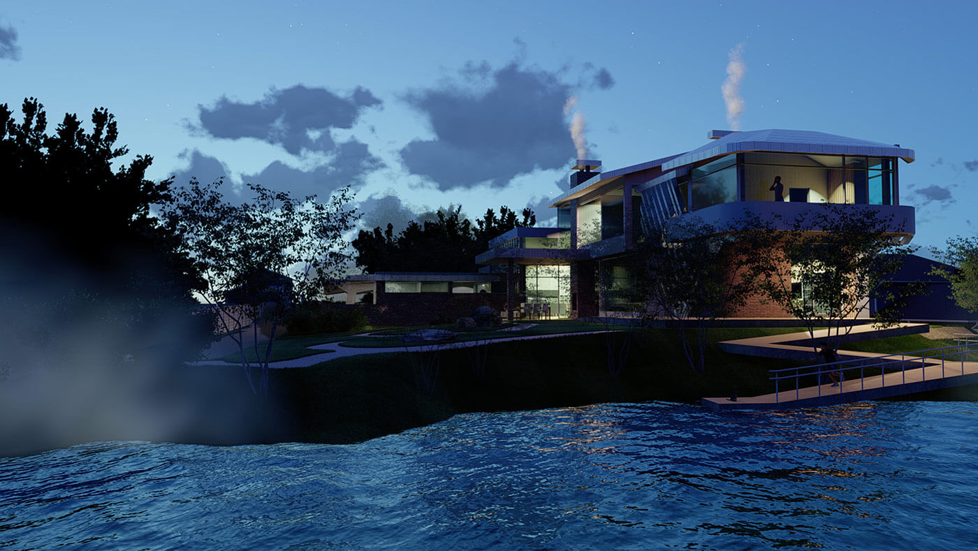Водоем позволяет утреннему солнцу проникать в главные комнаты дома и подсвечивать его южный фасад отражениями от воды. Выход участка на водоем позволяет использовать его прибрежную часть в качестве дополнительной декоративной и рекреационной функции «на воде».