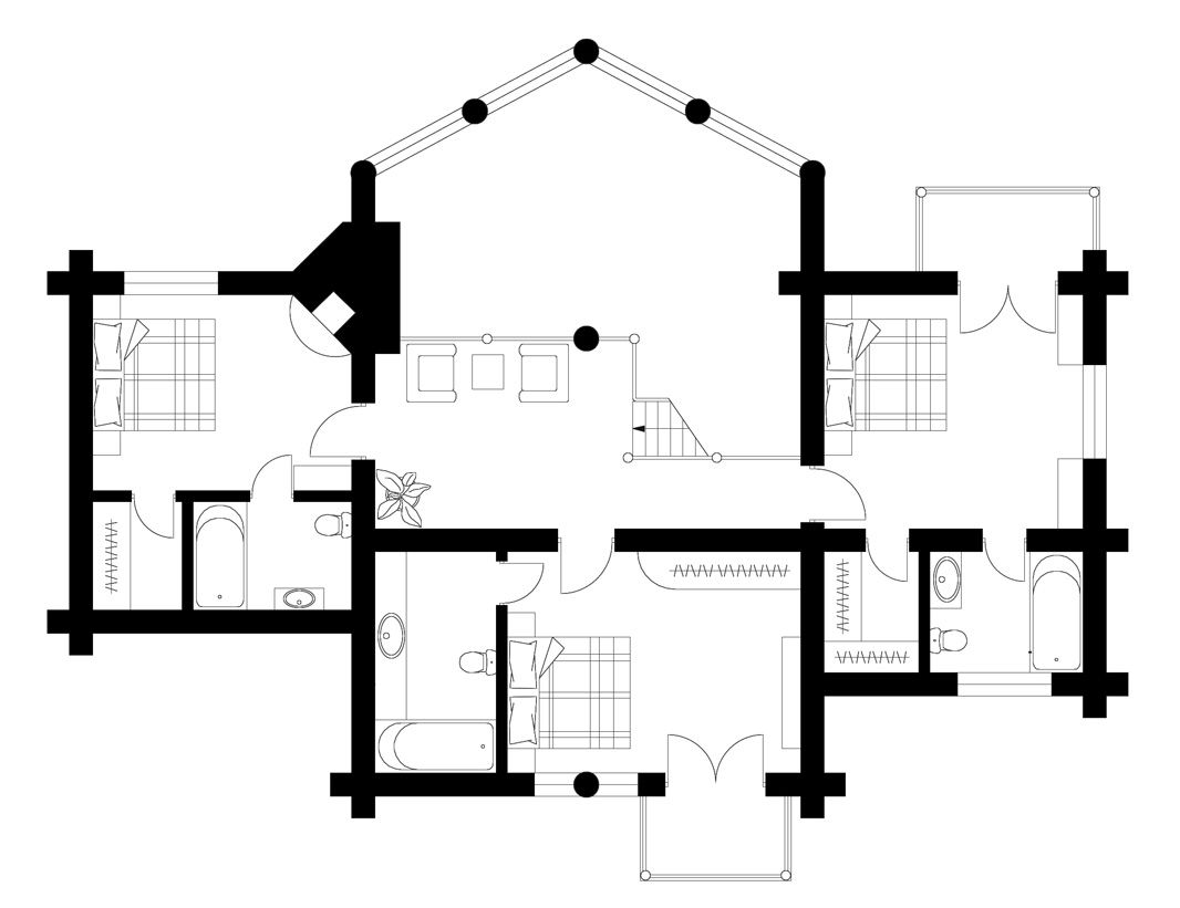 На втором этаже — три спальни с ванными и гардеробными. Холл с балконом с видом вниз, на гостиную, является связующим центром композиции. На балконе можно вольготно расположиться за чтением любимой книги или за приятной беседой. В спальне хозяина также есть балкон.