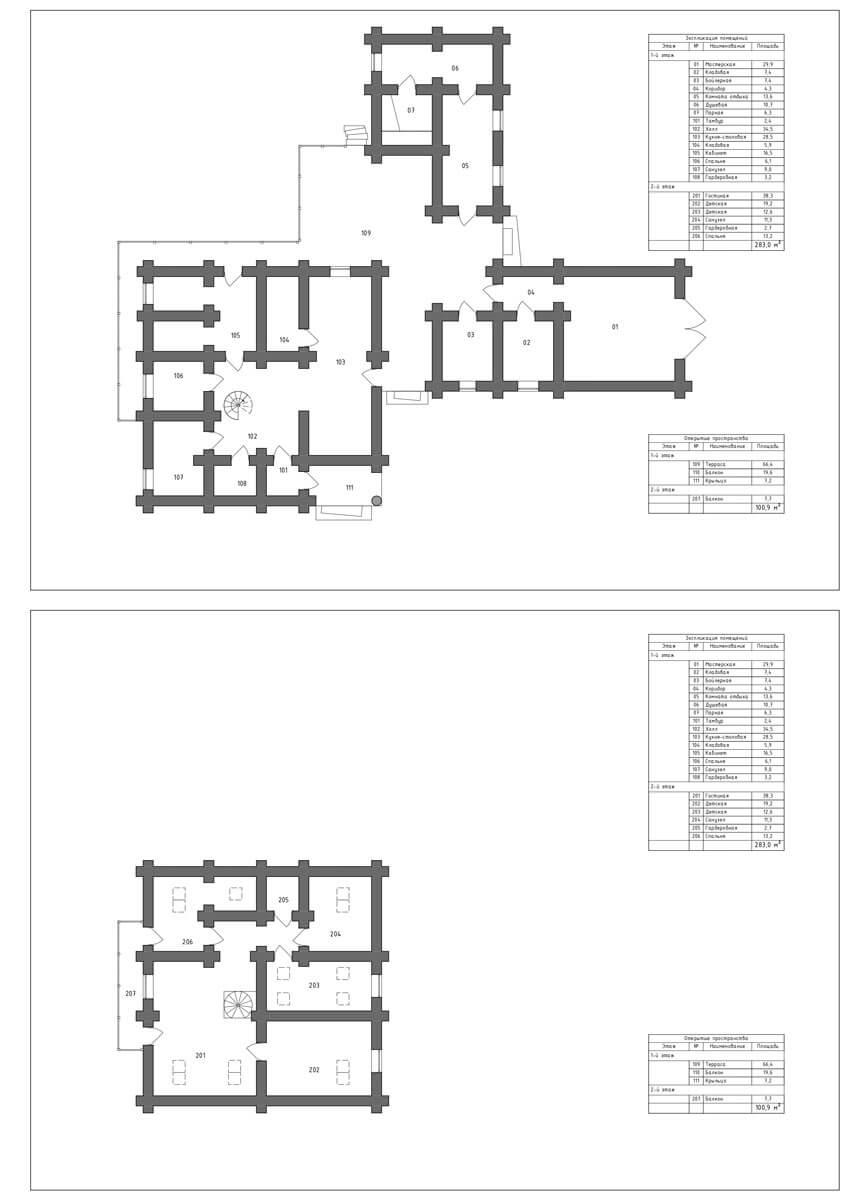 Усадьба представляет собой конструкцию из бревен диаметром от 500до 600мм. Основной дом с мансардным этажом, высота потолка 2,5 м, баня и мастерская одноэтажные постройки с высотой потолка 4м.Общая площадь комплекса – 570 кв. м.