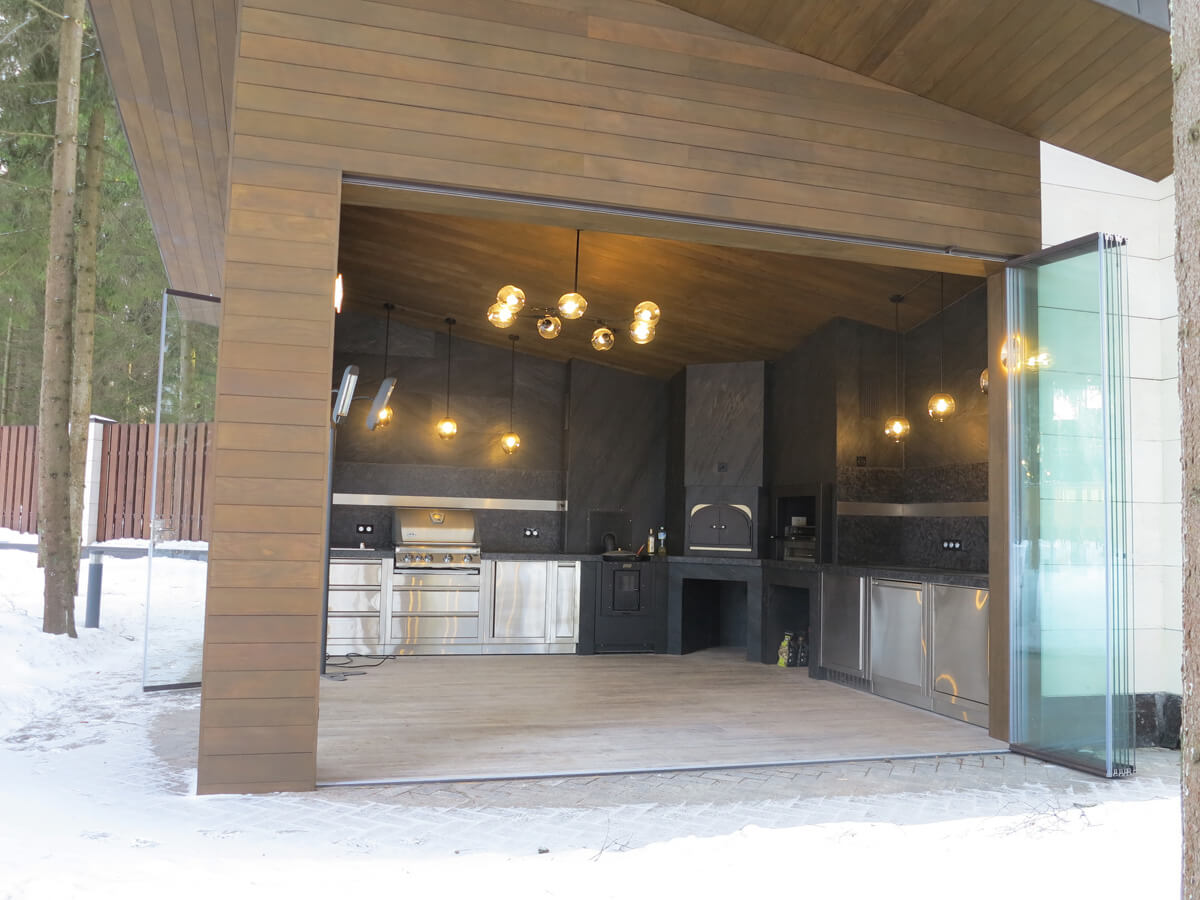 Главное его достоинство заключается в возможности эксплуатировать зону барбекю в любое время года. Электрический теплый пол позволяет поддерживать комфортную температуру в павильоне.