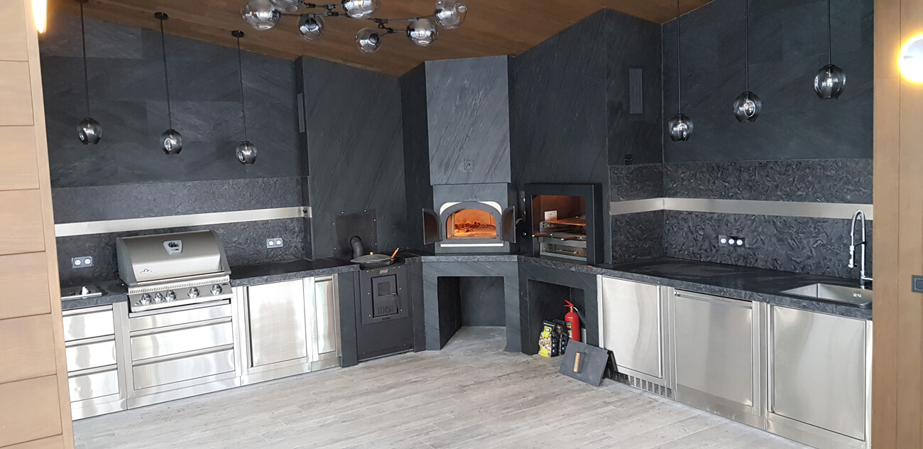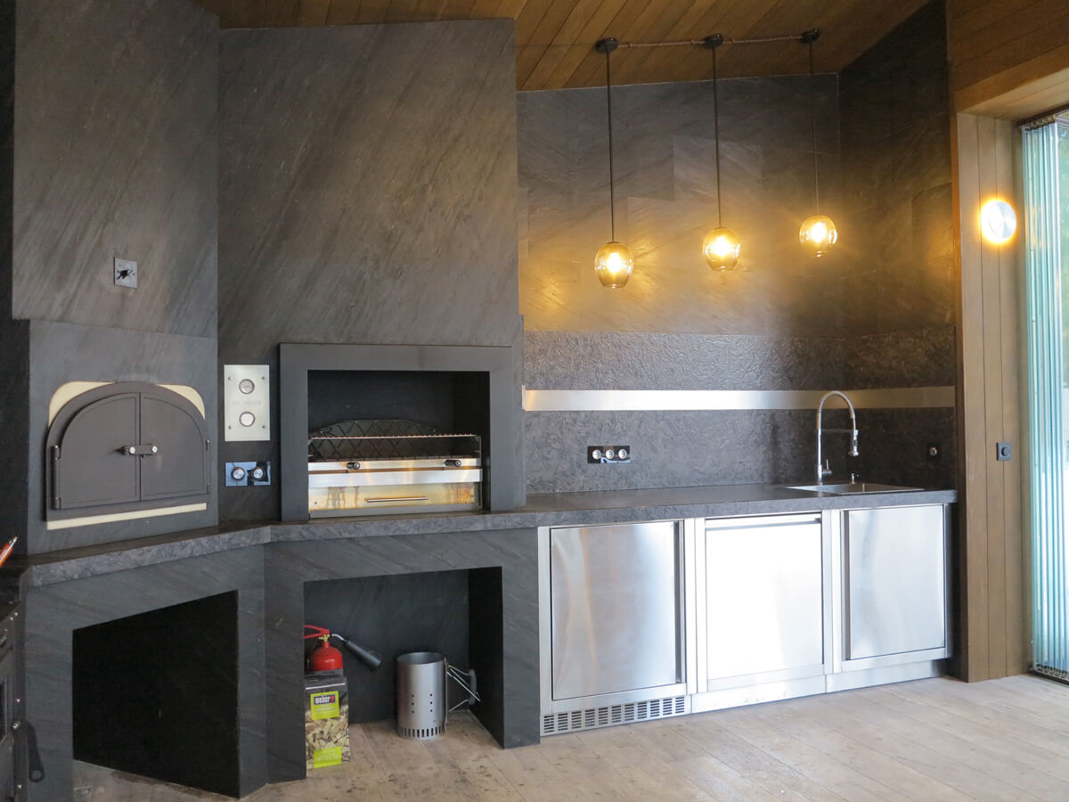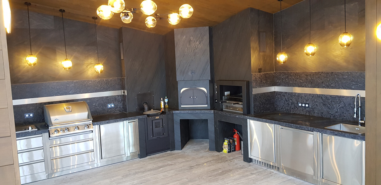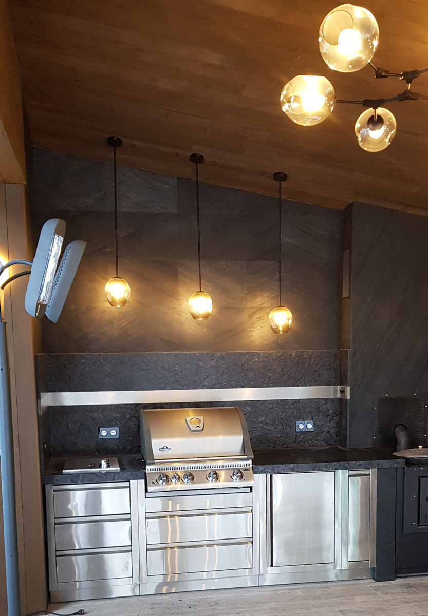 С целью максимально уберечь зону отдыха с барбекю-комплексом от возникновения случайного возгорания из-за искры, пол и стены облицованы негорючими материалами. Пол выполнен из керамогранита, столешница и фартук — из натурального камня, стены облицованы натуральным каменным шпоном Slim Stone.