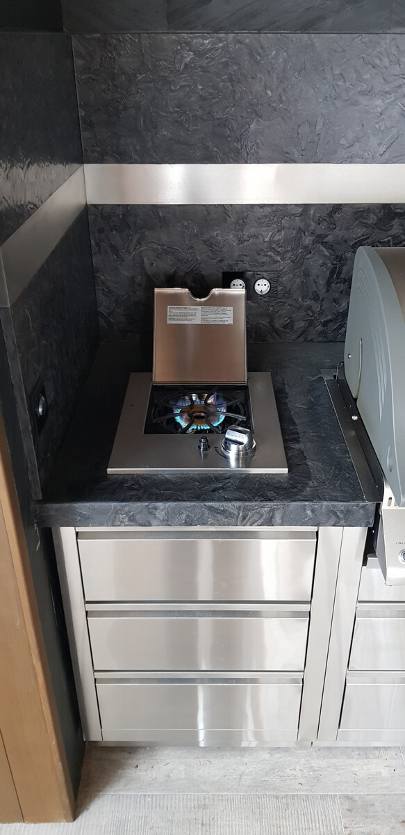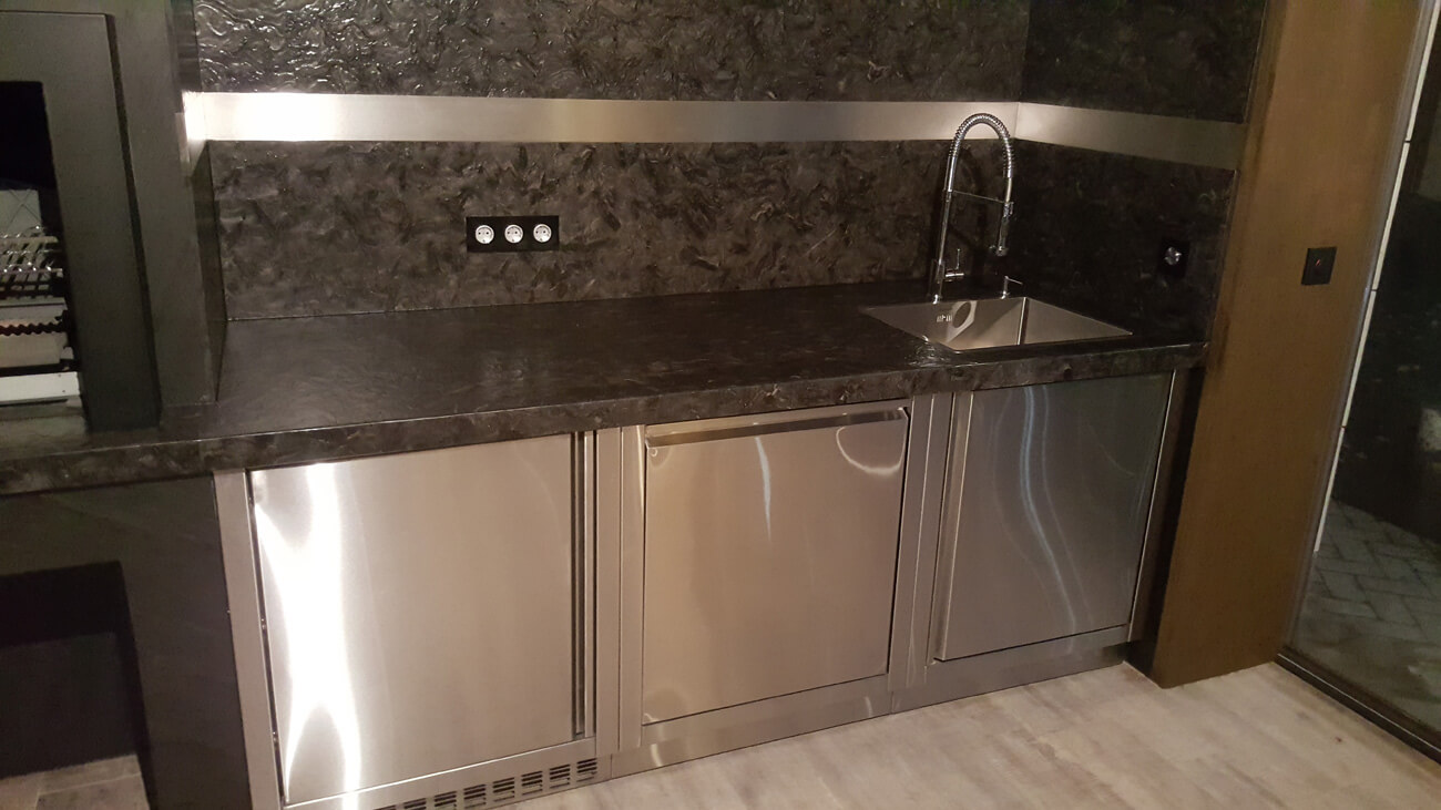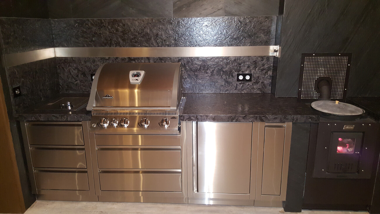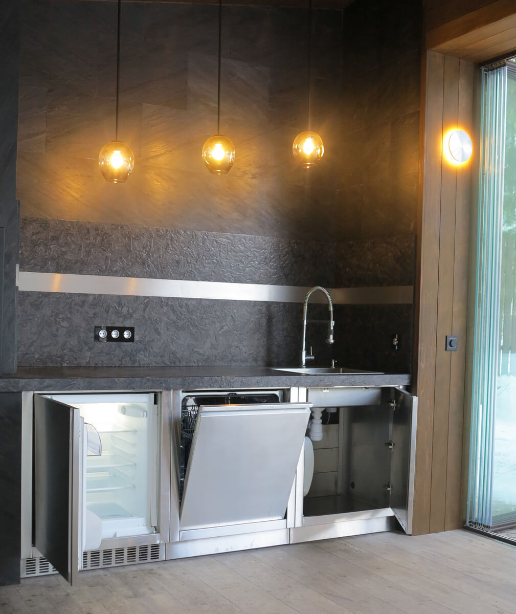 С целью максимально уберечь зону отдыха с барбекю-комплексом от возникновения случайного возгорания из-за искры, пол и стены облицованы негорючими материалами. Пол выполнен из керамогранита, столешница и фартук — из натурального камня, стены облицованы натуральным каменным шпоном Slim Stone.
