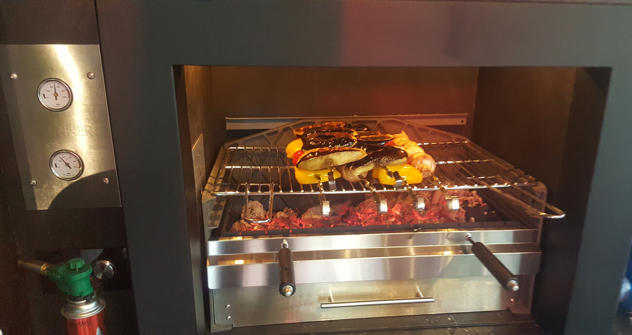 Мангал представляет собой стальную топку MILAFIRE из 10 мм стали с вмонтированным бесшумным электрическим приводом вертела BRUNNER, топка может использоваться и как камин и как мангал или гриль, для этого дополнительно установили чугунный угольный гриль Invicta Alexandrie.
