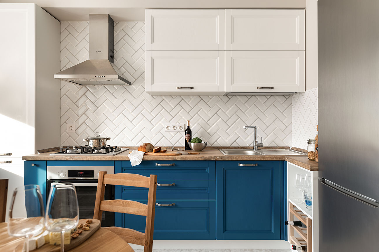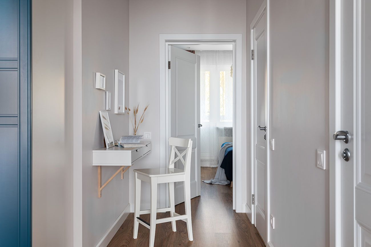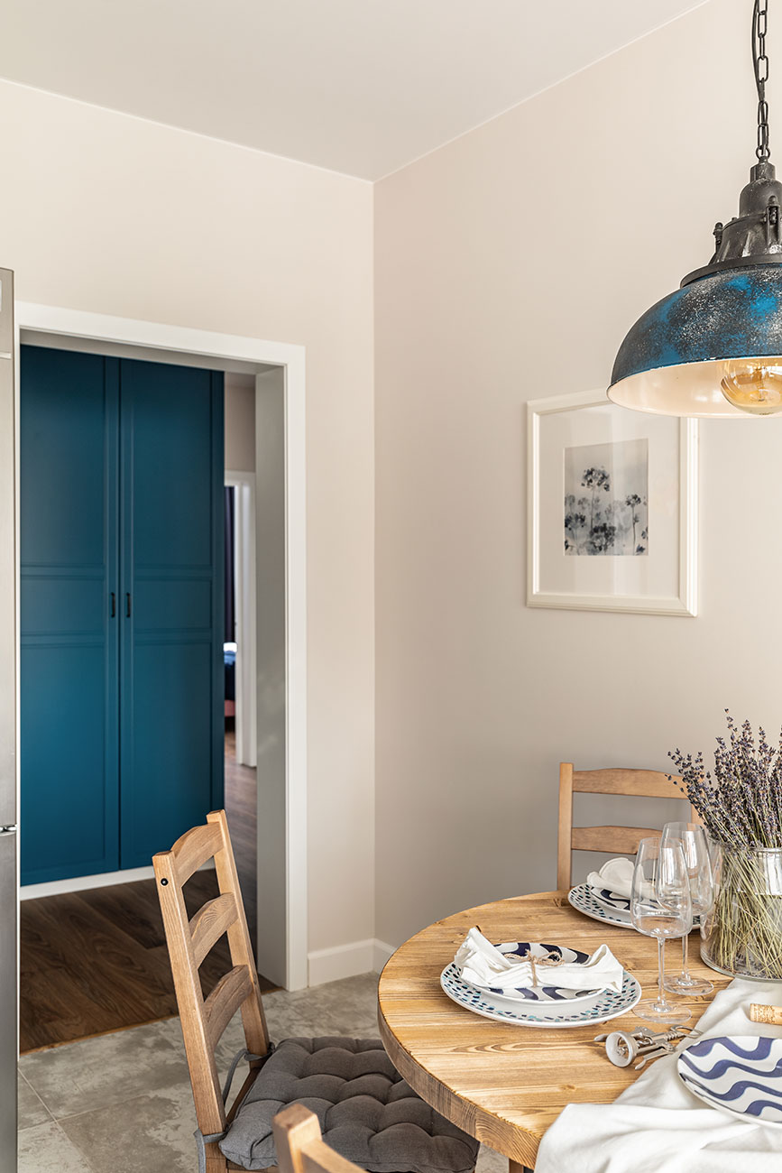 Прихожая-холл — связующее звено между всеми комнатами. Цветовое решение шкафа для хранения сезонной одежды и обуви выбрано не только для создания единого ансамбля с кухней, этот элемент отражает стиль квартиры.