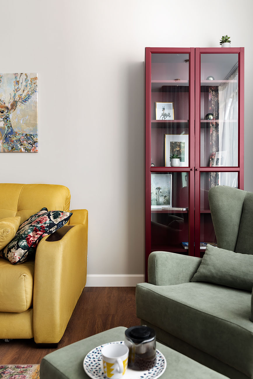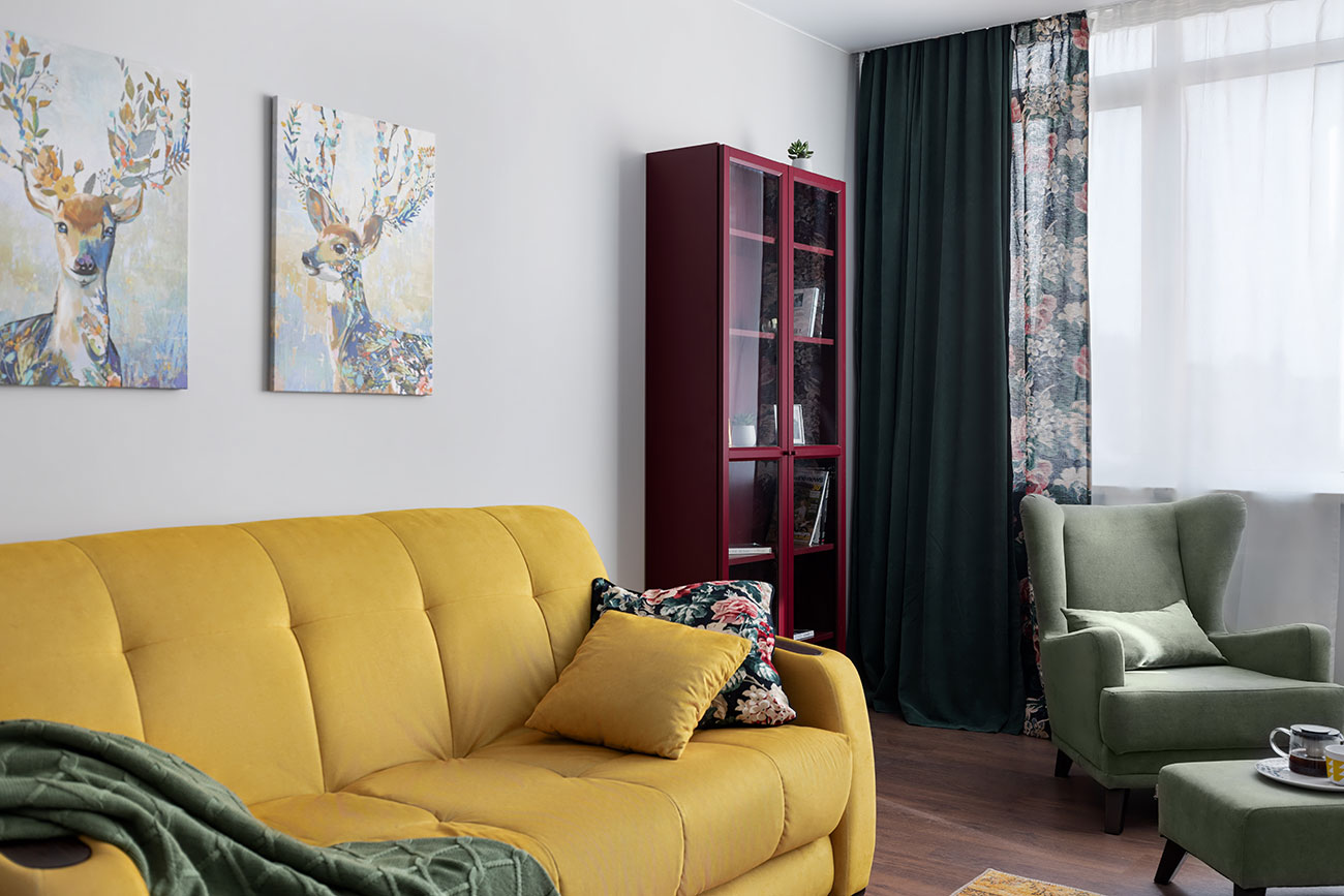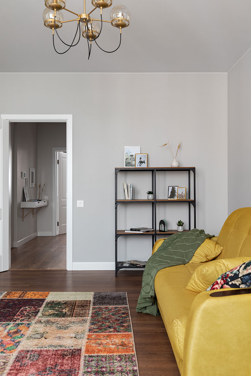 Так как с этим заказчиком проект был не первым, задание было коротким: выполнить квартиру с цветными акцентами в нестрогом современном стиле и вписать в него желтый диван. Также мы ограничились бюджетом до одного млн руб.