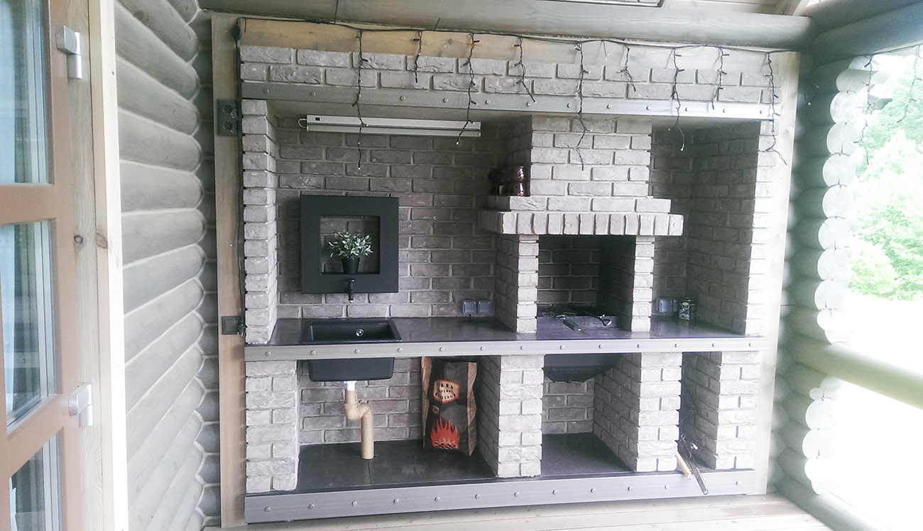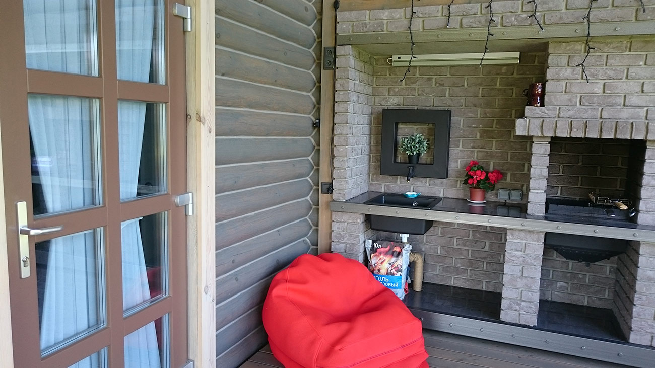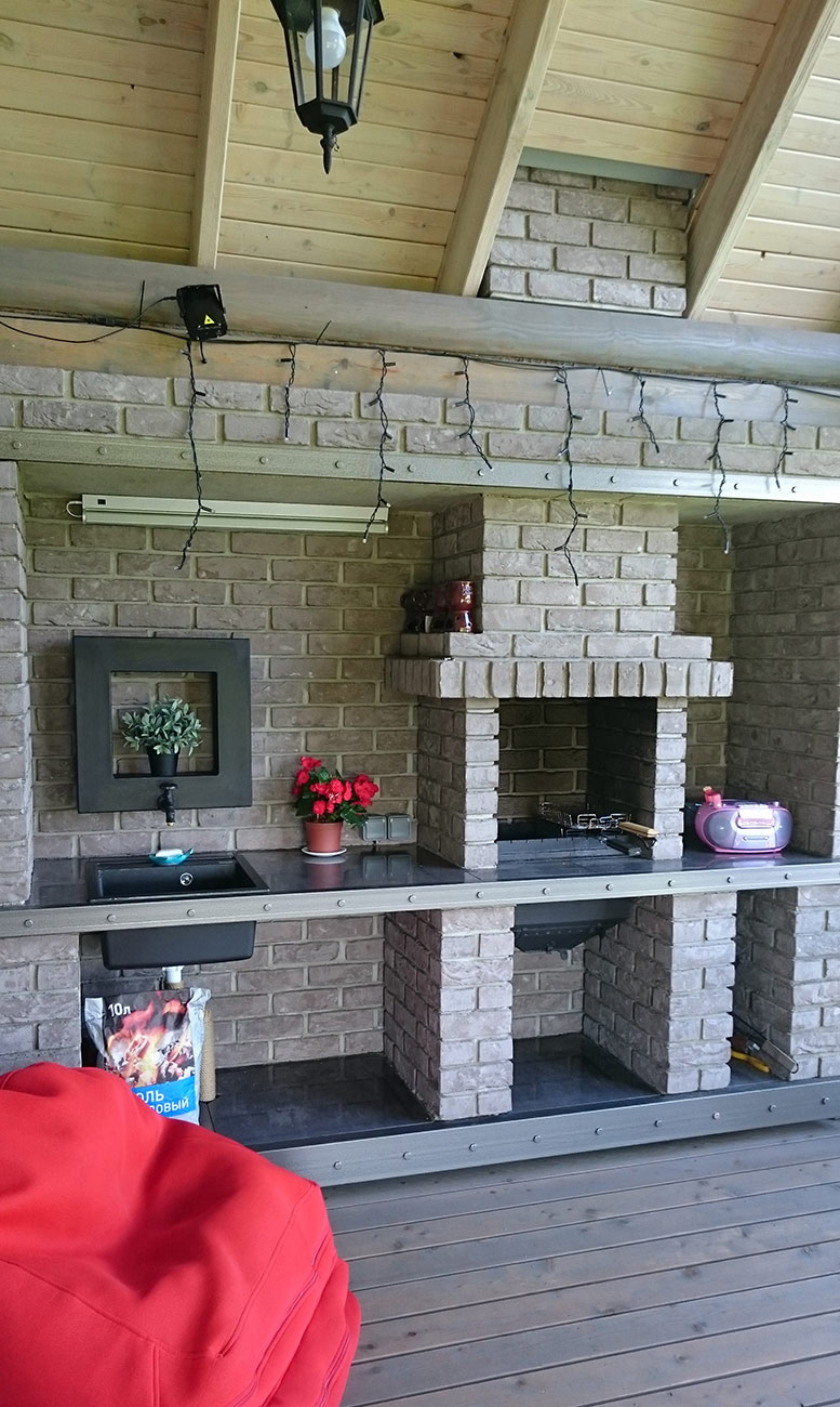 Зона барбекю на даче напоминает совмещенную кухню и столовую, оснащенную очагом для приготовления пищи, с комфортной мебелью. Барбекю оборудована дополнительными элементами для максимального удобства. К ним относятся полочки для хранения, отделение для дров и сеток, мойка, рукомойник и рабочая поверхность.